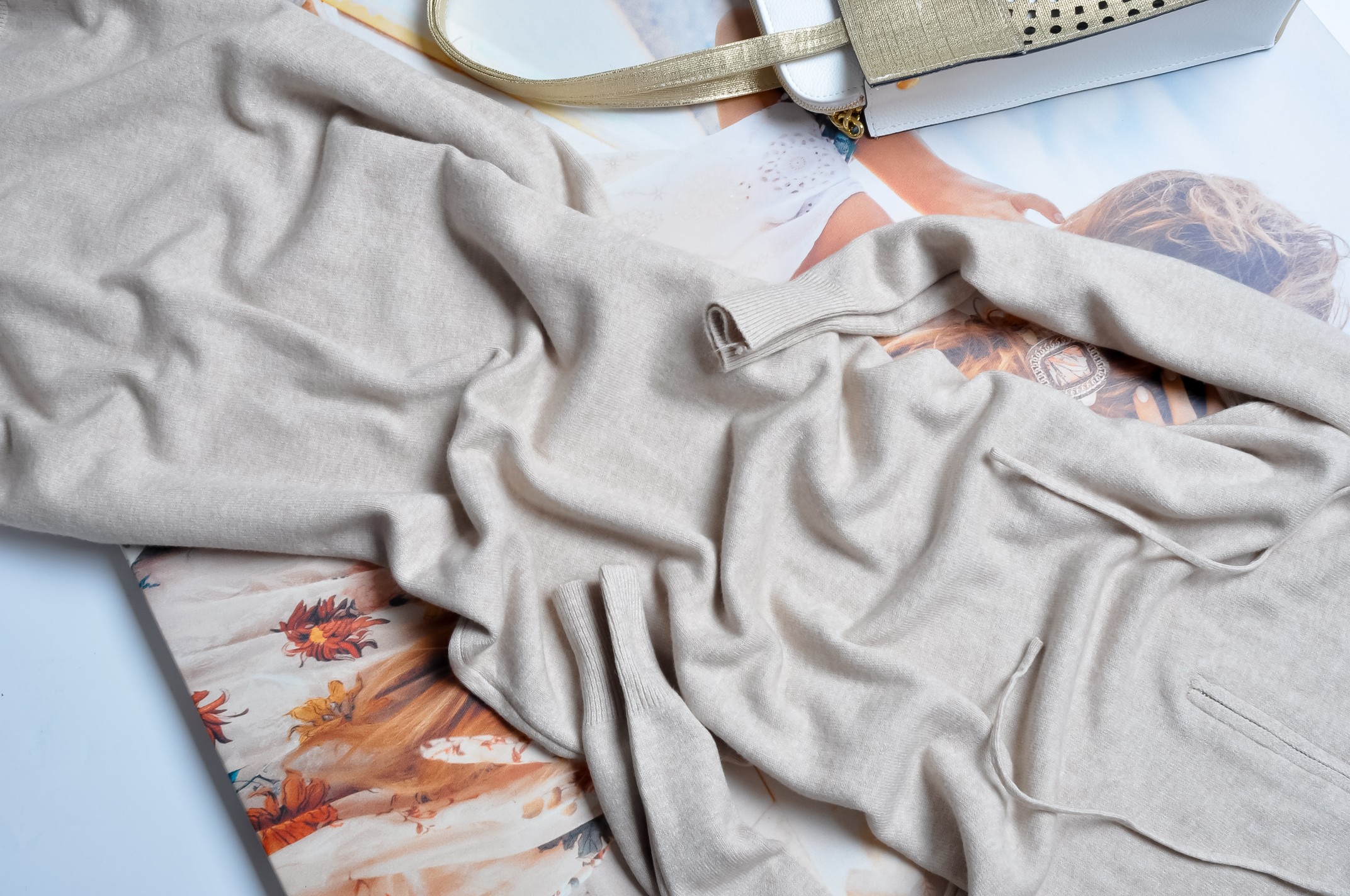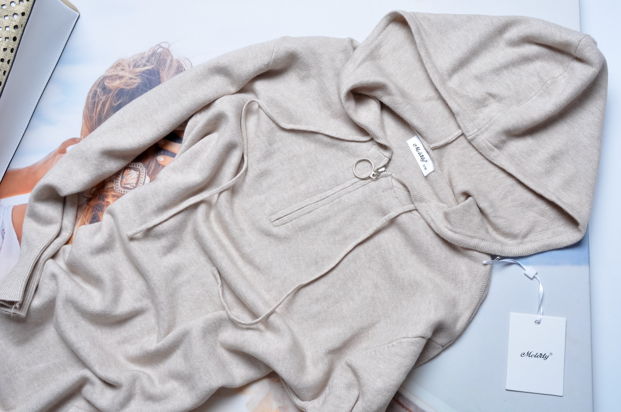 Śliczna sukienka w beżowym kolorze. Wkładana przez głowę. Dekolt zapinany na zameczek. Rękawy długie. Fason oversize, nieprzylegający. Wykończona kapturem z tyłu.