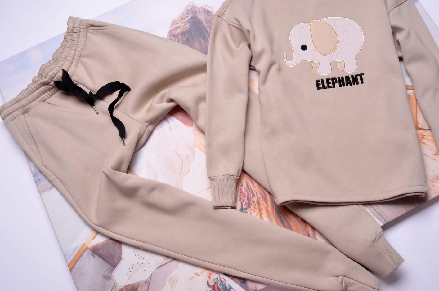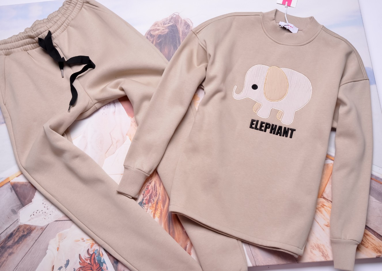 Dwuczęściowy dres składający się z bluzy i spodni w kolorze beżowym.