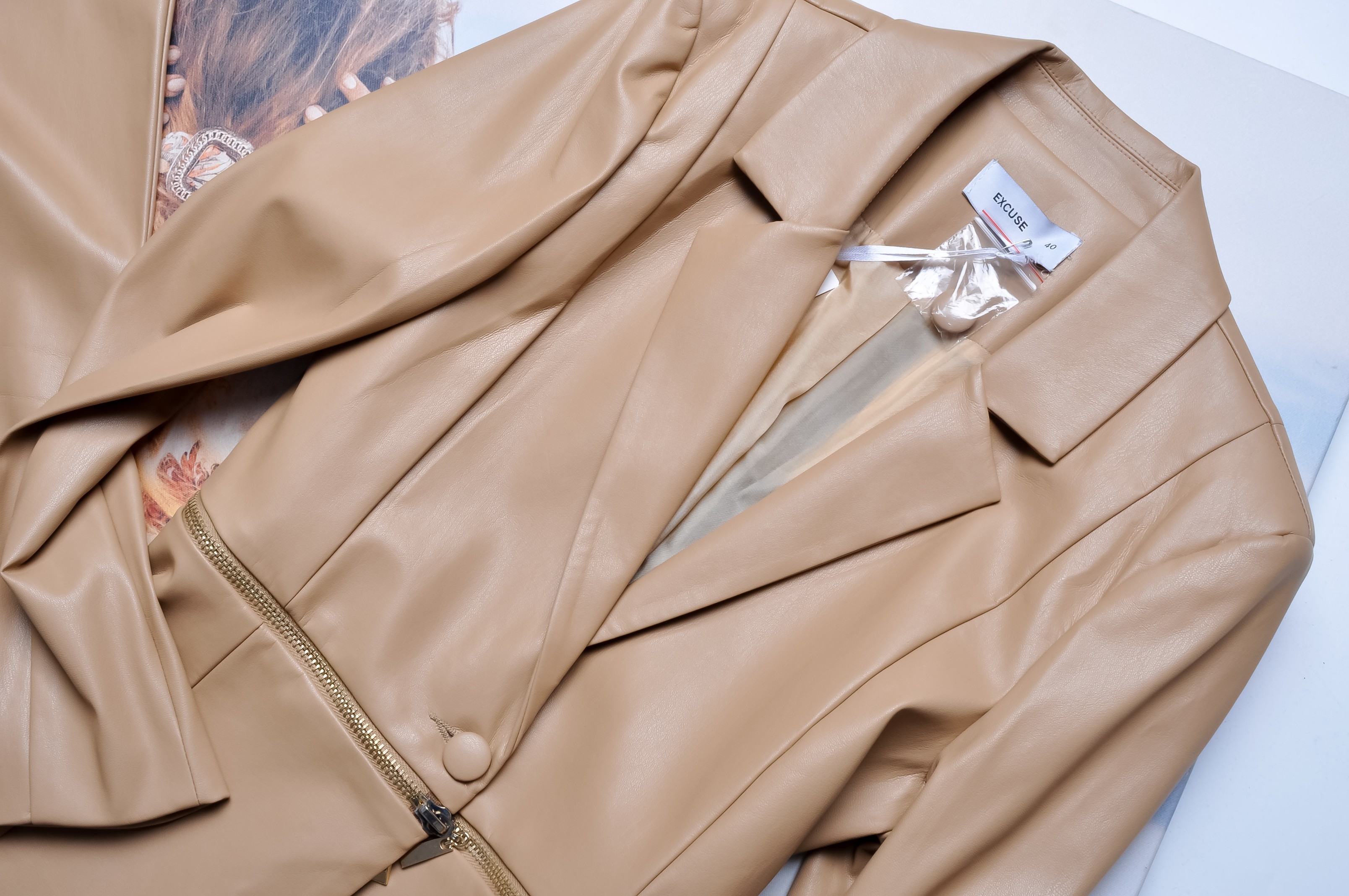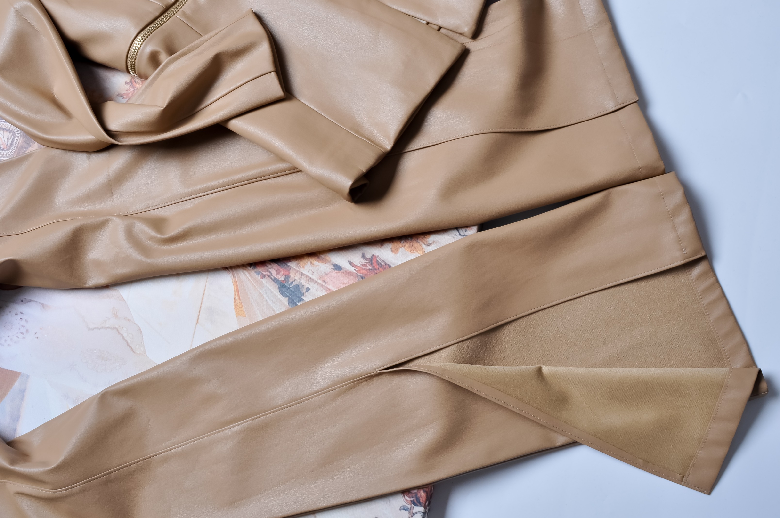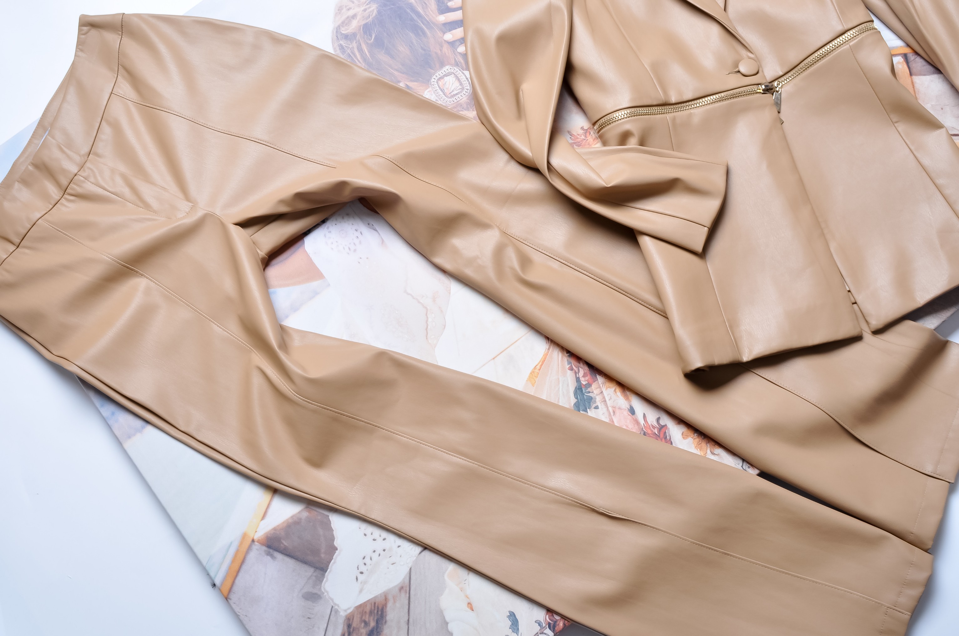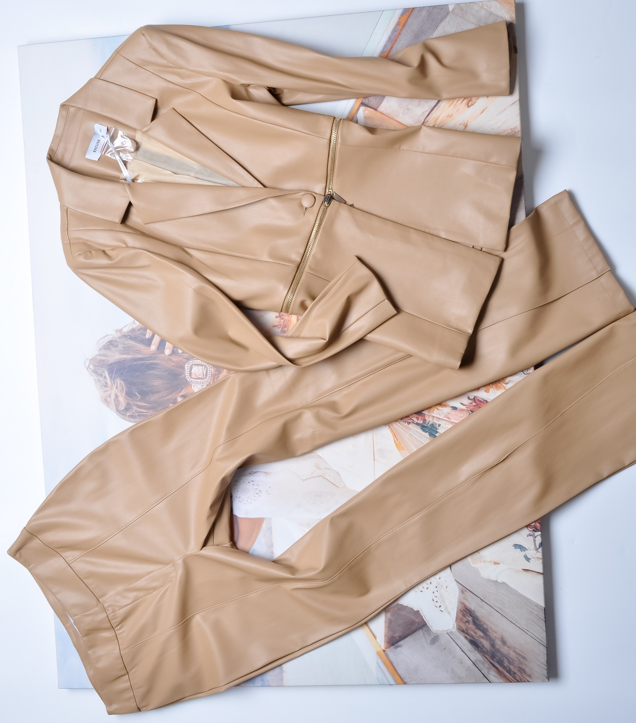BEŻOWY KOMPLET Z EKOSKÓRKI - MARYNARKA - SPODNIE