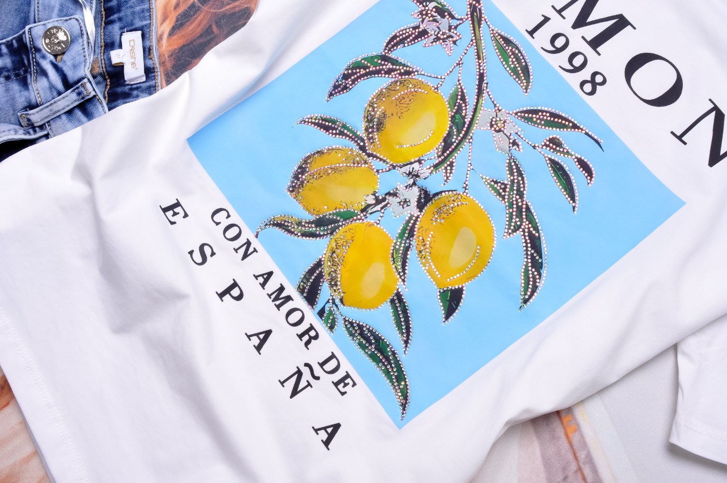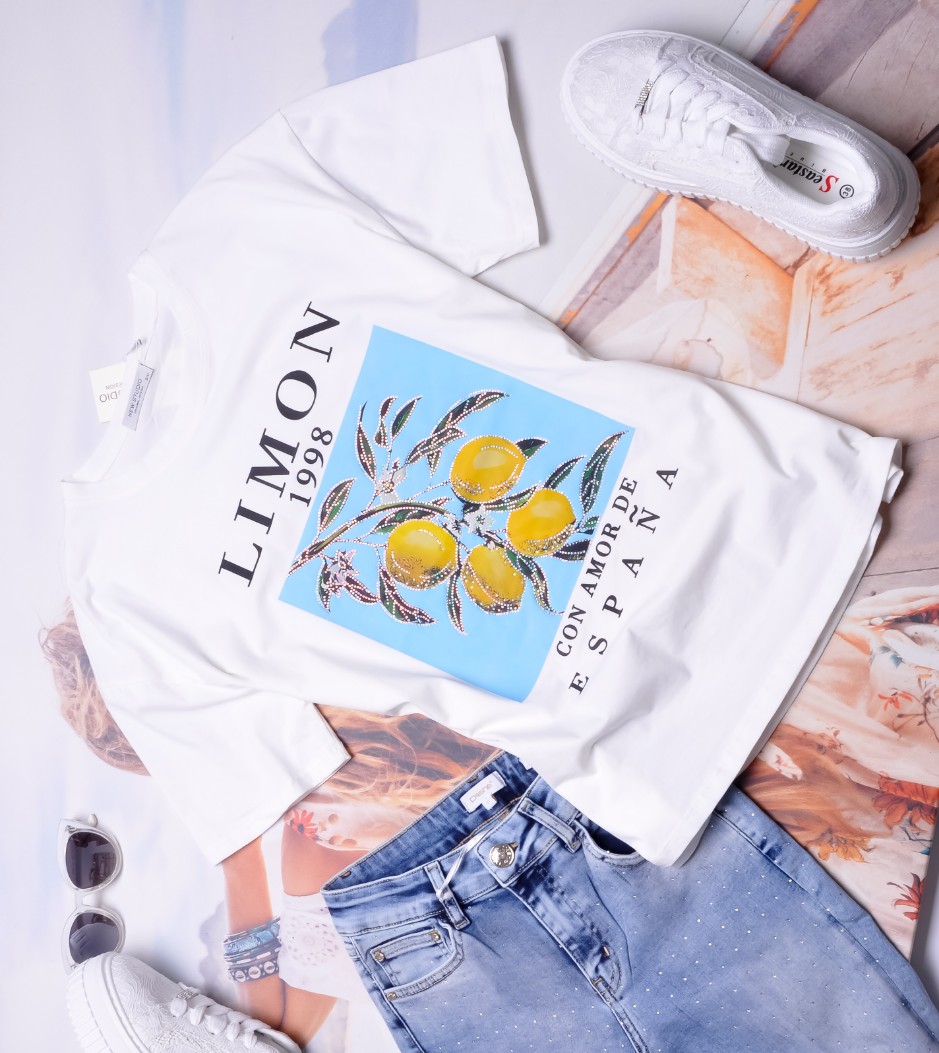 BIAŁA BLUZKA - APLIKACJA CYTRYN - NAPISY - CYRKONIE