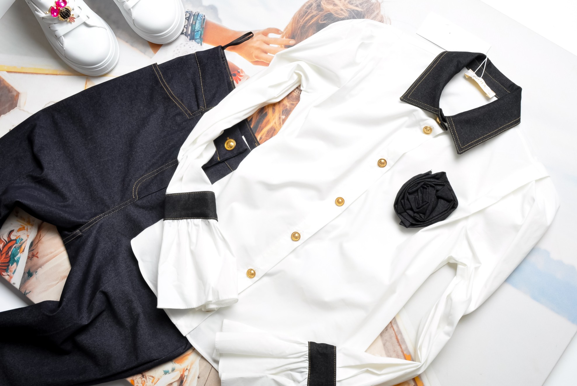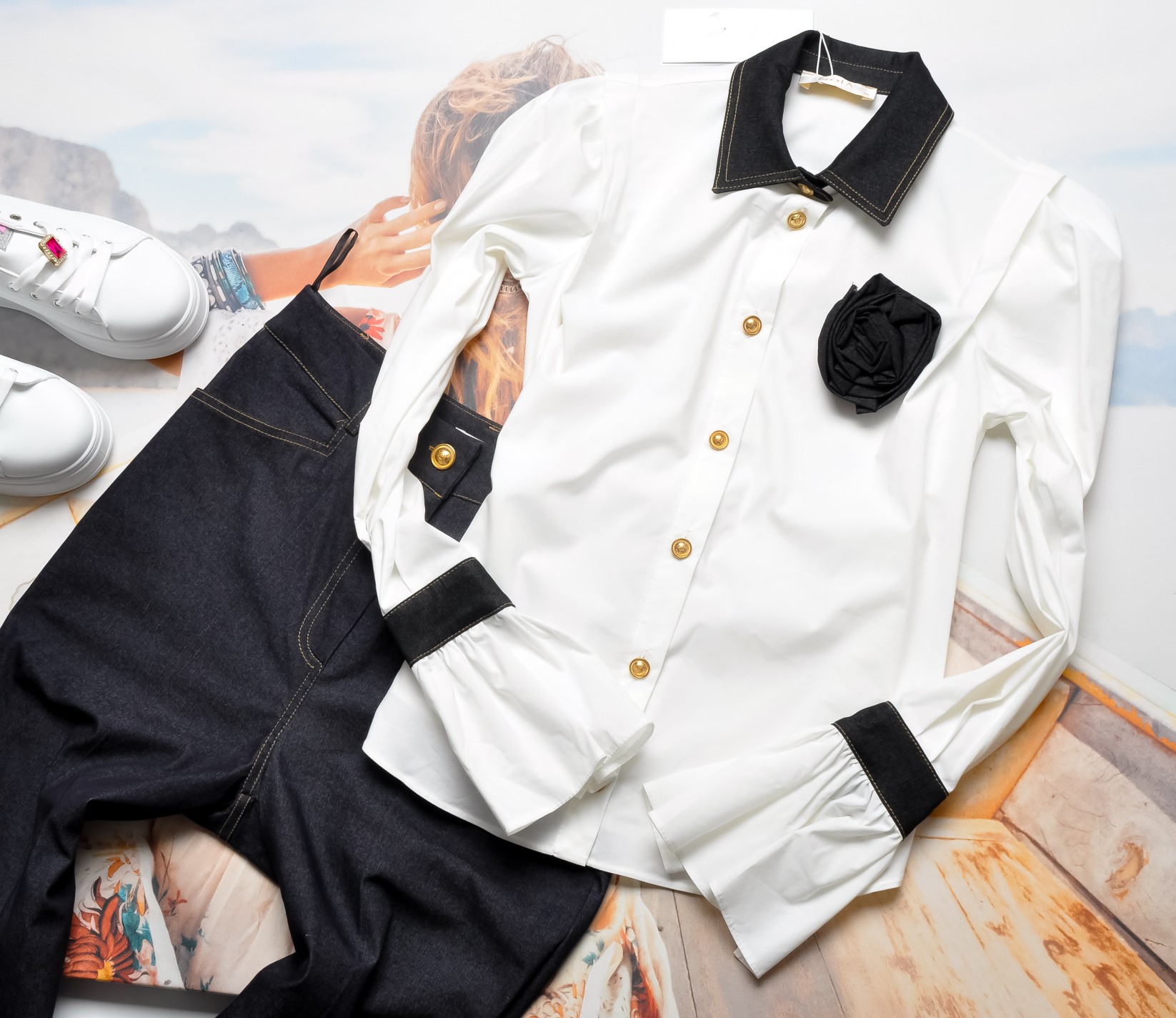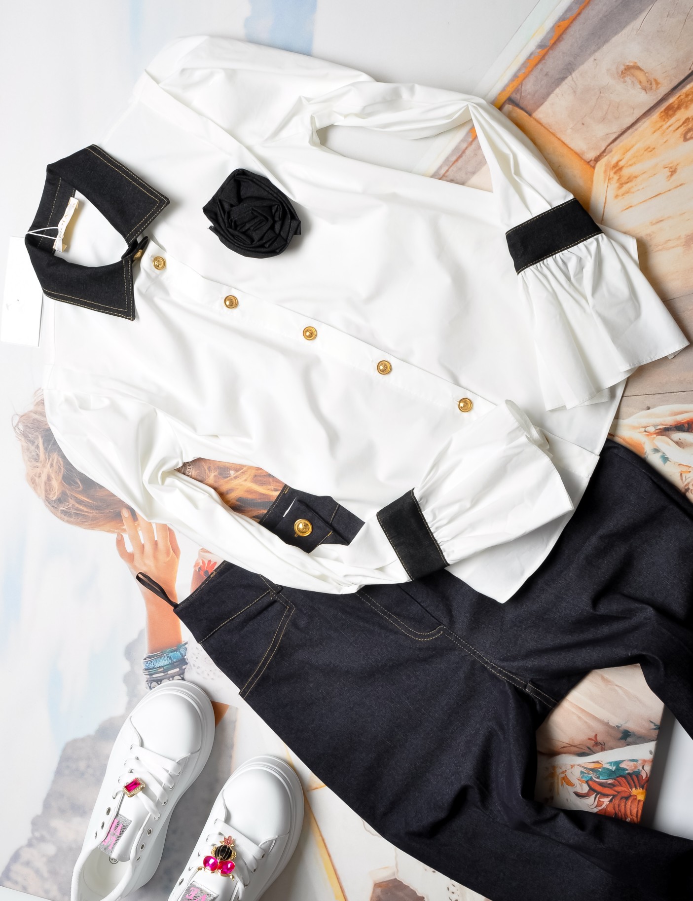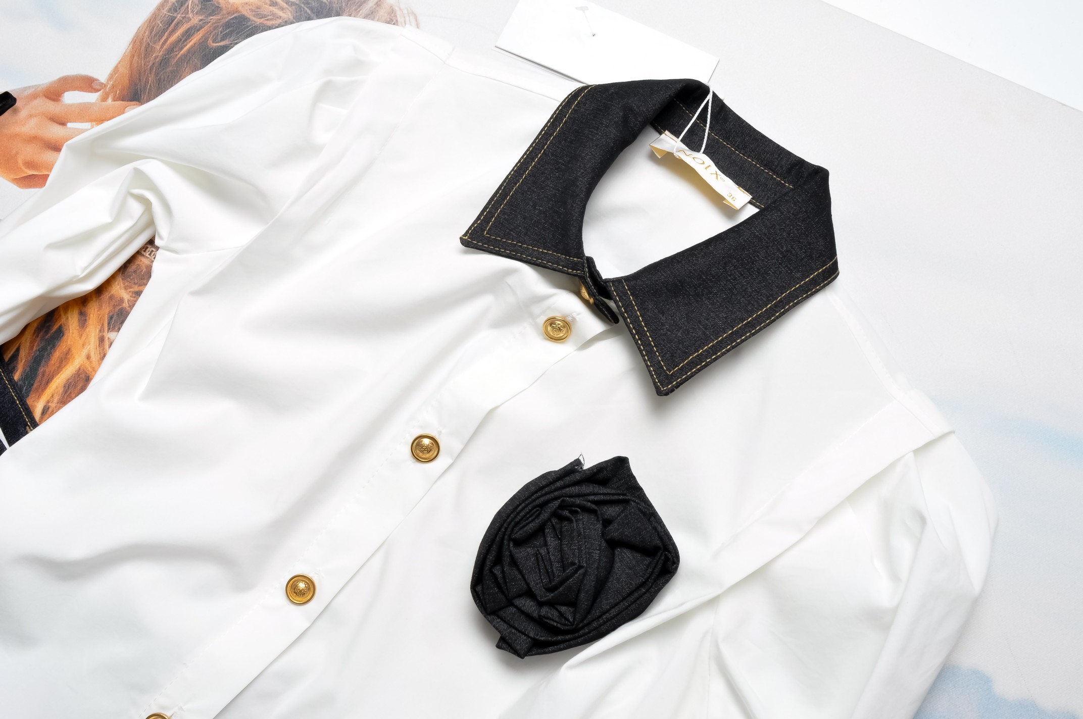 BIAŁA KOSZULA - JEANSOWY KOŁNIERZ + PRZYPINANY KWIATUSZEK