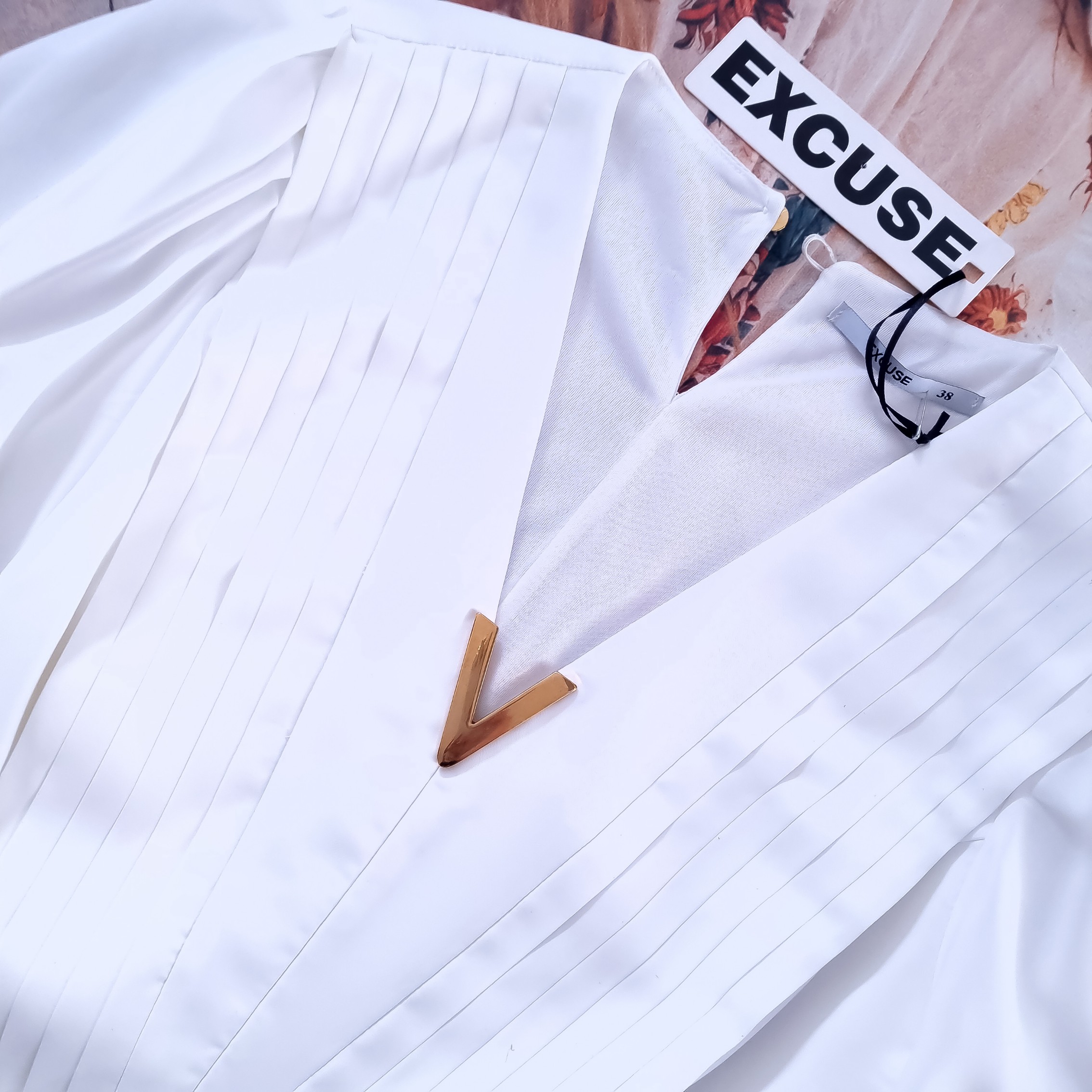 Śliczna koszula w białym kolorze. Zapinana na zamek, który jest z boku i guziczek z tyłu. Rękawy 3/4 wykończone mankietami. Koszula o fasonie luźnym, krótka. Koszula z przodu ma złote zdobienie przy dekolcie.