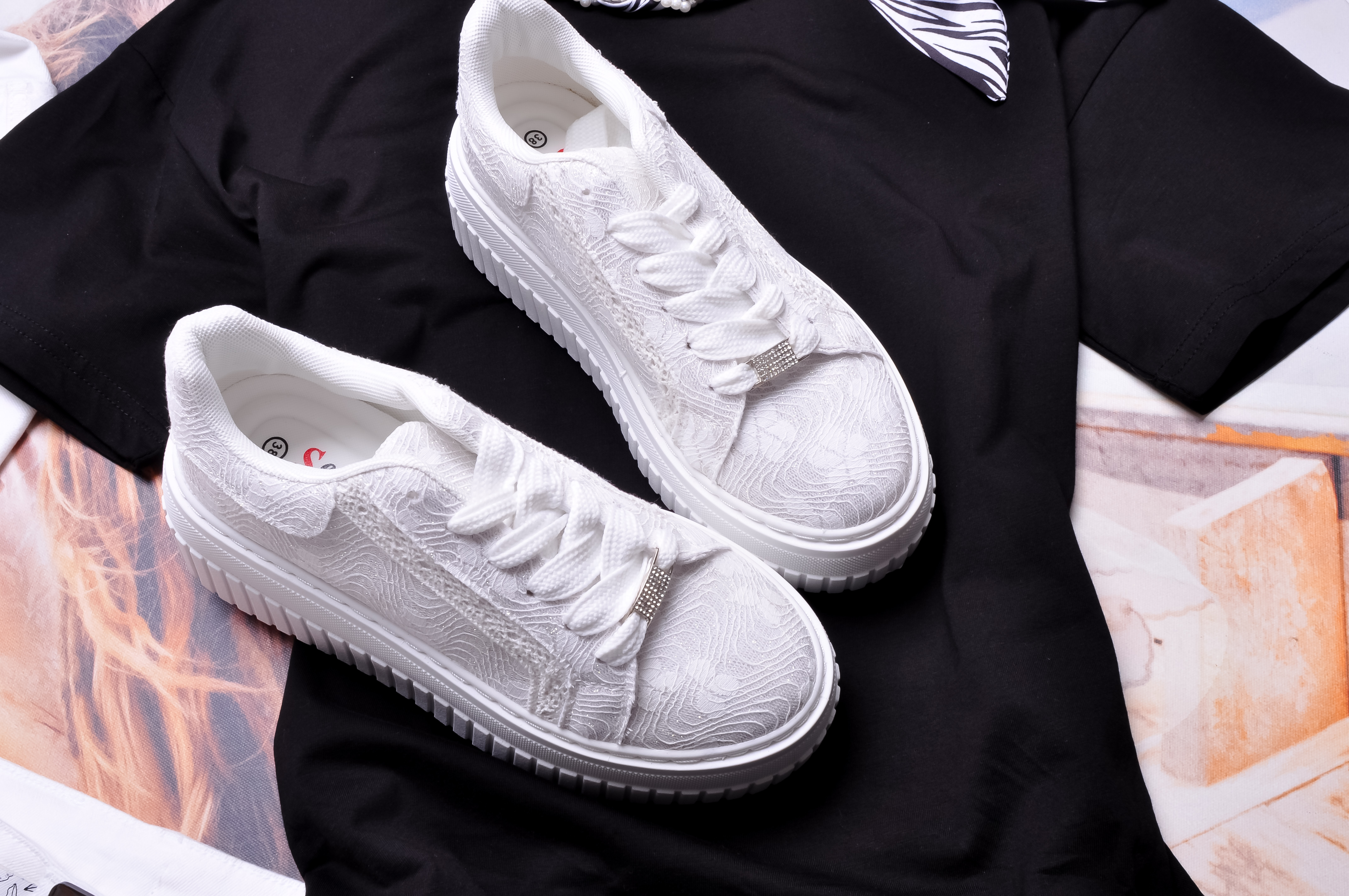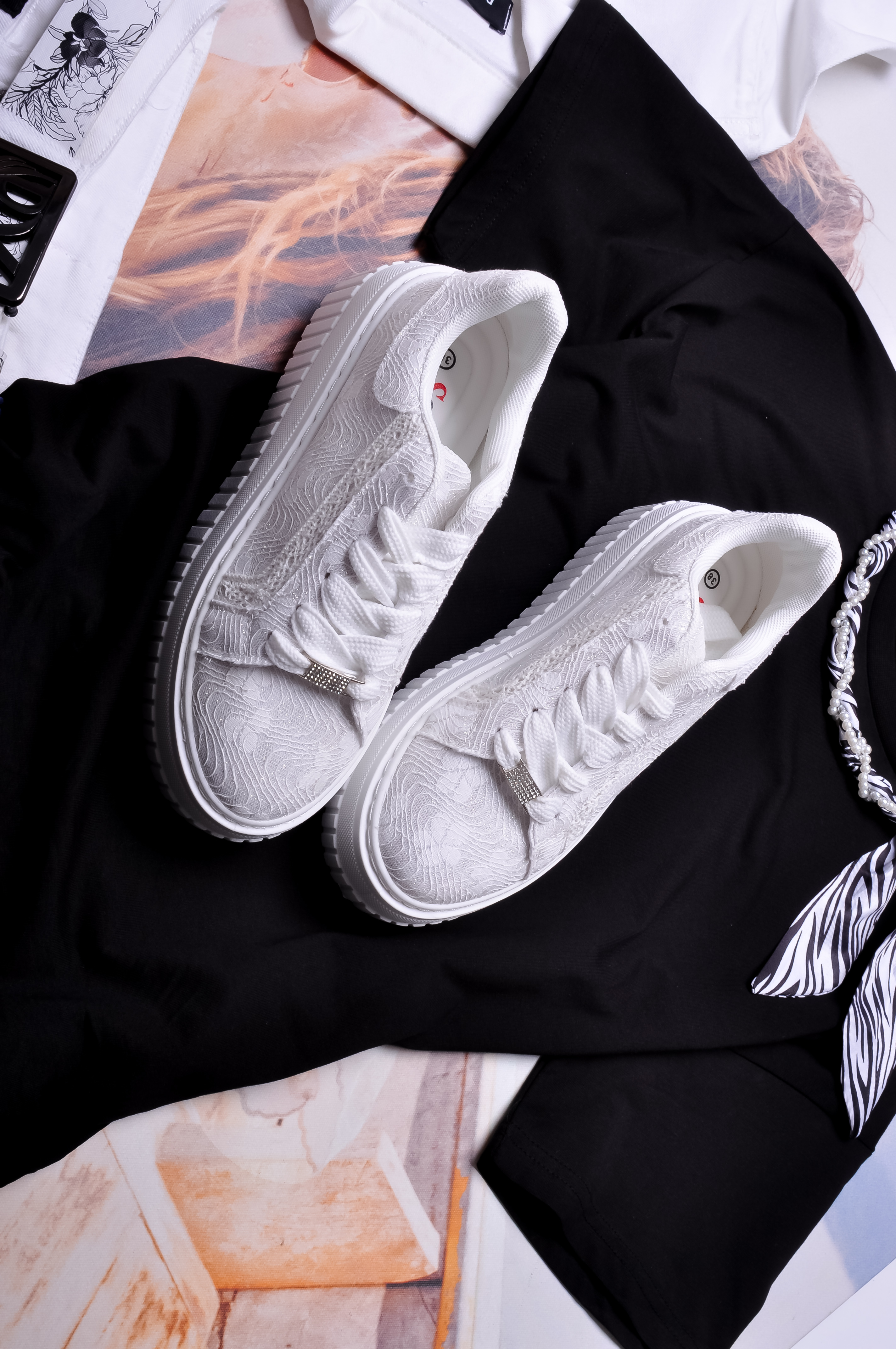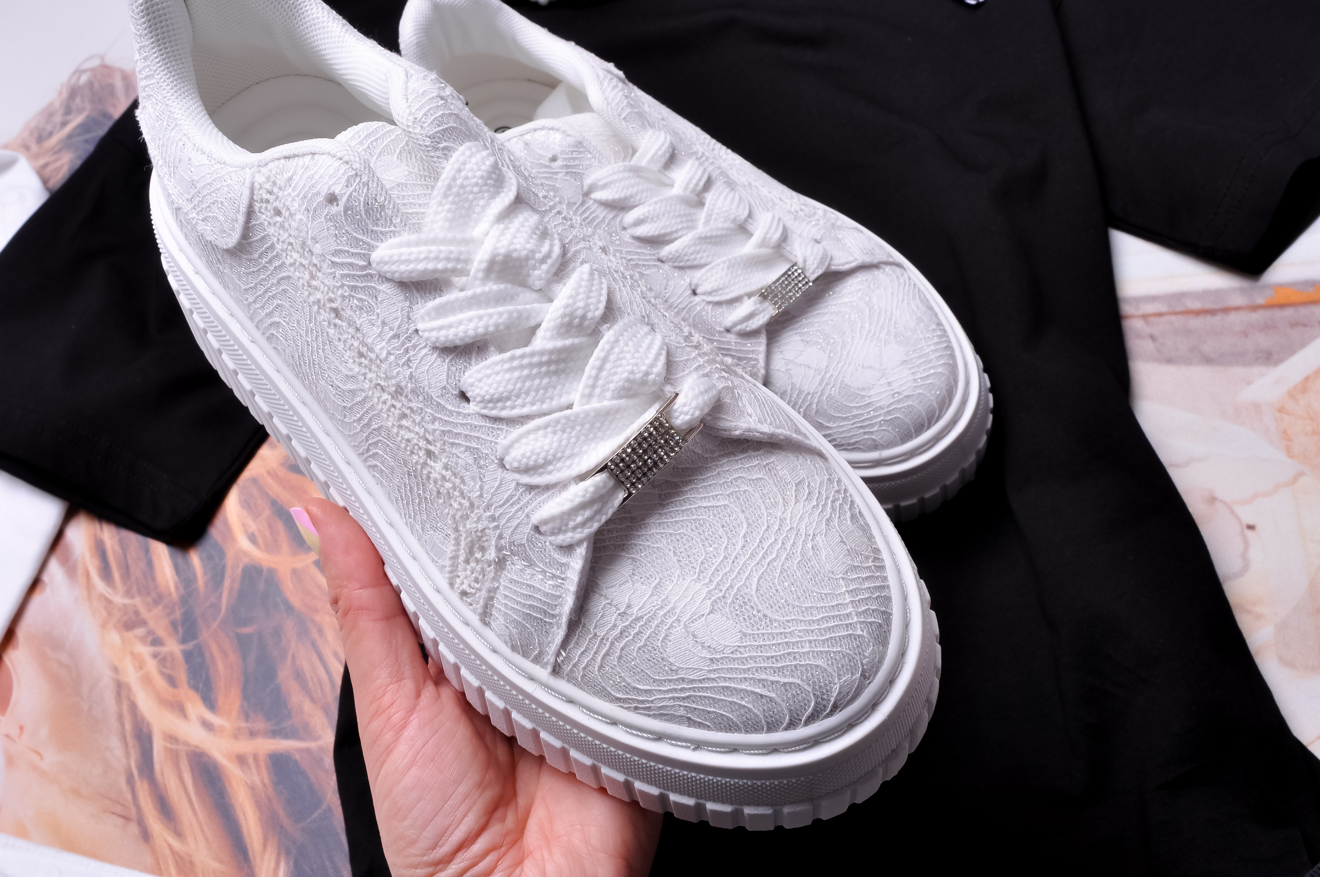 Białe sneakersy na wysokiej podeszwie wykończone błyszczącym, koronkowym materiałem. Na sznurówkach zdobione cyrkoniowym emblematem, który można zdjąć.