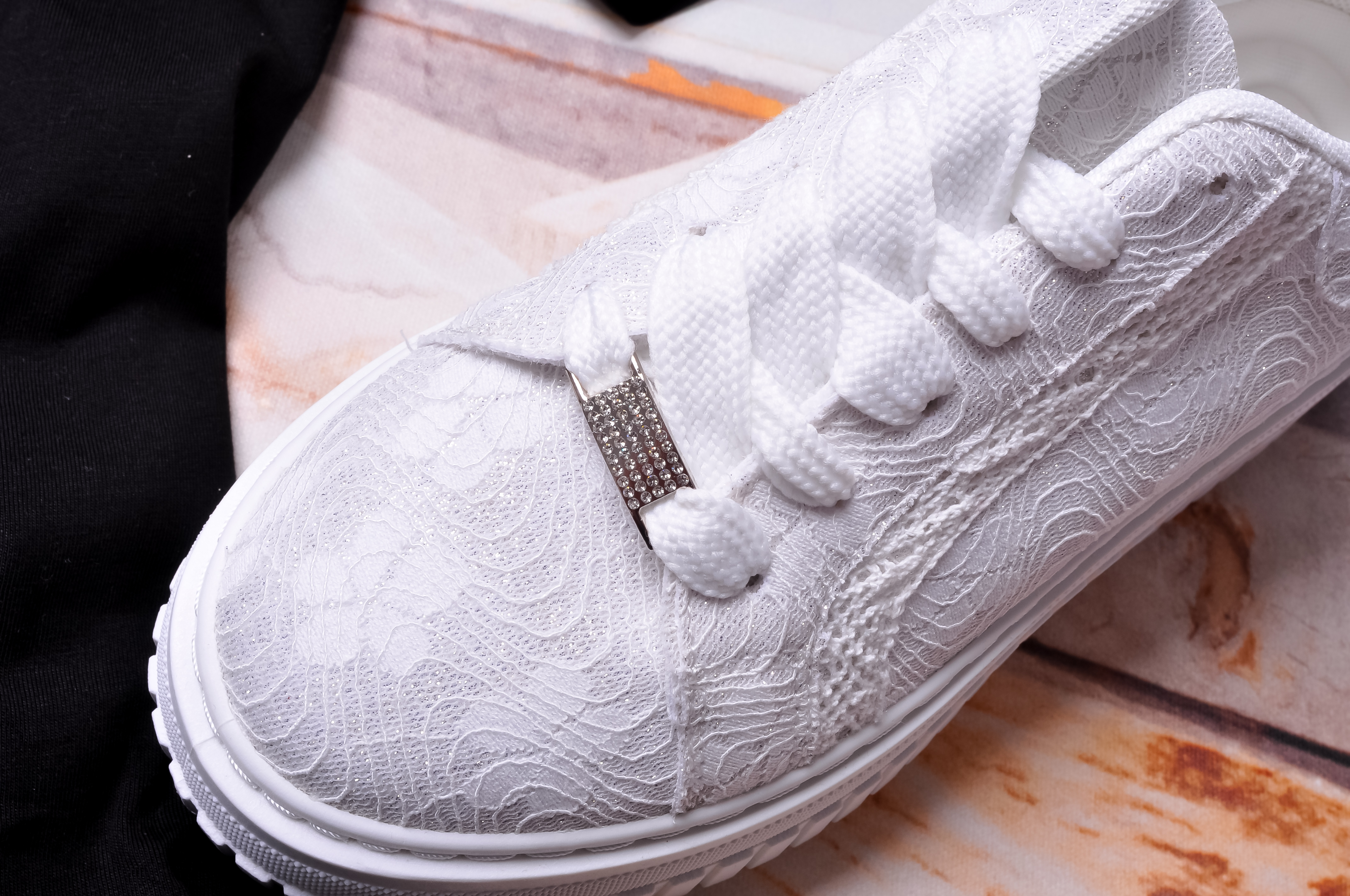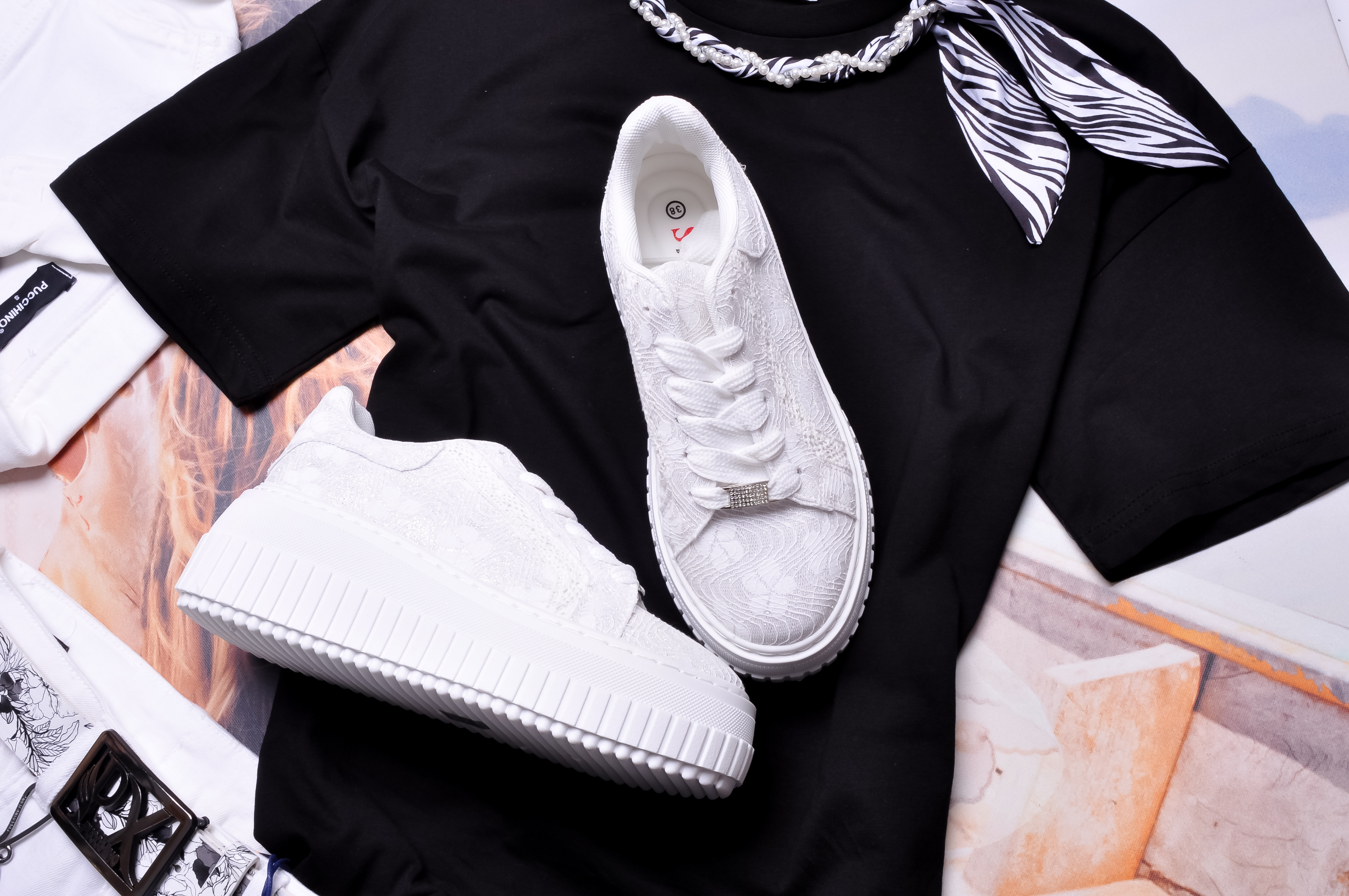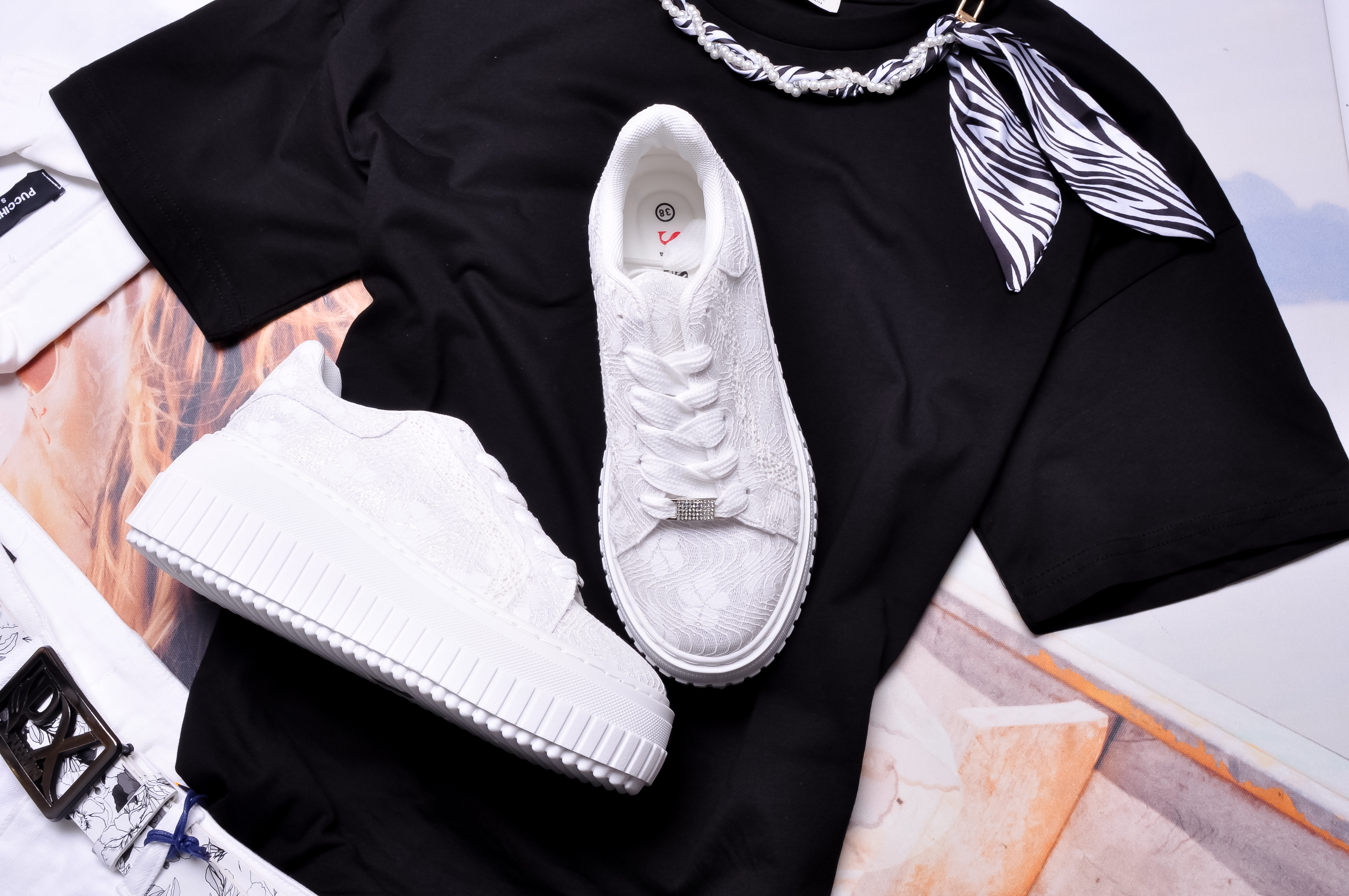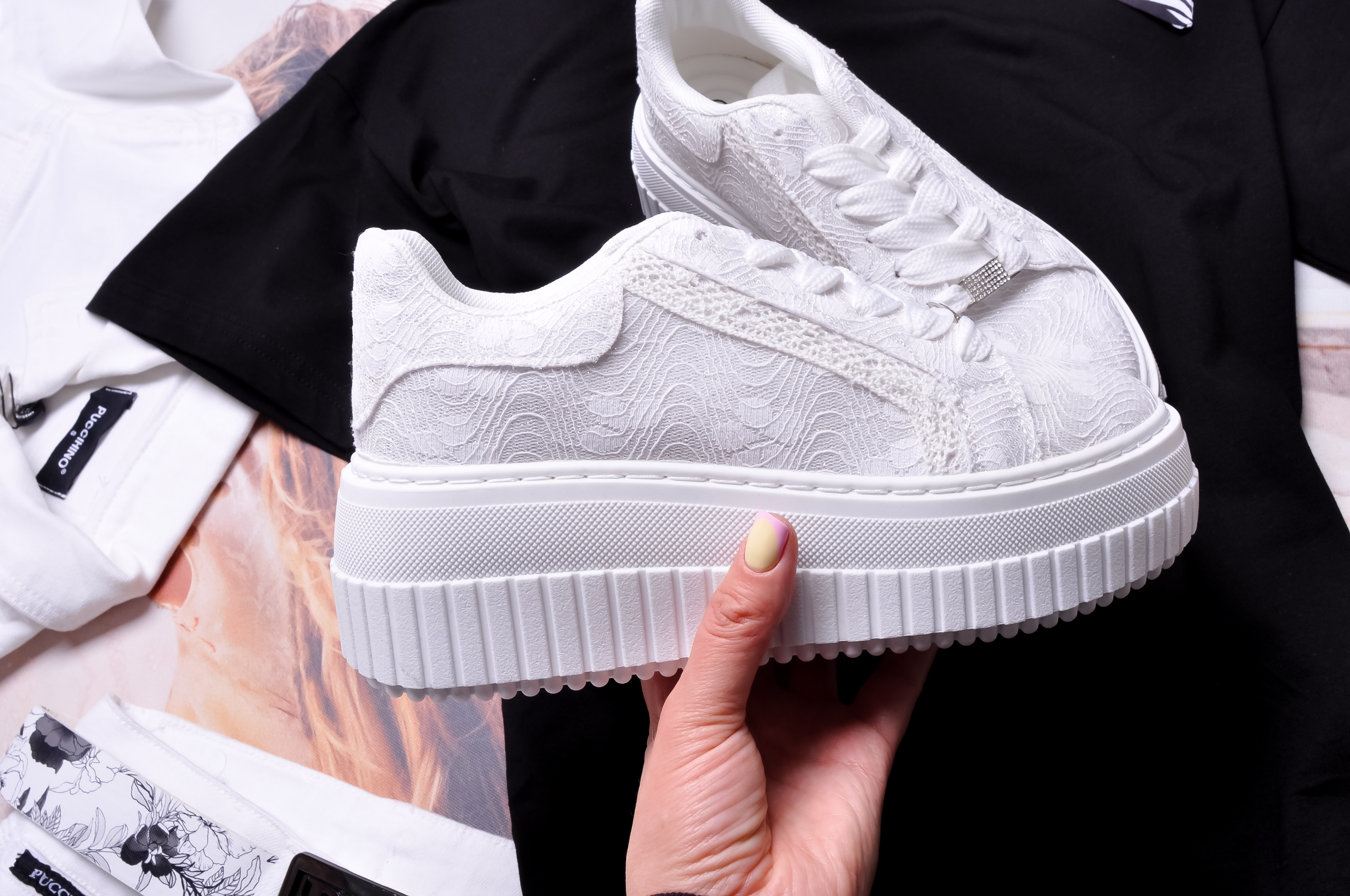 Białe sneakersy na wysokiej podeszwie wykończone błyszczącym, koronkowym materiałem. Na sznurówkach zdobione cyrkoniowym emblematem, który można zdjąć.