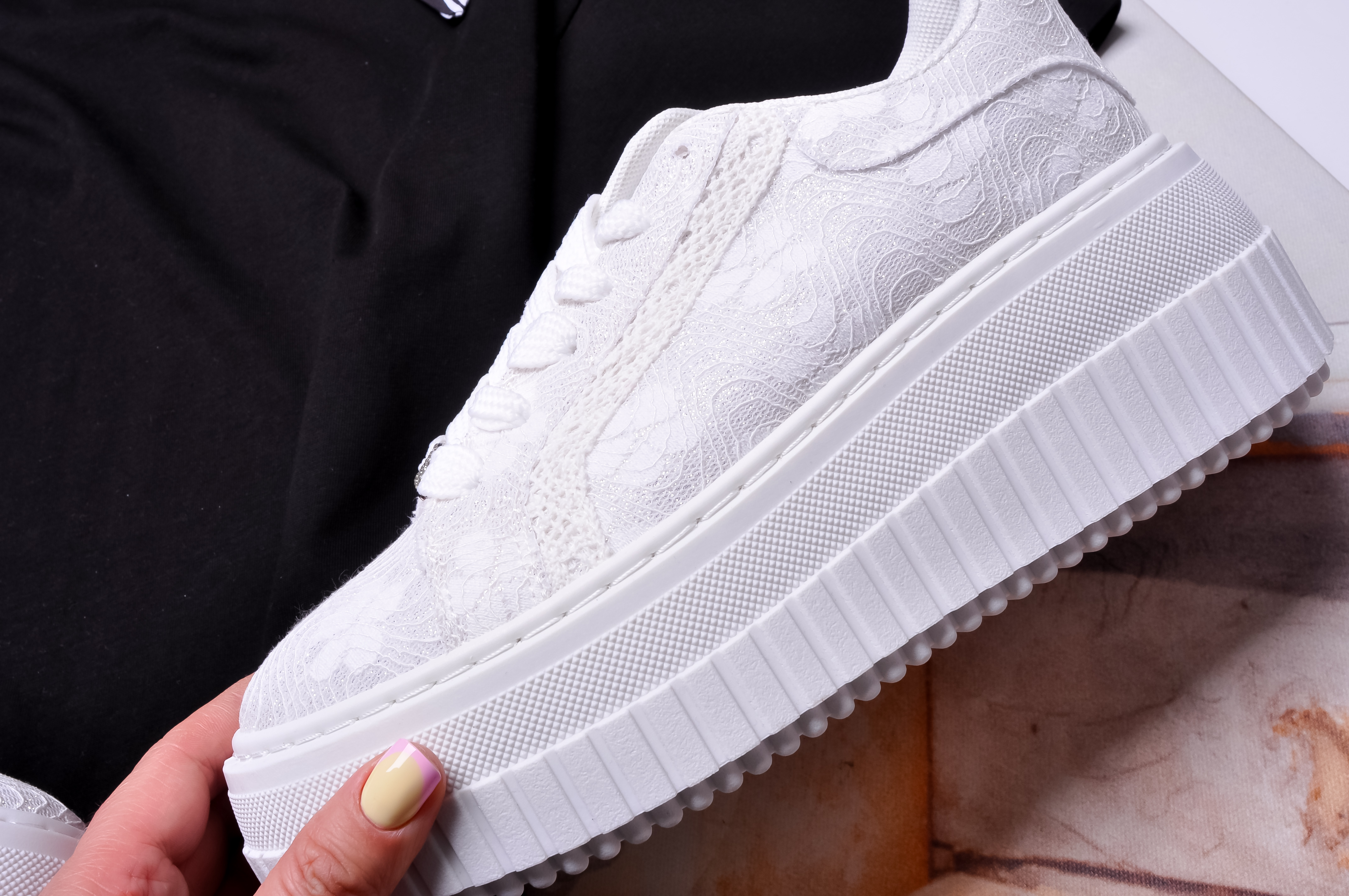 BIAŁE SNEAKERSY NA WYSOKIEJ PODESZWIE WYKOŃCZONE BŁYSZCZĄCĄ KORONKĄ