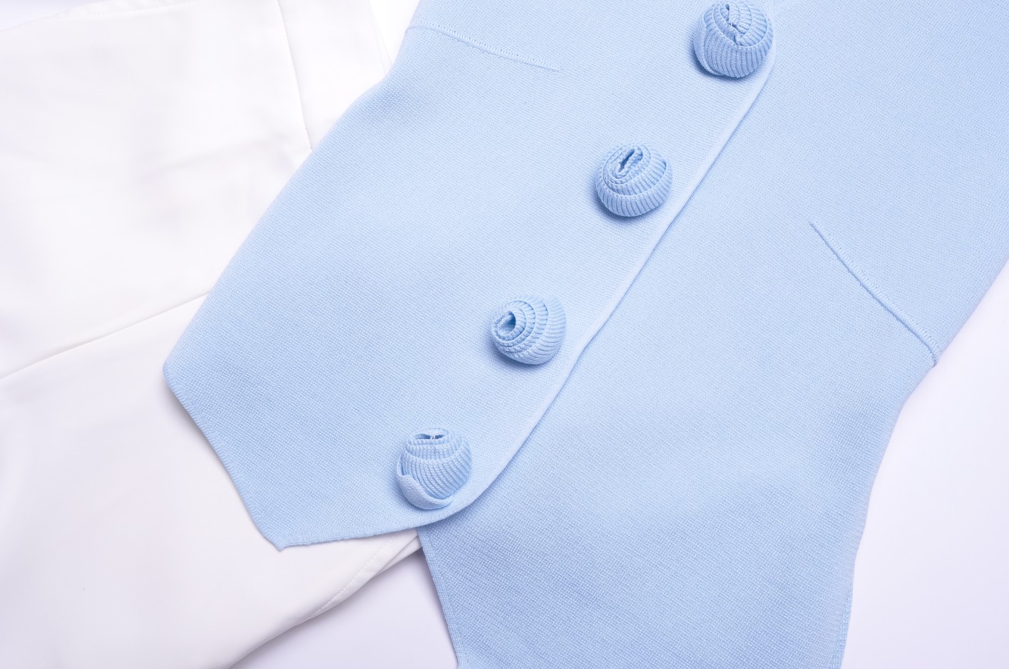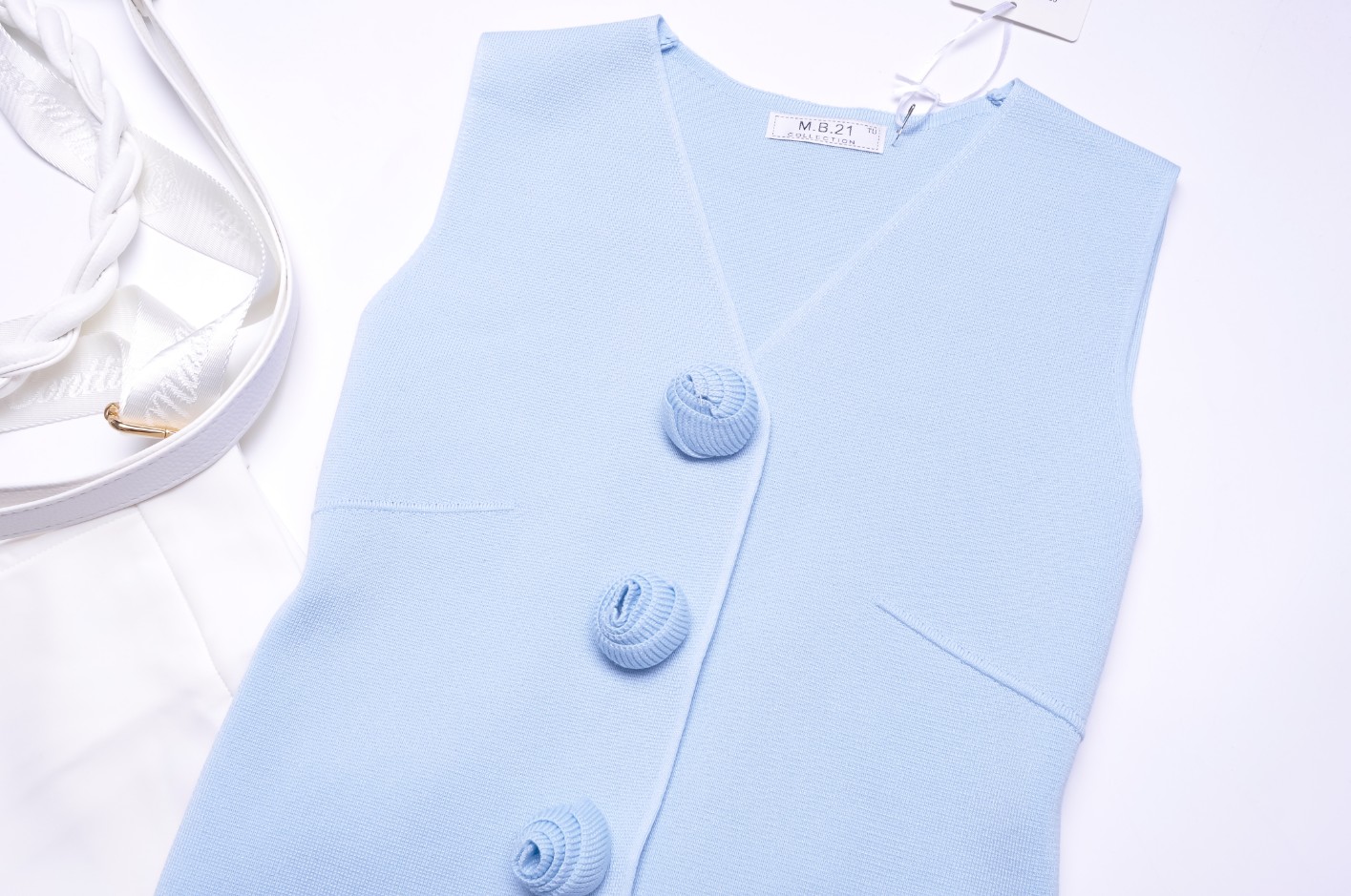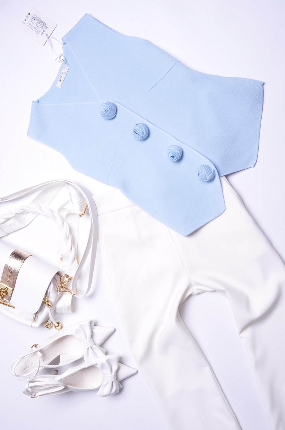 Piękna kamizelka o przylegającym kroju z dzianinowego materiału w błękitnym kolorze. Zapinana na napy. Zdobiona dzianinowymi kwiatami. Krój prosty.