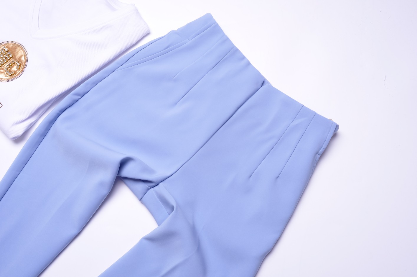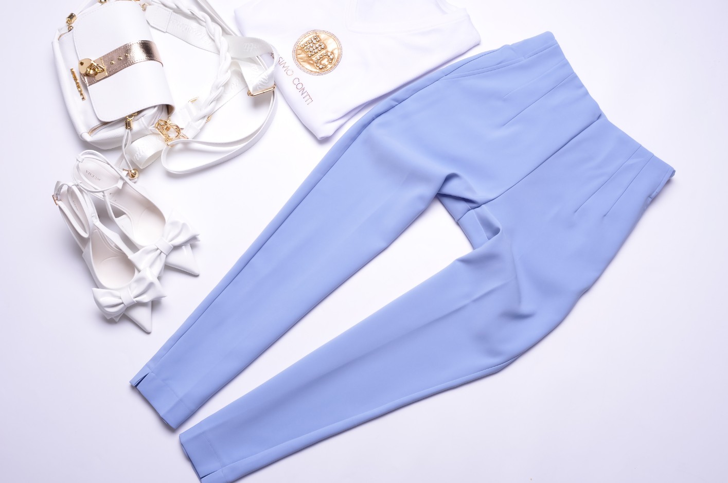 Błękitne, eleganckie spodnie z wysokim stanem. Zwężana nogawka, z kantem. Zapinane na zamek, który jest z boku. Z tyłu gumka w talii. Kieszenie po bokach.