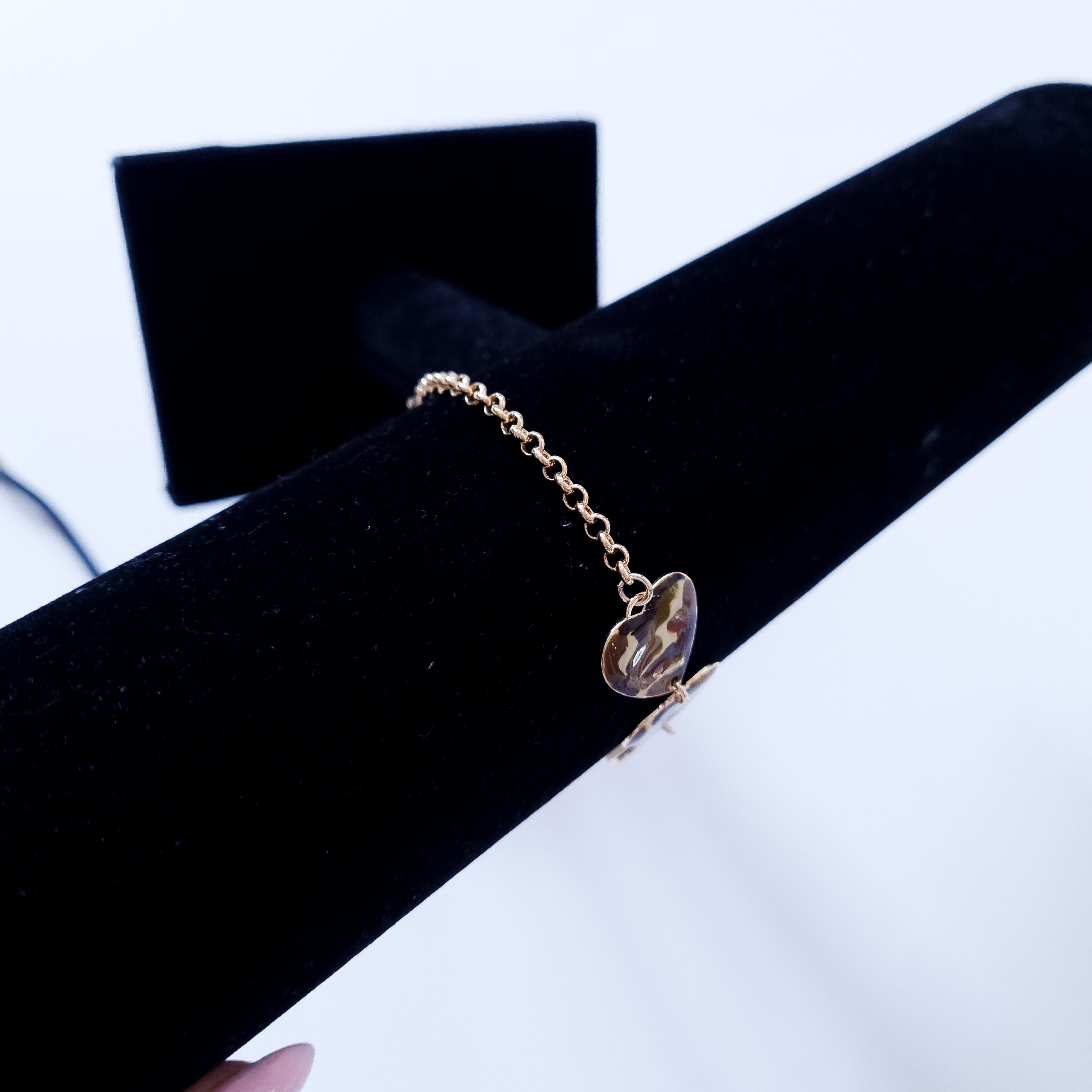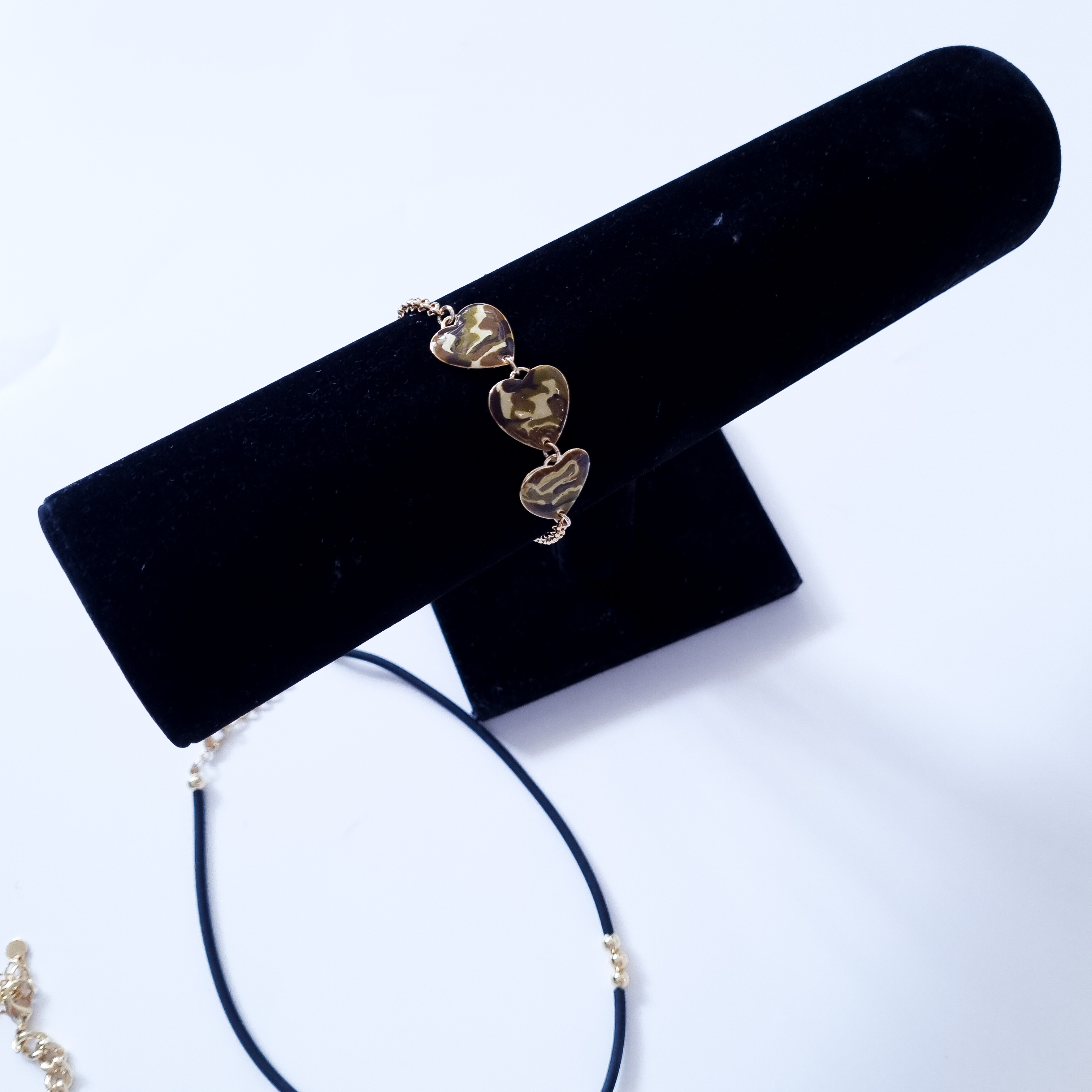 Bransoletka w złotym kolorze z serduszkami w stylu militarnym. Z możliwością regulowania zapięcia. Będzie eleganckim dodatkiem na co dzień. Długość po zapięciu 8 cm