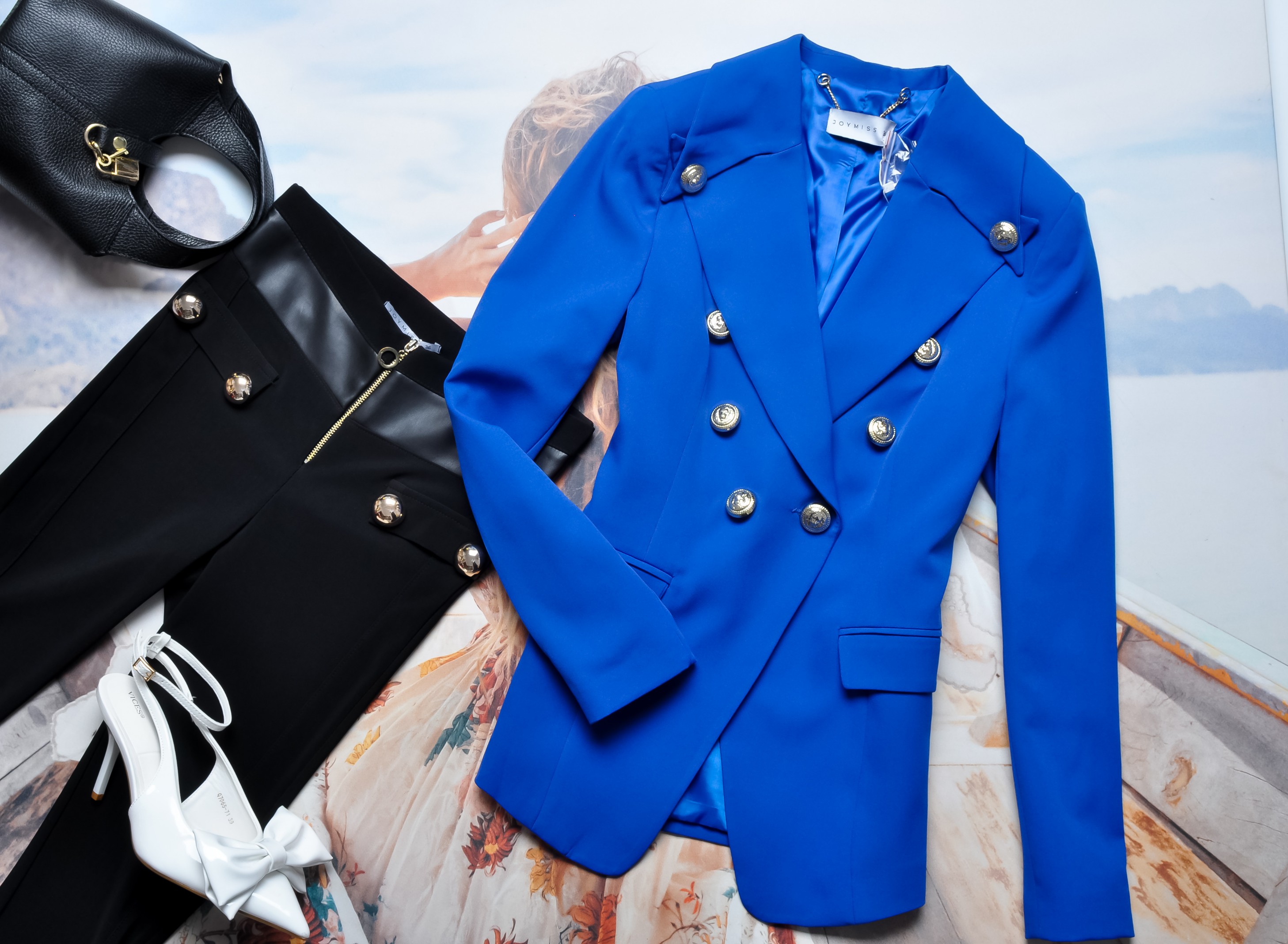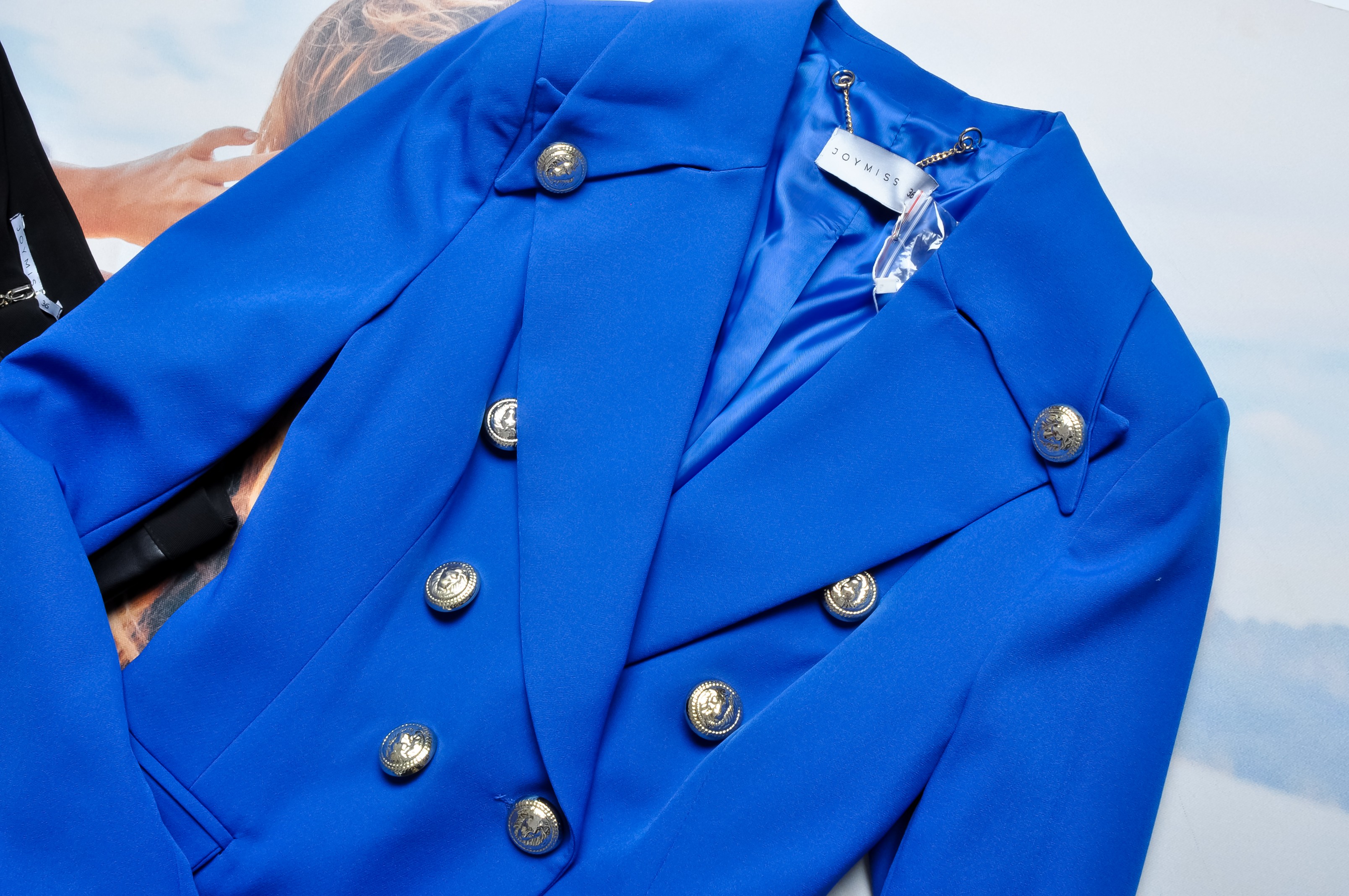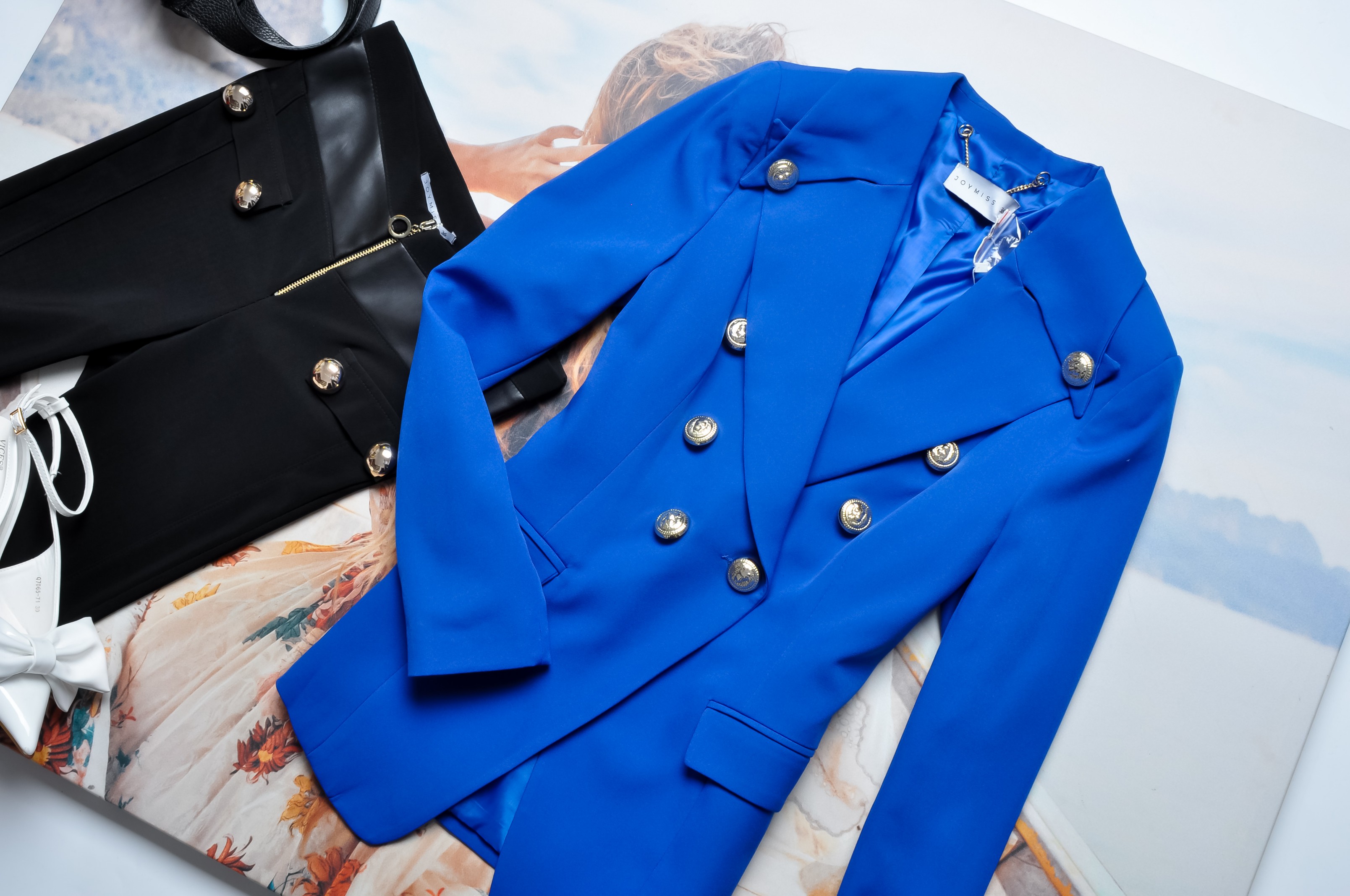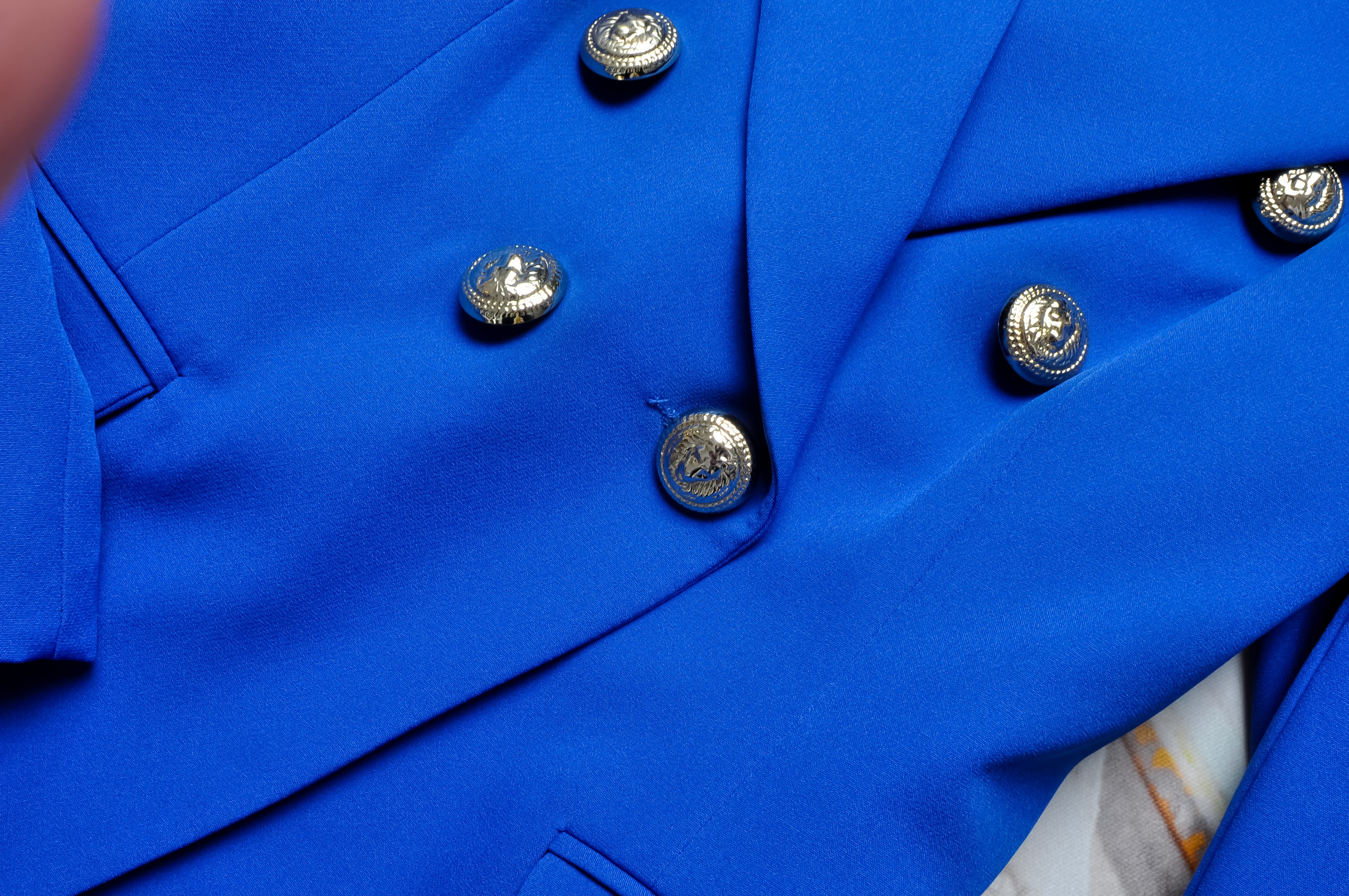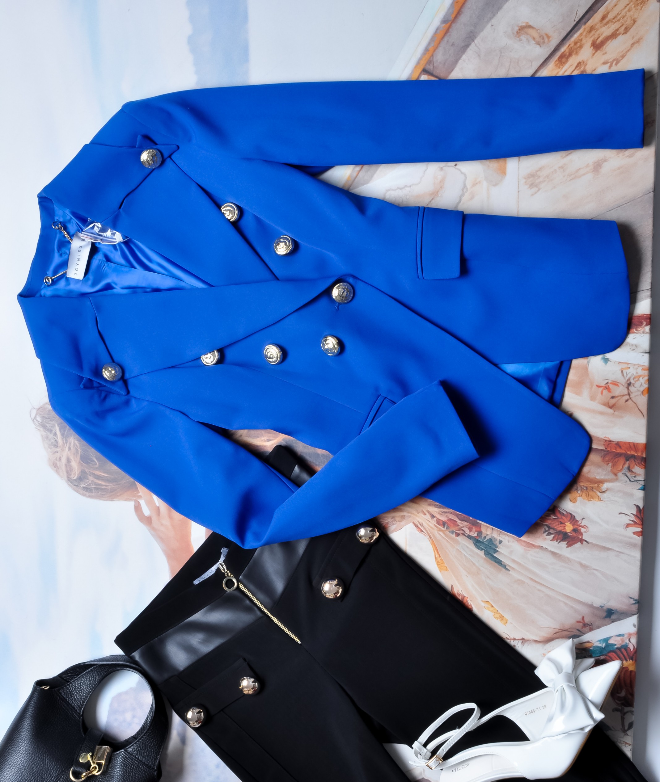 Elegancka marynarka w chabrowym kolorze. Fason lekko przylegający. Z przodu zapinana ozdobnymi guzikami z grawerunkiem głowy lwa. Całość wykończona kołnierzem. Model z poduszkami na ramionach. Materiał nie jest elastyczny.