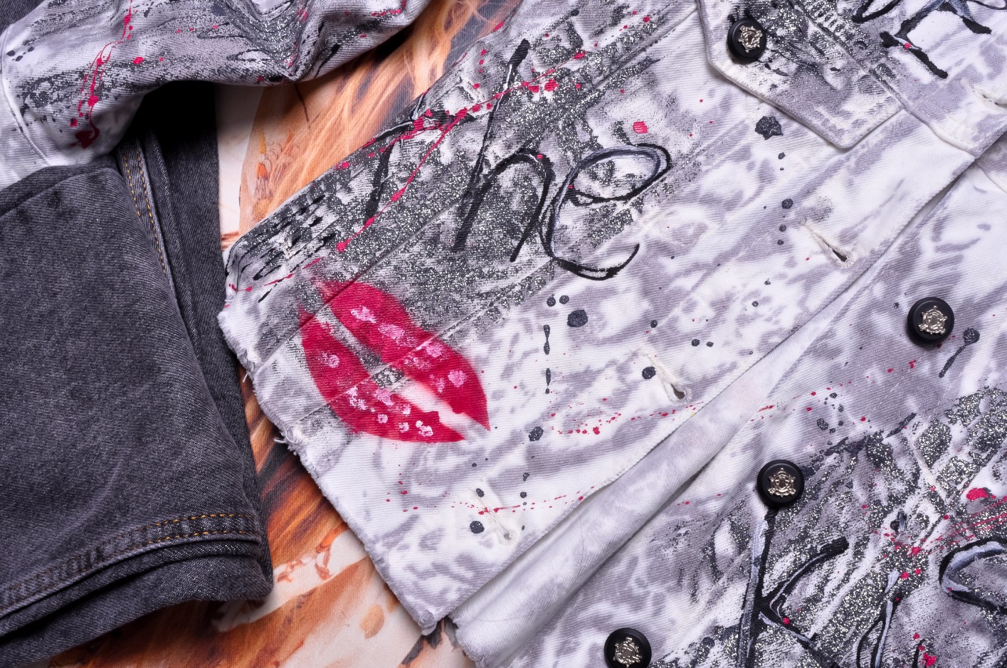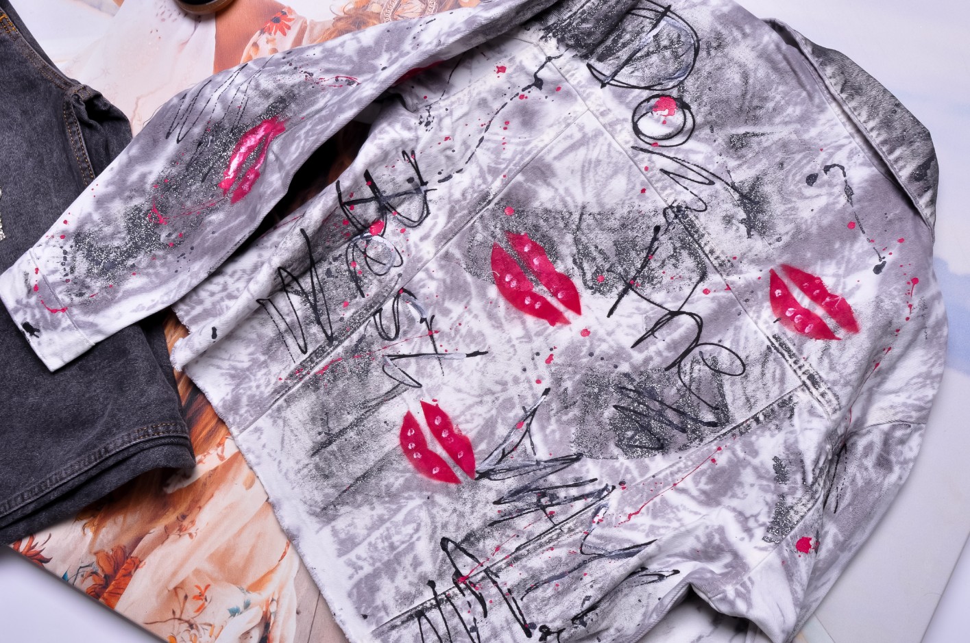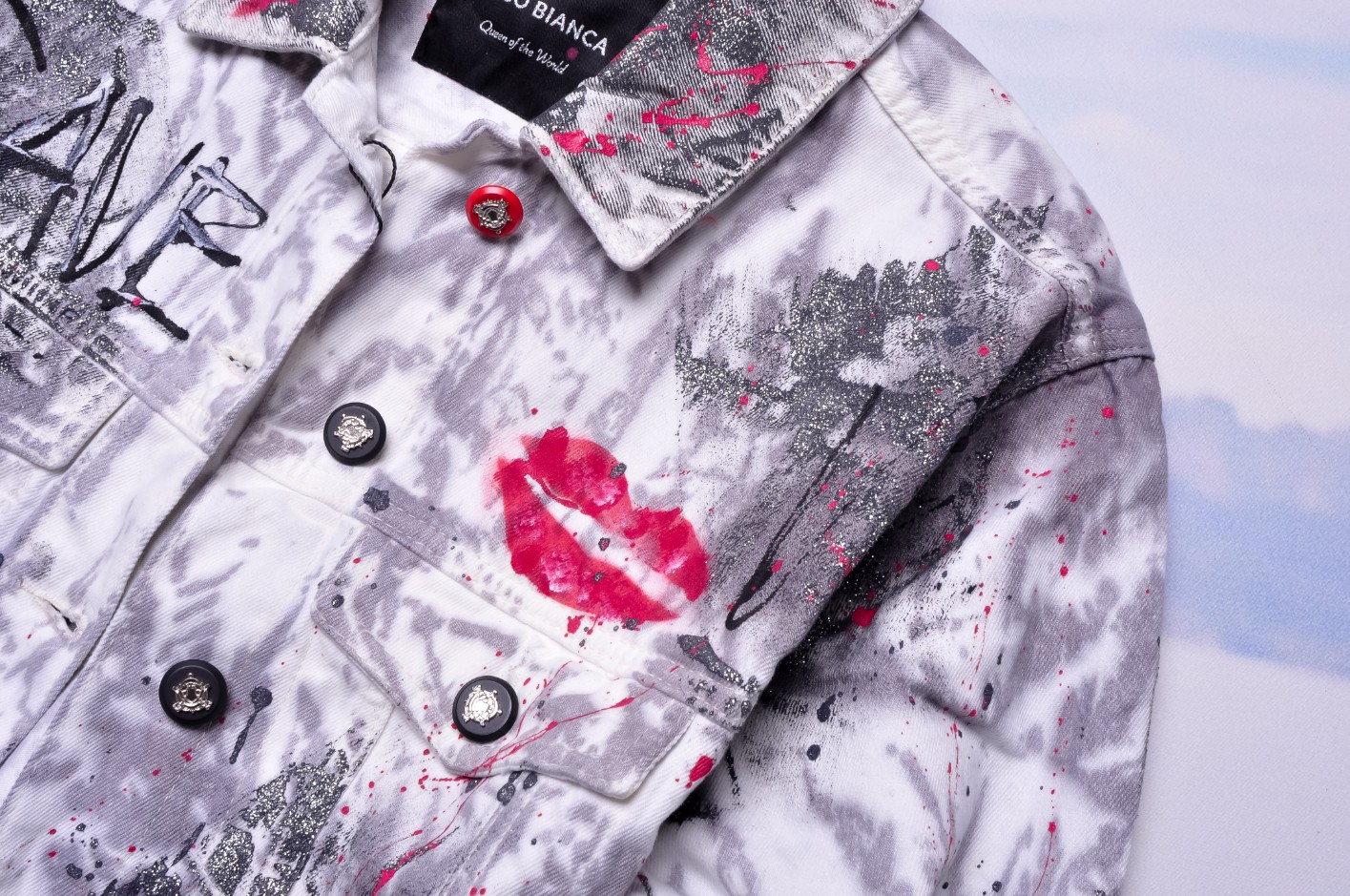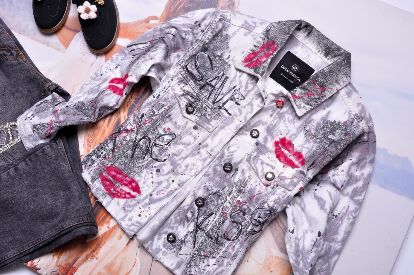 Jeansowa kurteczka w biało - szarym kolorze. Zapinana na guziki. Posiada kieszenie z przodu i rękawy zapinane na guzik. Zdobiona brokatowymi przetarciami, napisami i śladami szminki.