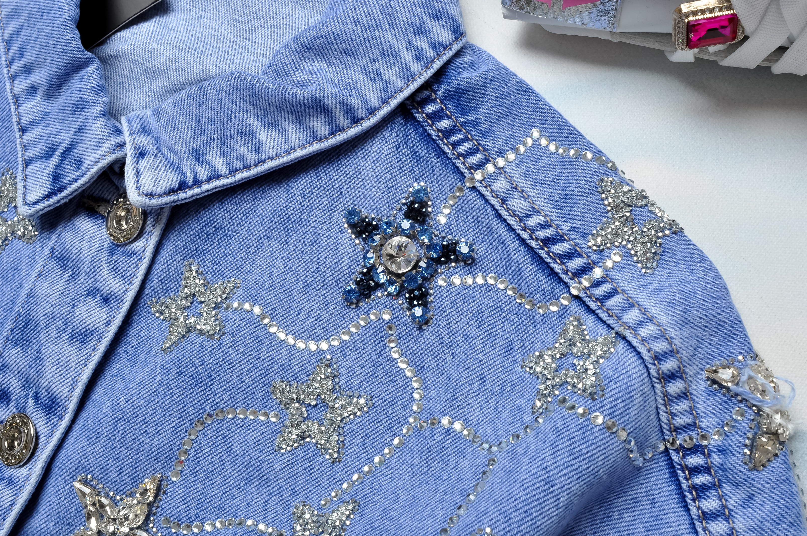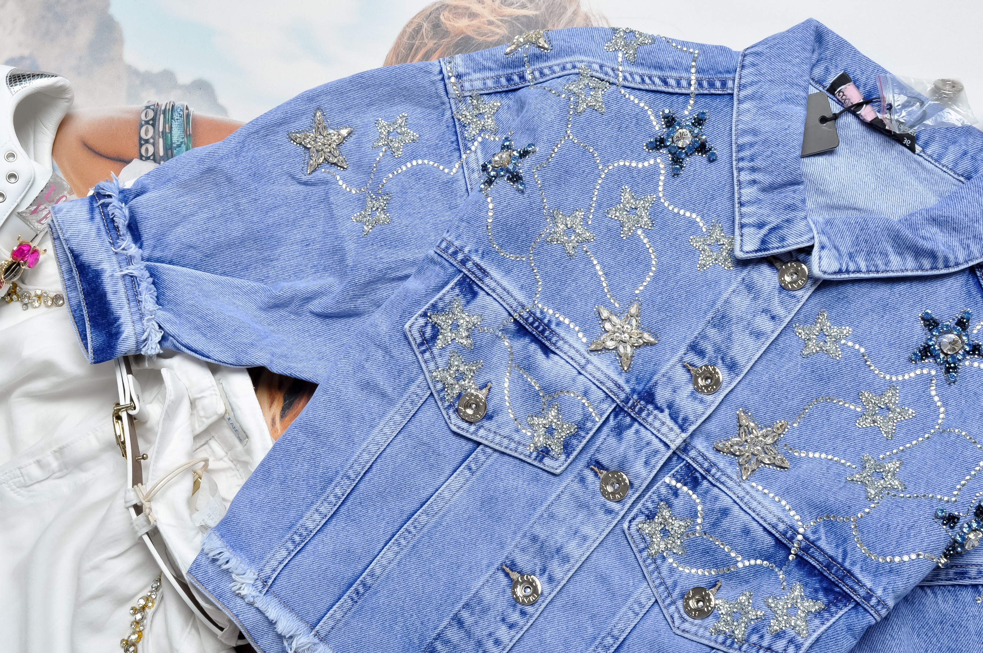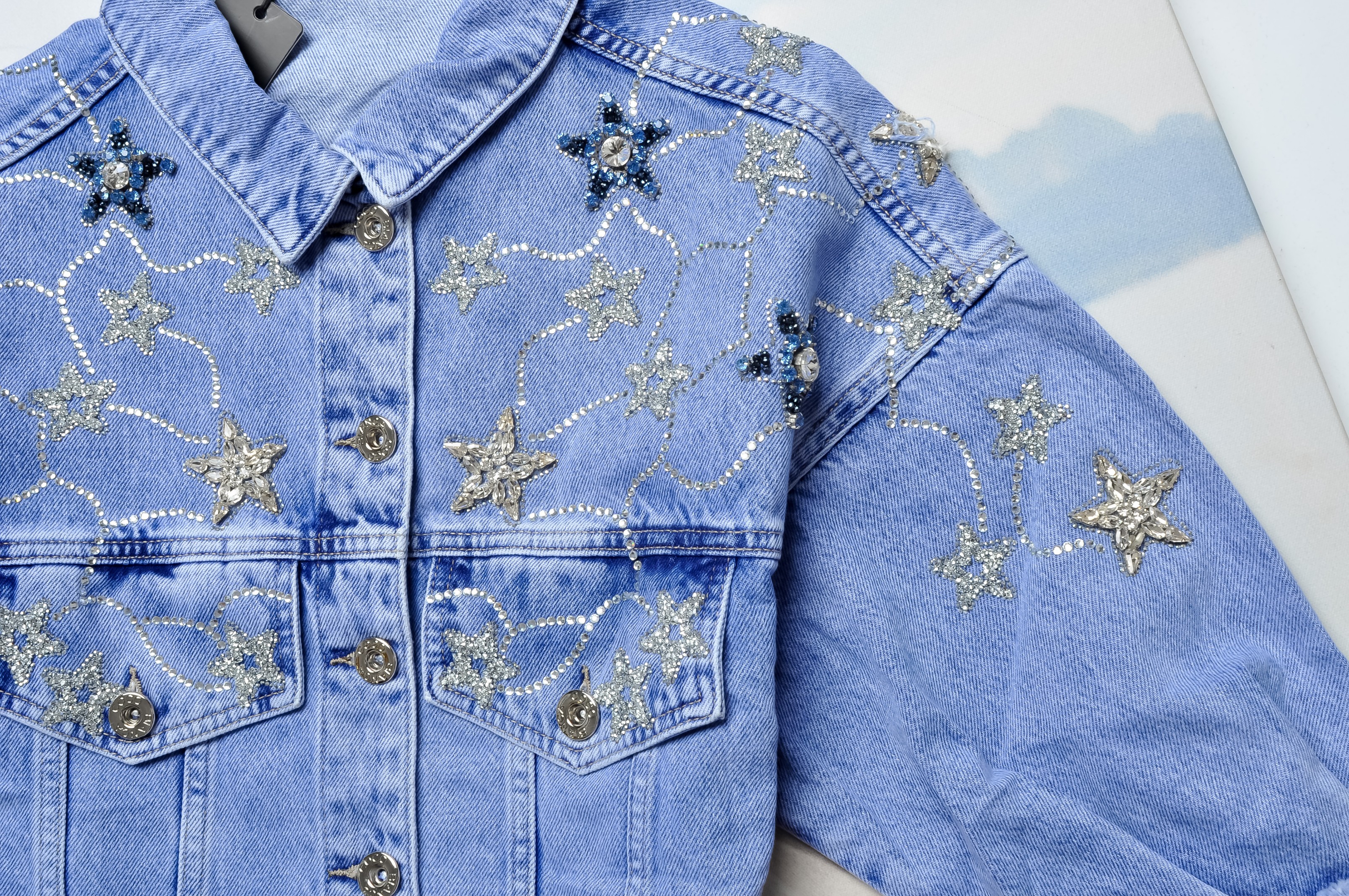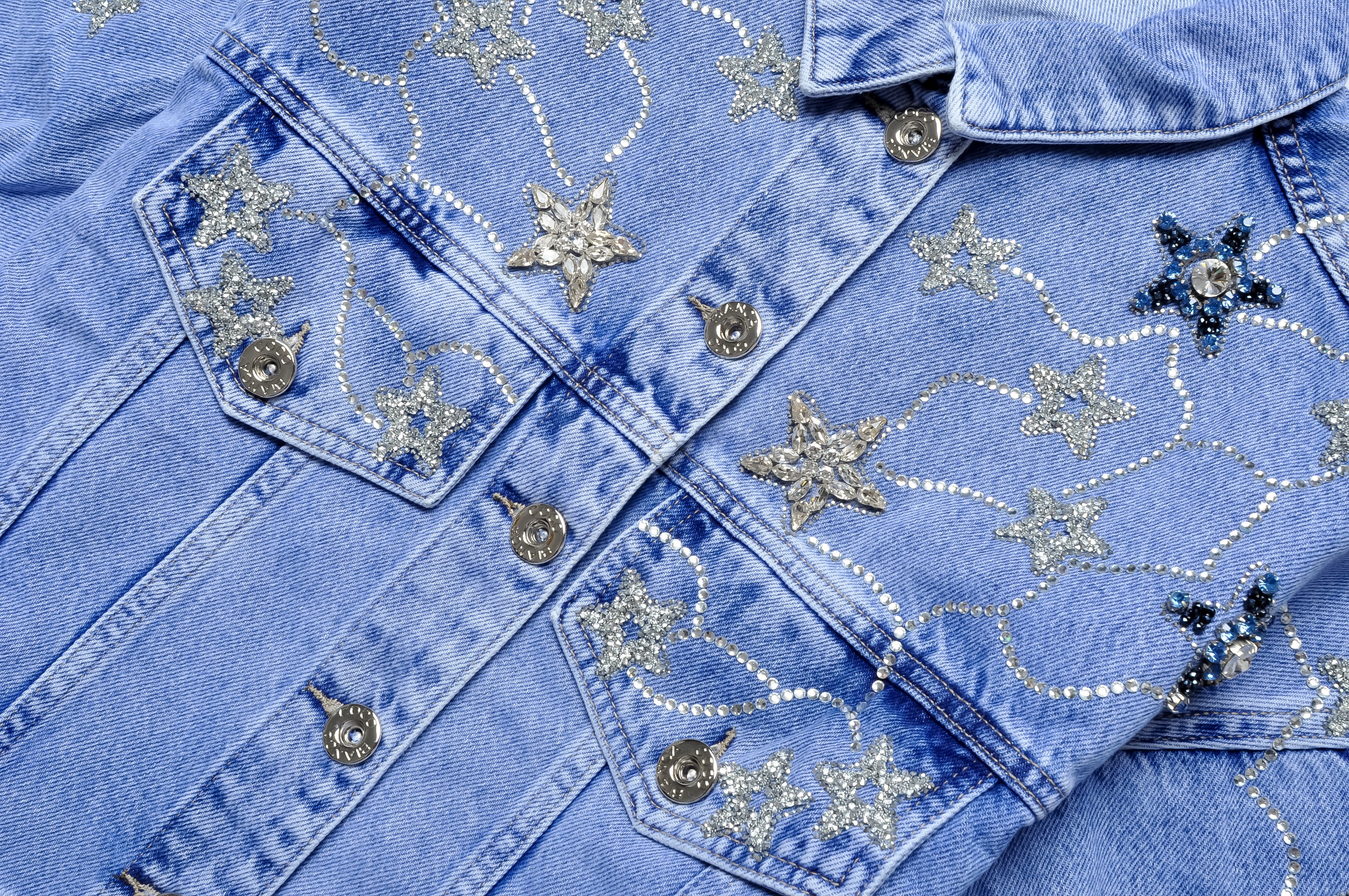 Krótka jeansowa kurteczka z 3/4 rękawem. Zapinana na guziki. Posiada imitacje kieszeni z przodu. Bogato zdobiona cyrkoniami z przodu. Fason oversize, prosty. Przód surowo zakończony.
