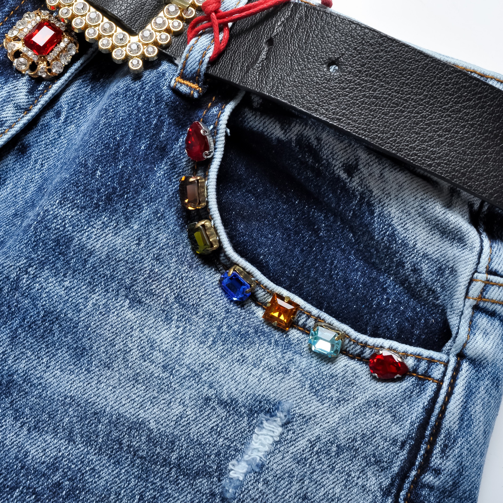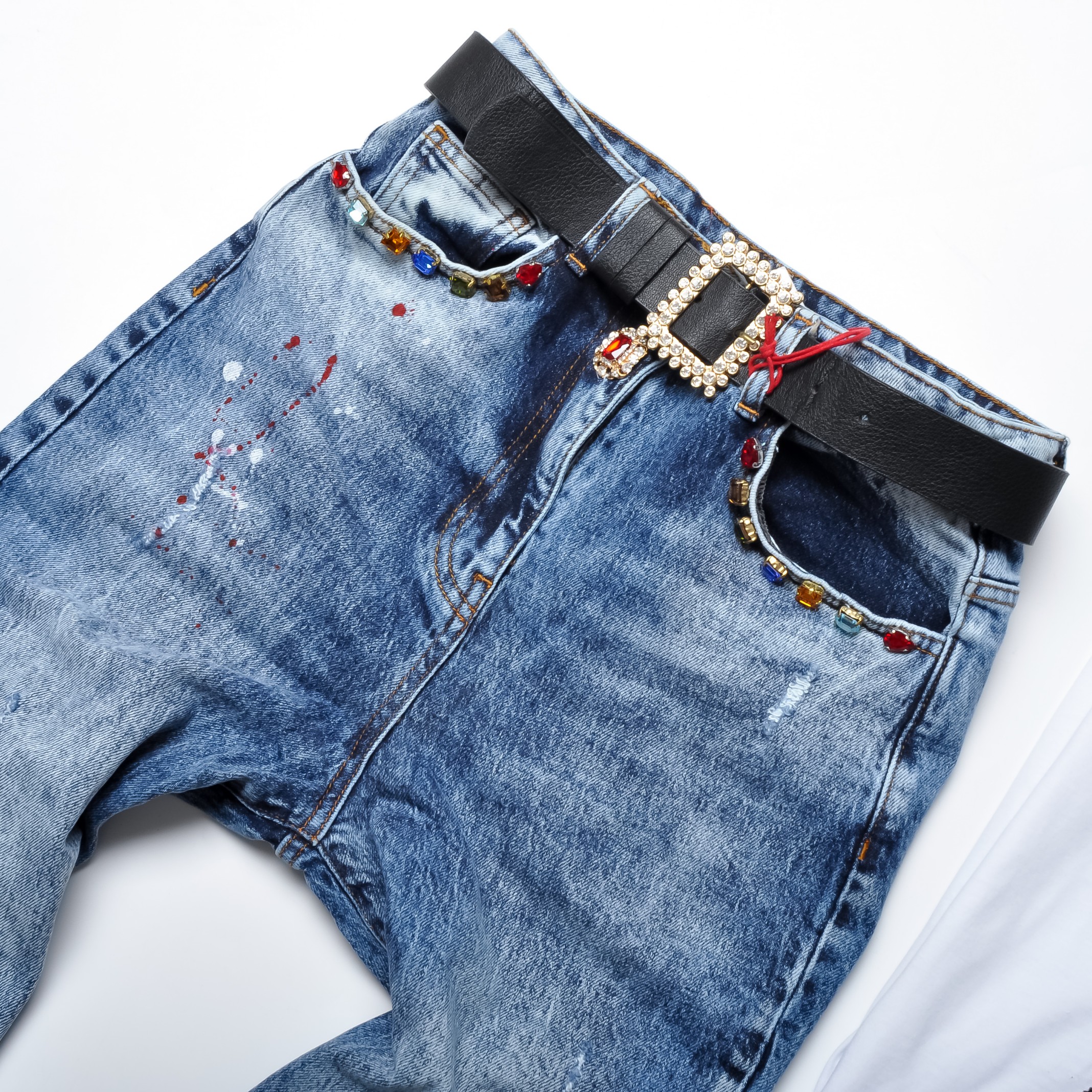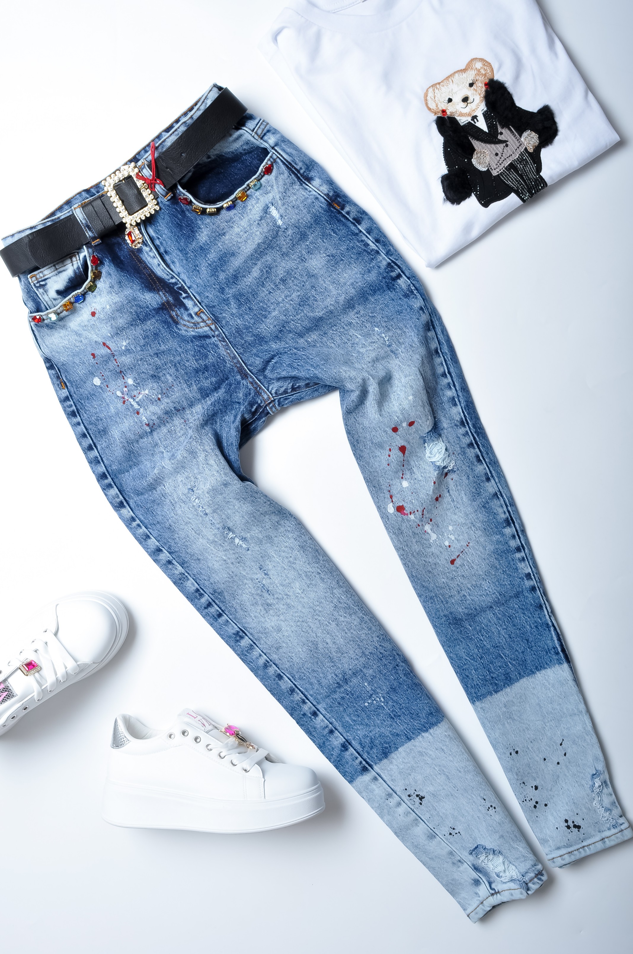 Jeansy w niebieskim kolorze. Zapinane na zamek oraz guziczek. Z przodu i z tyłu dwie kieszenie. Zdobione przetarciami, efektem farbki i cyrkoniami. Dołem jaśniejsze. Do zestawu pasek z cyrkoniową klamrą.