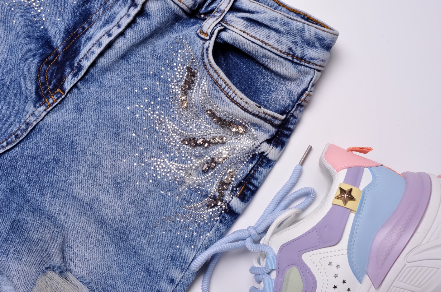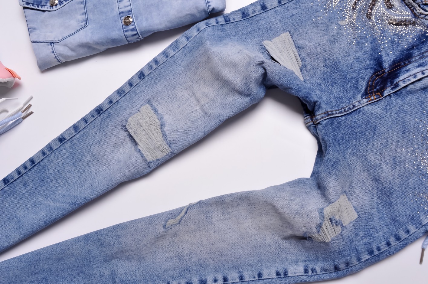 Jeansy w niebieskim kolorze. Zapinane na zamek oraz guziczek. Z przodu i z tyłu dwie kieszenie. Zdobione przetarciami, dziurami i cyrkoniami. Do zestawu pasek.