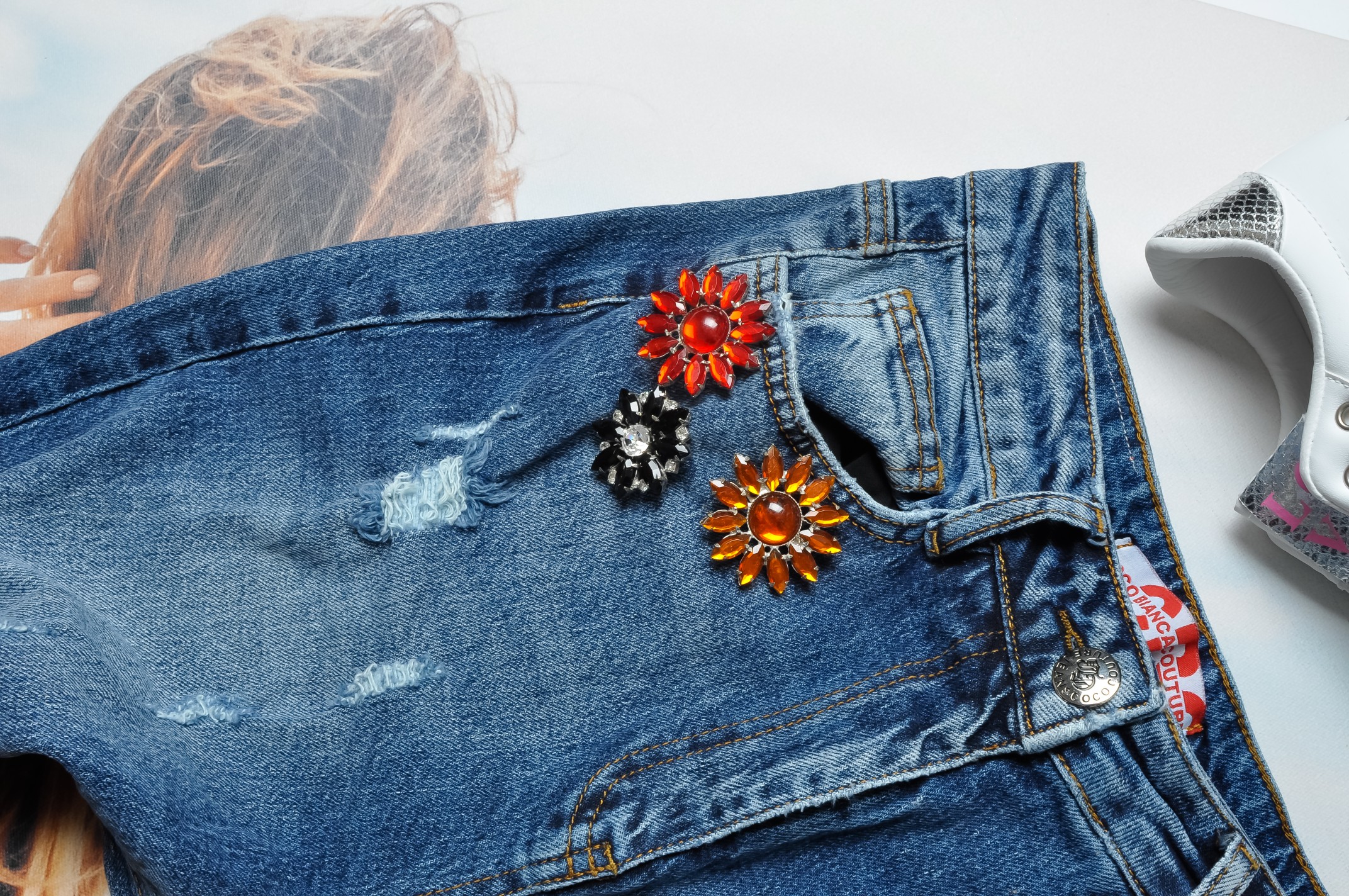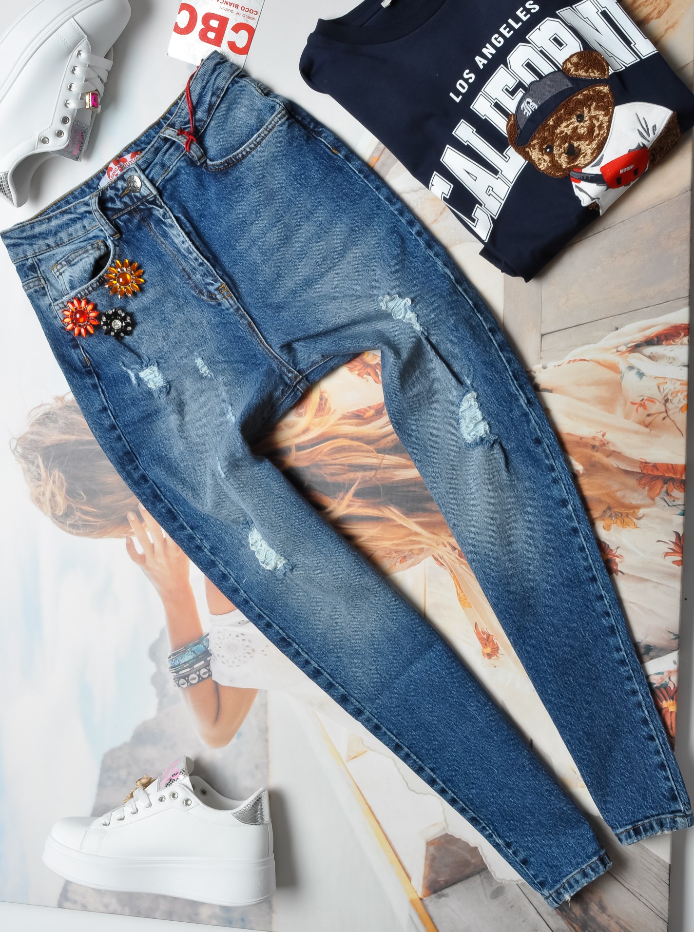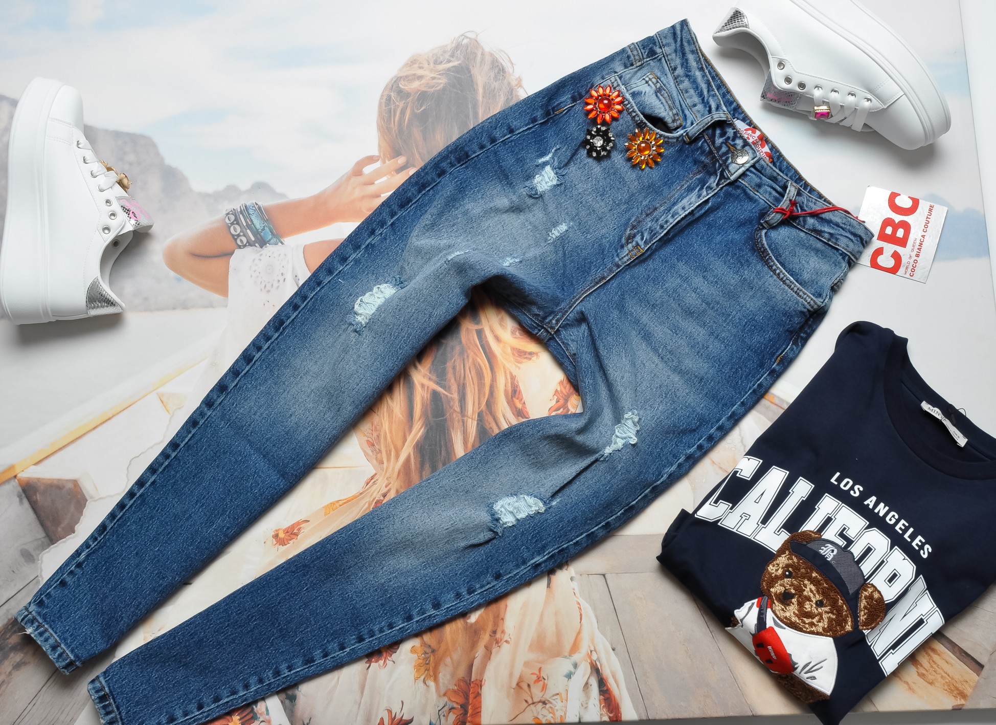 COCO BIANCA - JEANSOWE SPODNIE Z DZIURAMI - OZDOBNE AGRAFKI