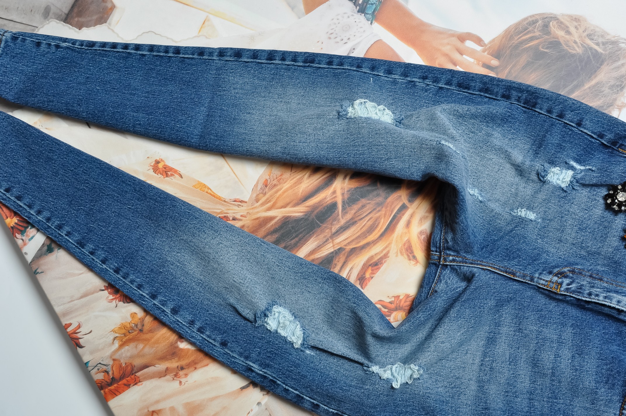 Jeansy w niebieskim kolorze. Zapinane na zamek oraz guziczek. Z przodu i z tyłu dwie kieszenie. Zdobione przetarciami i dziurami. Z prawej strony na kieszeni zdobione agrafkami z kwiatuszkami. Nogawki lekko zwężane.
