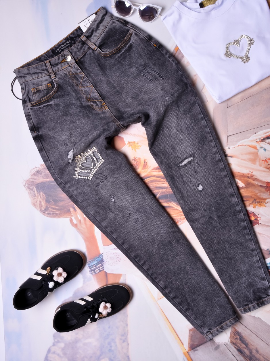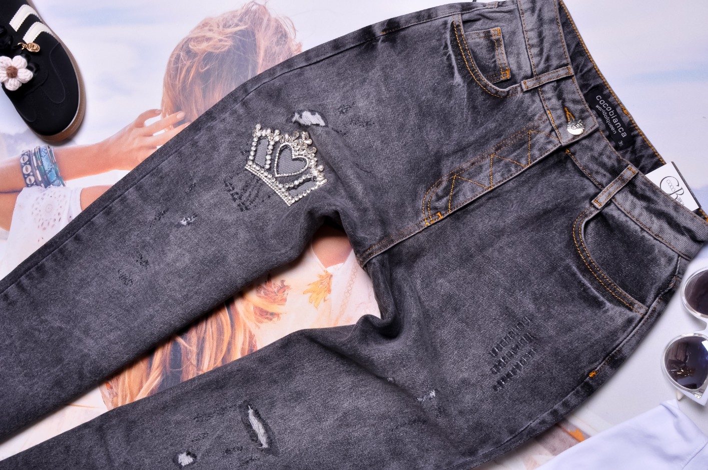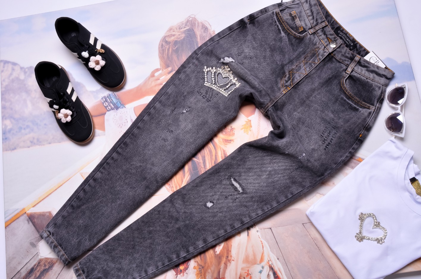 Jeansy w szarym kolorze. Zapinane na zamek oraz guziczek. Z przodu i z tyłu dwie kieszenie. Zdobione przetarciami i cyrkoniową koroną. Z tyłu na kieszeni cyrkoniowy napis.