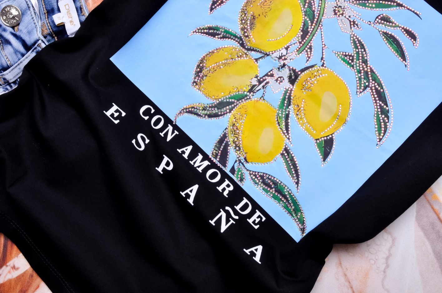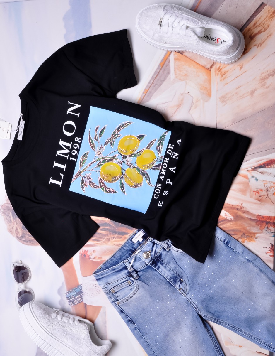 CZARNA BLUZKA - APLIKACJA CYTRYN - NAPISY - CYRKONIE