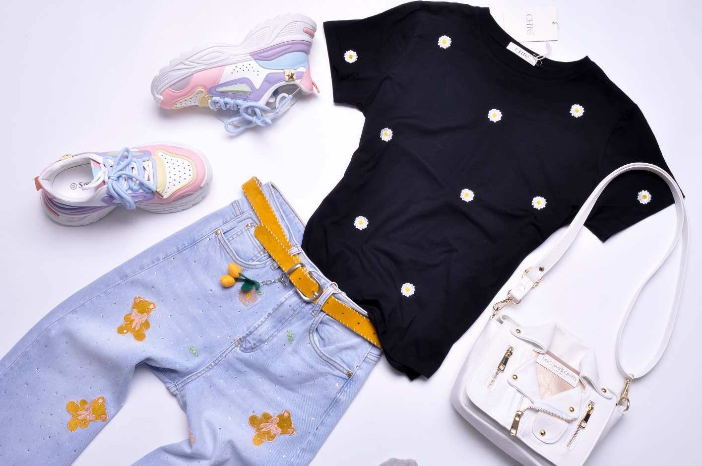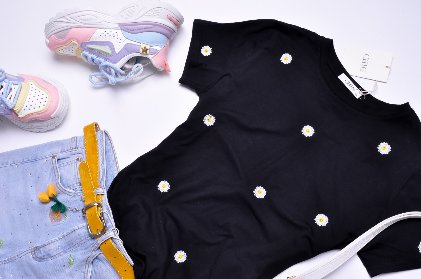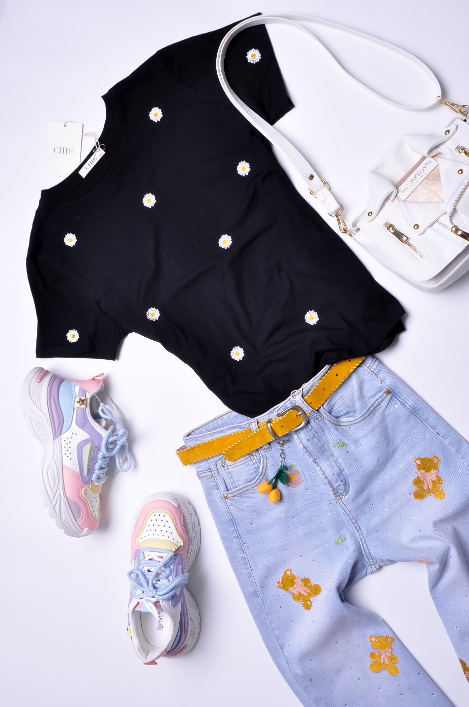 Bluzka w czarnym kolorze. Wkładana przez głowę. Dekolt okrągły. Rękawy krótkie. Zdobiona wyszywanymi stokrotkami.