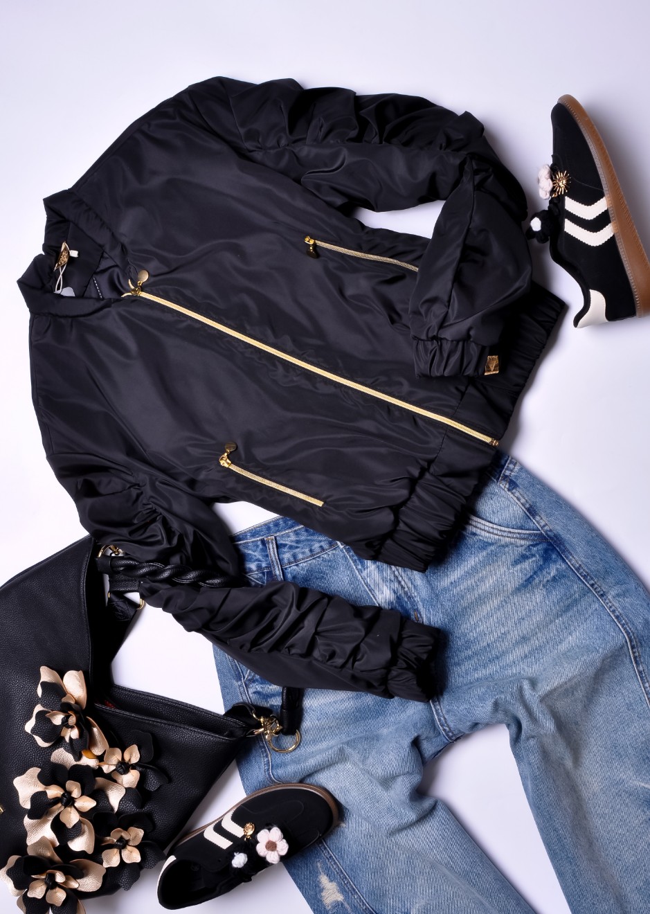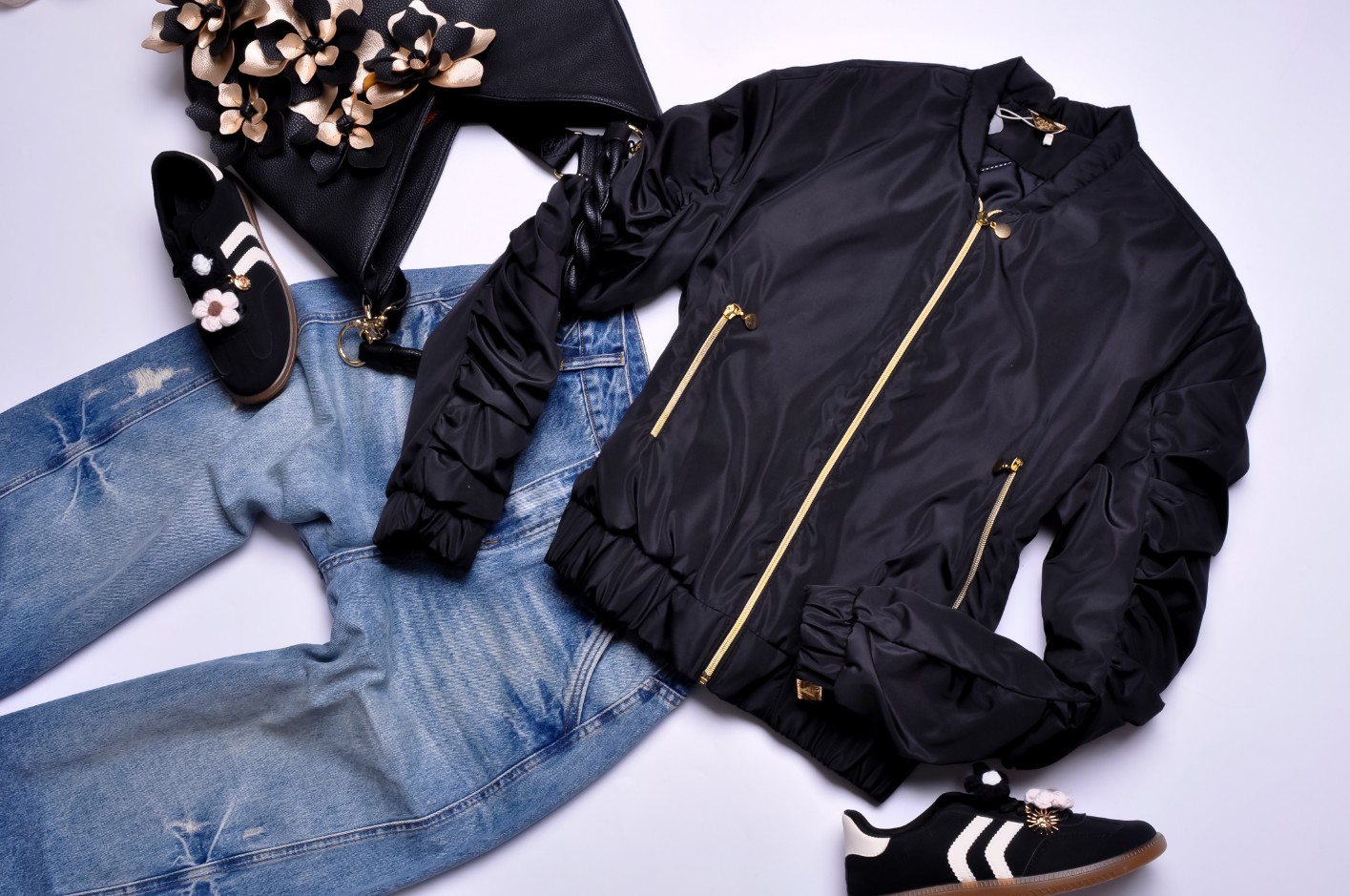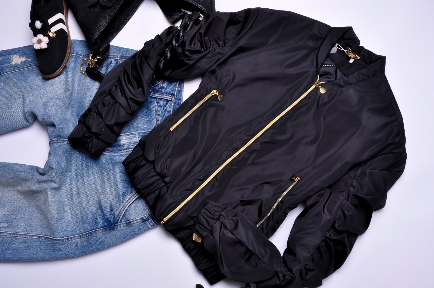 CZARNA KURTKA BOMBERKA - MARSZCZONE RĘKAWY