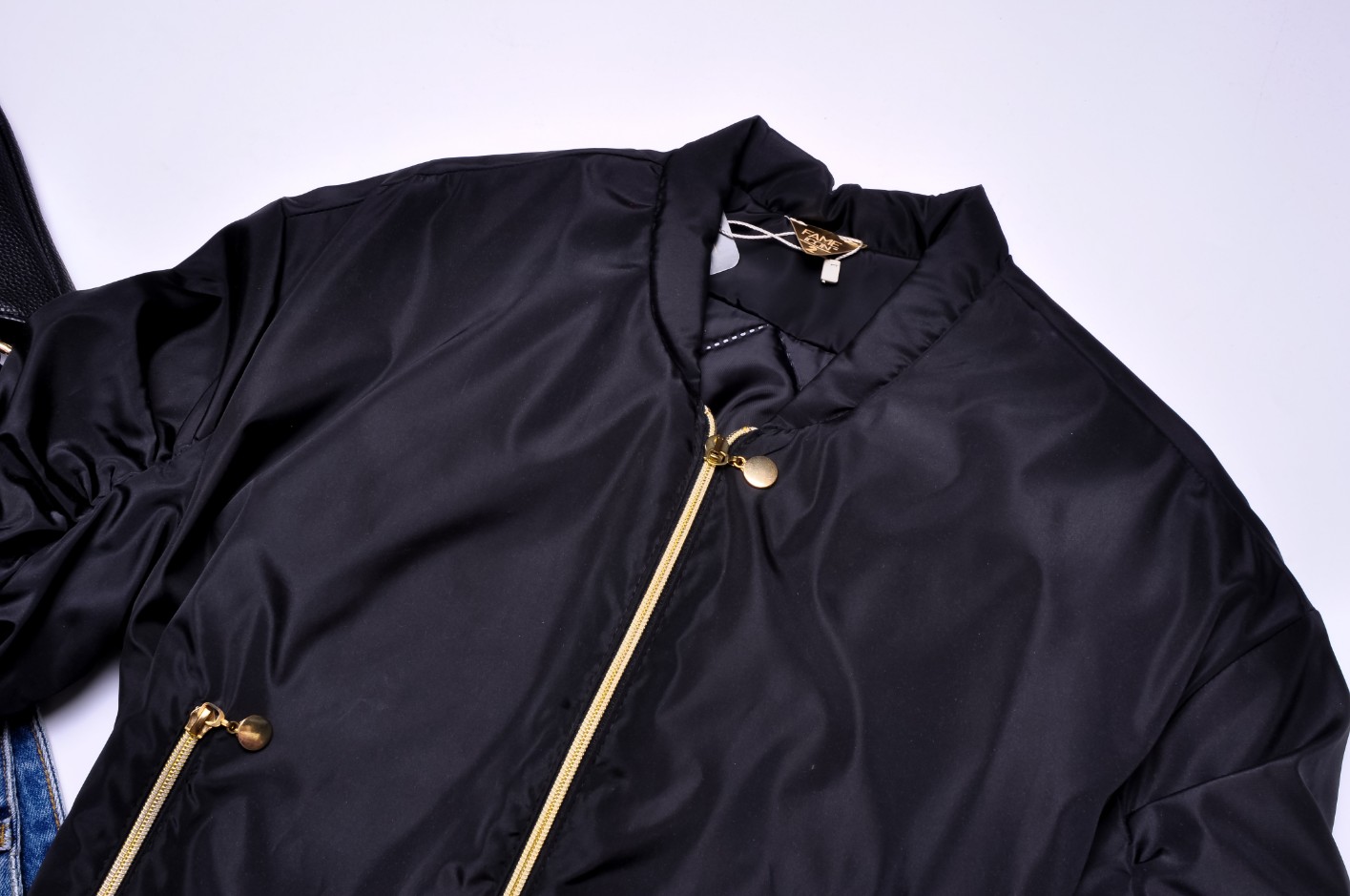 Materiałowa kurtka - bomberka w czarnym kolorze. Fason oversize, krótki. Na dole ściągacze. Zapinana na złoty zamek. Z przodu kieszonki. Długie, marszczone rękawy zakończone ściągaczami.