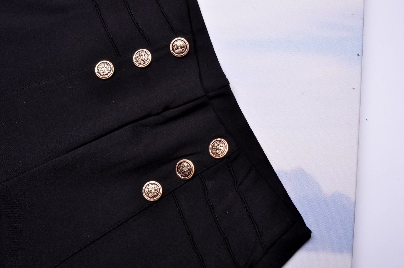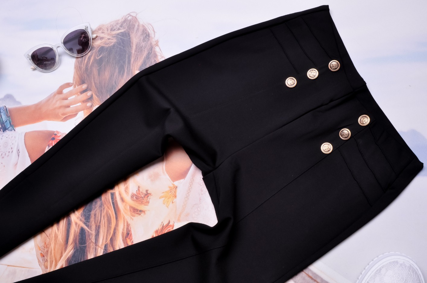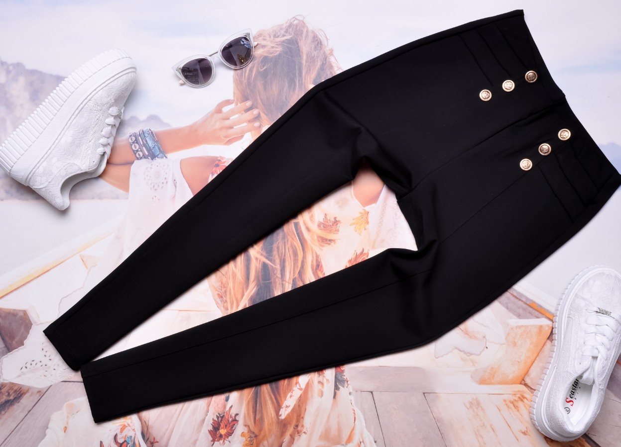 Legginsy materiałowe o prostym przylegającym fasonie. Nogawki lekko zwężane. Wysoki stan. Z przodu ozdobne złote guziczki i przeszycia.