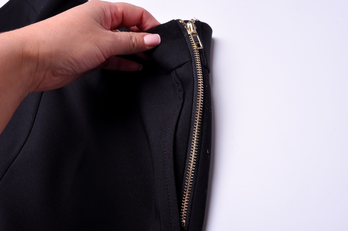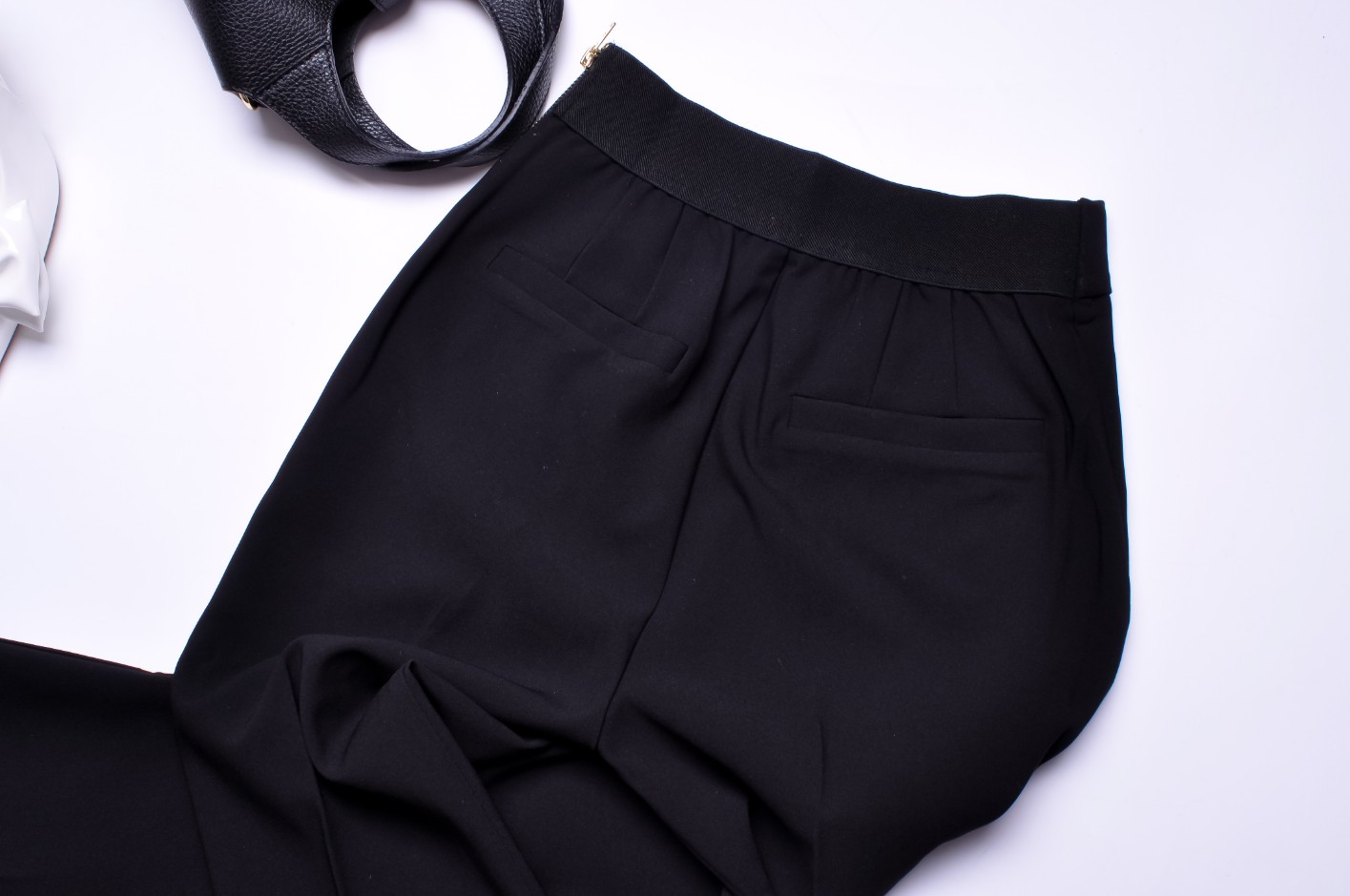 Czarne, eleganckie spodnie z wysokim stanem - typu "FLARE". Z kantem. Zapinane na zamek, który jest z boku. Z tyłu gumka w talii. Kieszenie po bokach.