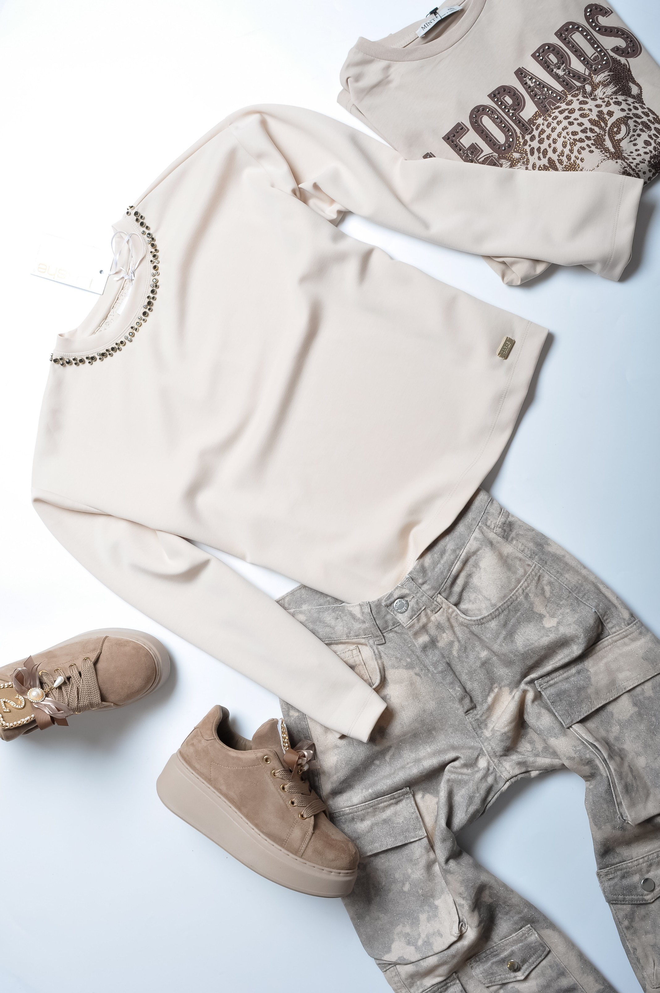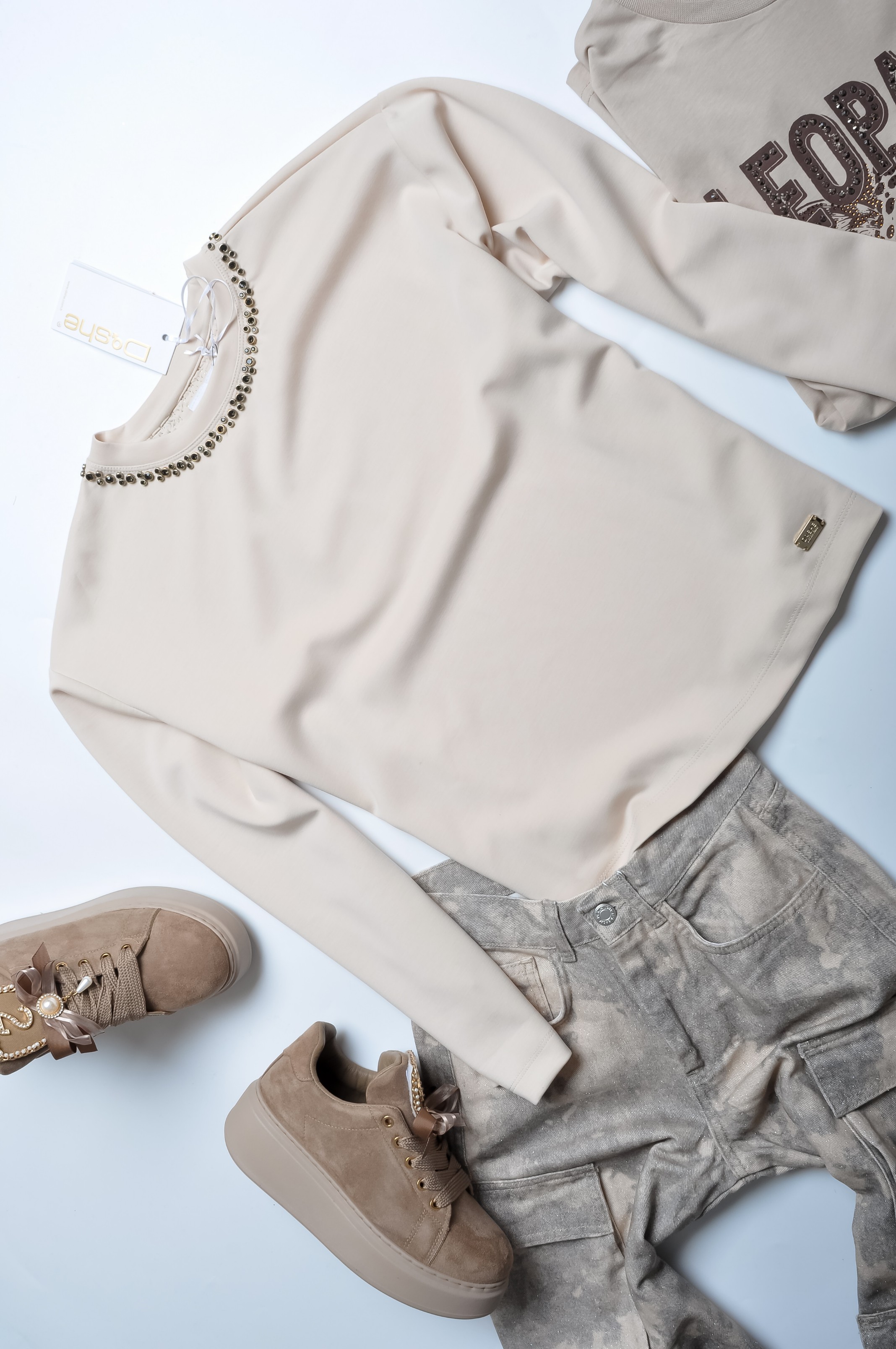 DI'SHE BEŻOWA SWOBODNA BLUZA Z CZARNYMI CYRKONIAMI