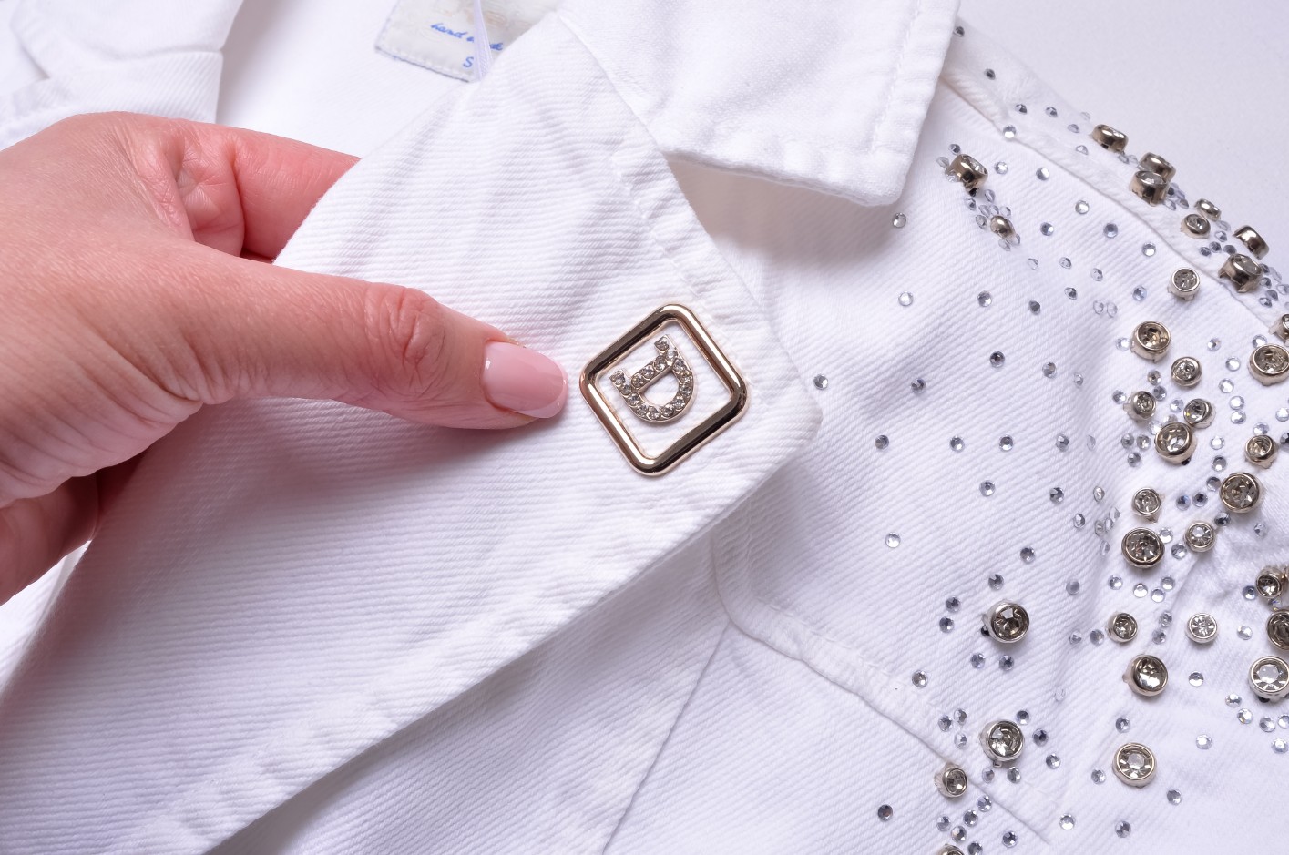 Bogato zdobiona cyrkoniami na ramionach. Kołnierzyk zdobiony złotym emblematem "D" wypełnionym cyrkoniami. Z tyłu rozcięcie. Do zestawu biały paseczek.