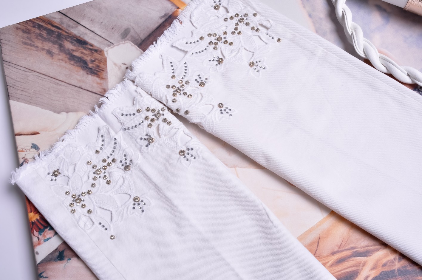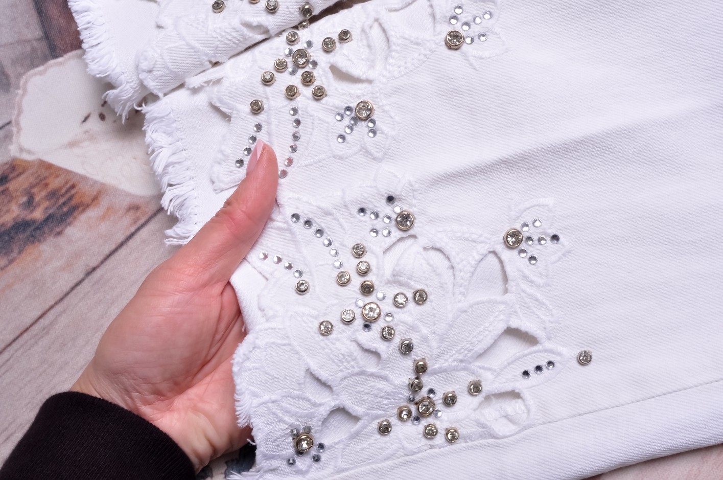 Z tyłu na kieszonce blaszka logowana. Nogawki dołem poszarpane, zdobione wyszywanymi kwiatami i cyrkoniami.