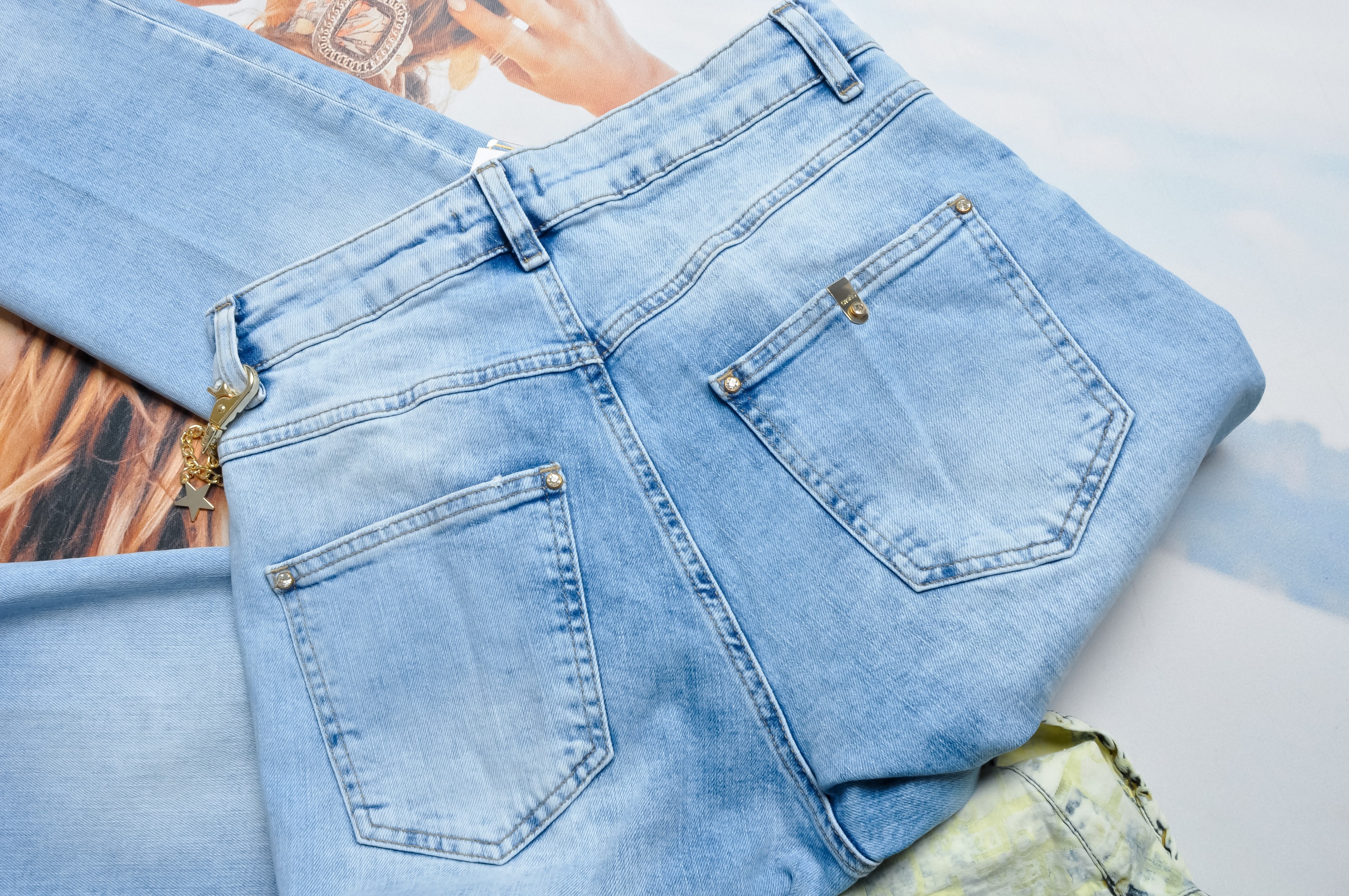 Błękitne jeansowe spodnie z delikatnie zwężanymi nogawkami. Stan spodni wysoki. Z przodu i z tyłu dwie kieszenie.