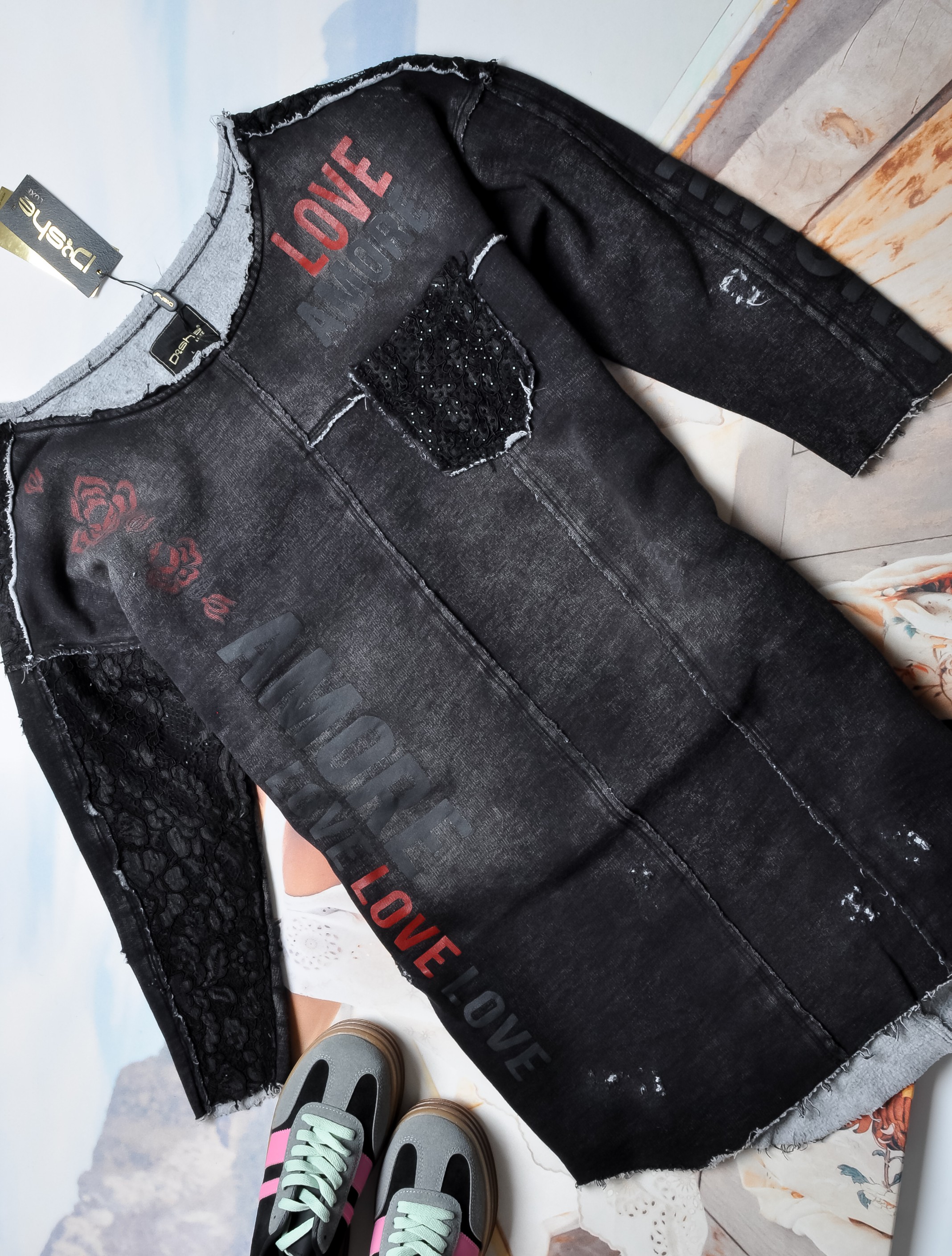 Urokliwa sukienka w ciemnym kolorze. Wkładana przez głowę. Dekolt okrągły, rękawy długie. Wykończona surowo. Fason swobodny. Zdobiona cyrkoniami na kieszonce.