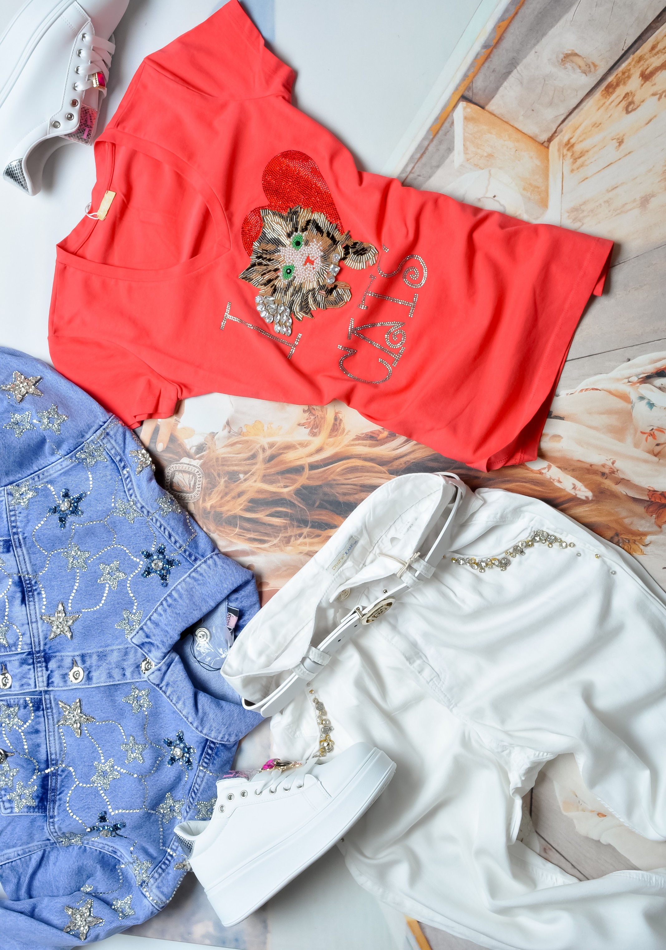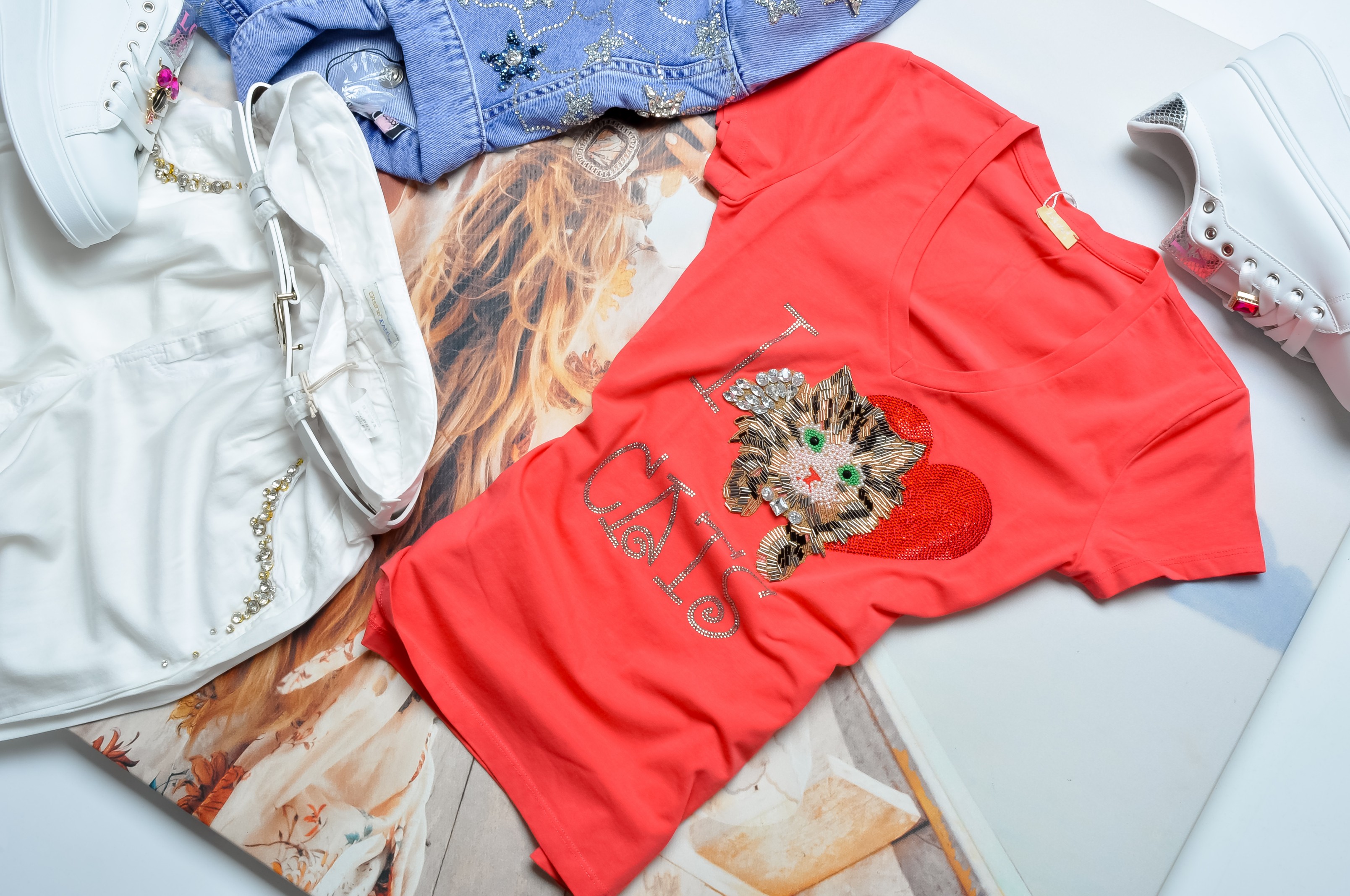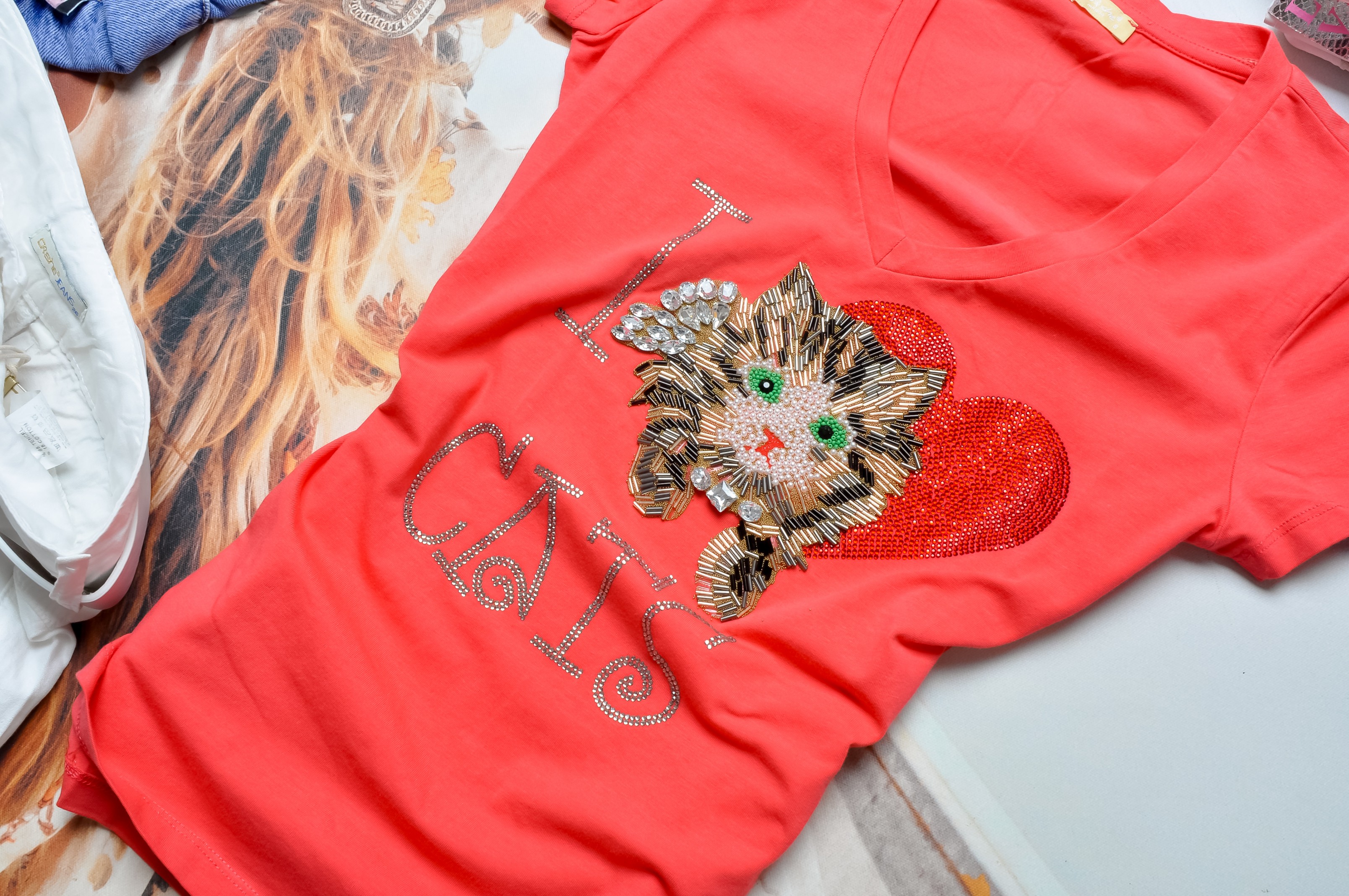 Śliczna bluzeczka w czerwonym kolorze. Wkładana przez głowę. Dekolt na "V". Rękawy krótkie. Fason przylegający. Zdobiona aplikacją kota i napisów wykończonych cyrkoniami, perełkami i koralikami.