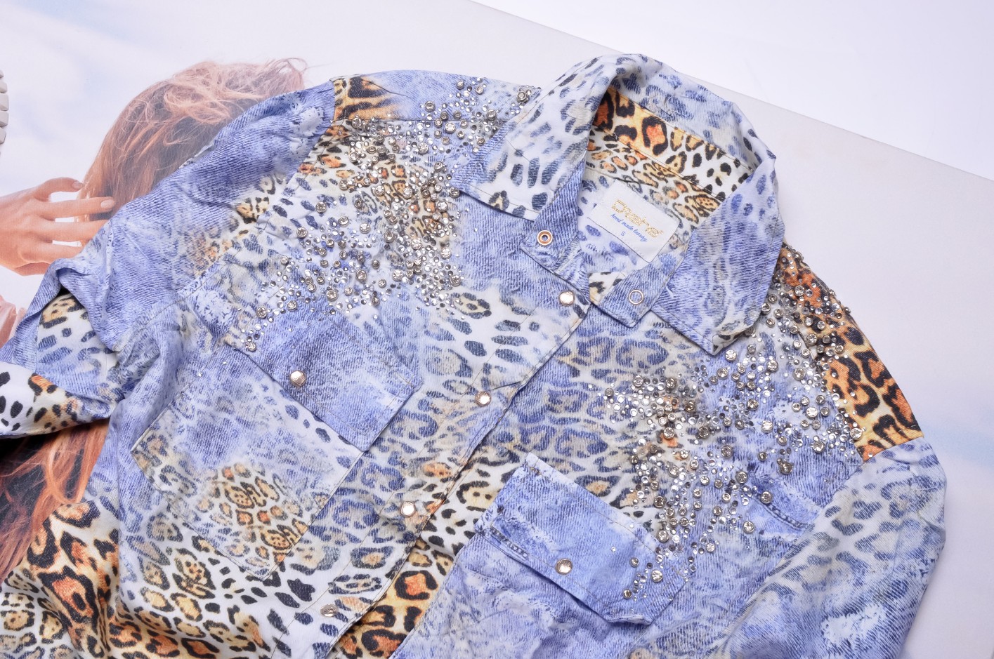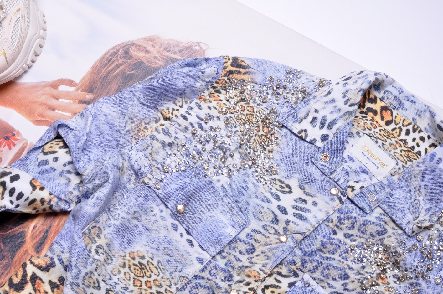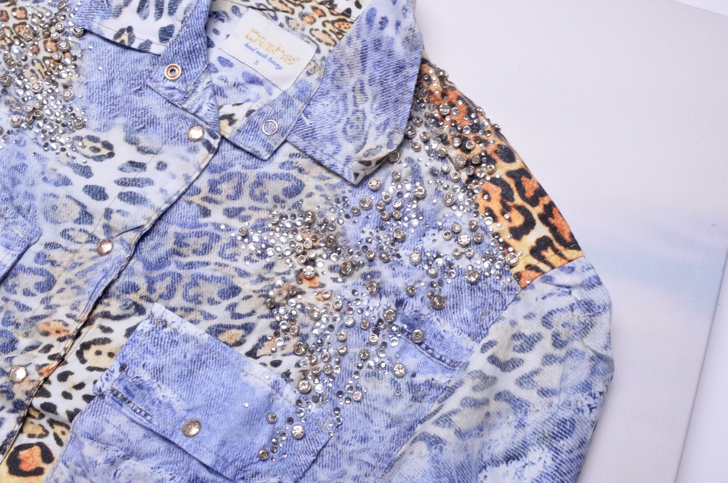 Jeansowa koszula wykończona motywem panterki i przetarć. Zapinana na złote napy. Fason luźny, prosty. Rękawy długie wykończone mankietem. Z przodu dwie kieszenie. Na ramionach zdobiona cyrkoniami.
