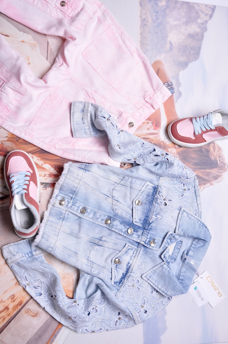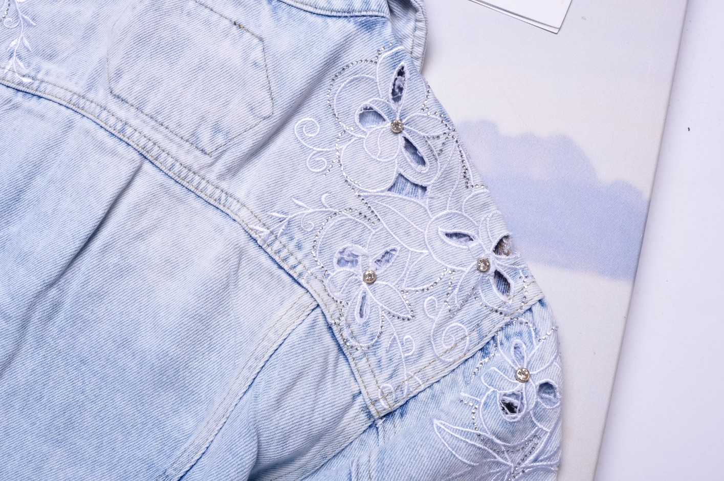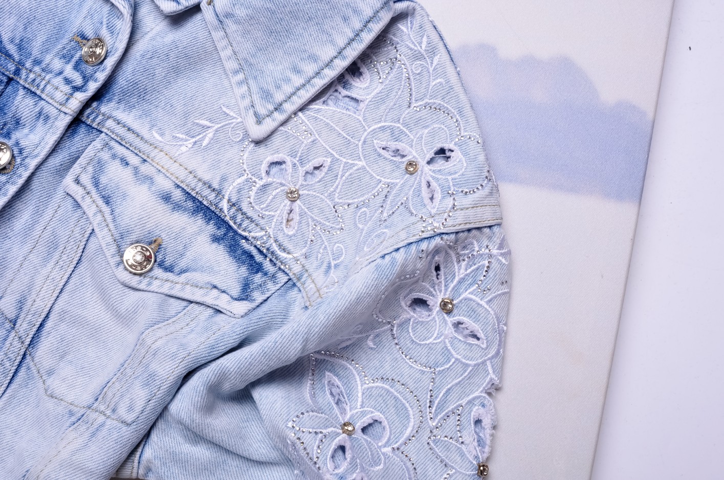 Jeansowa kurteczka zapinana na guziki, o fasonie swobodnym. Obniżona linia ramion. Z przodu dwie kieszonki. Na ramionach i rękawach zdobiona haftowanymi kwiatami i cyrkoniami. Rękawy mają dziury imitujące płatki kwiatów. Dołem surowo zakończona.