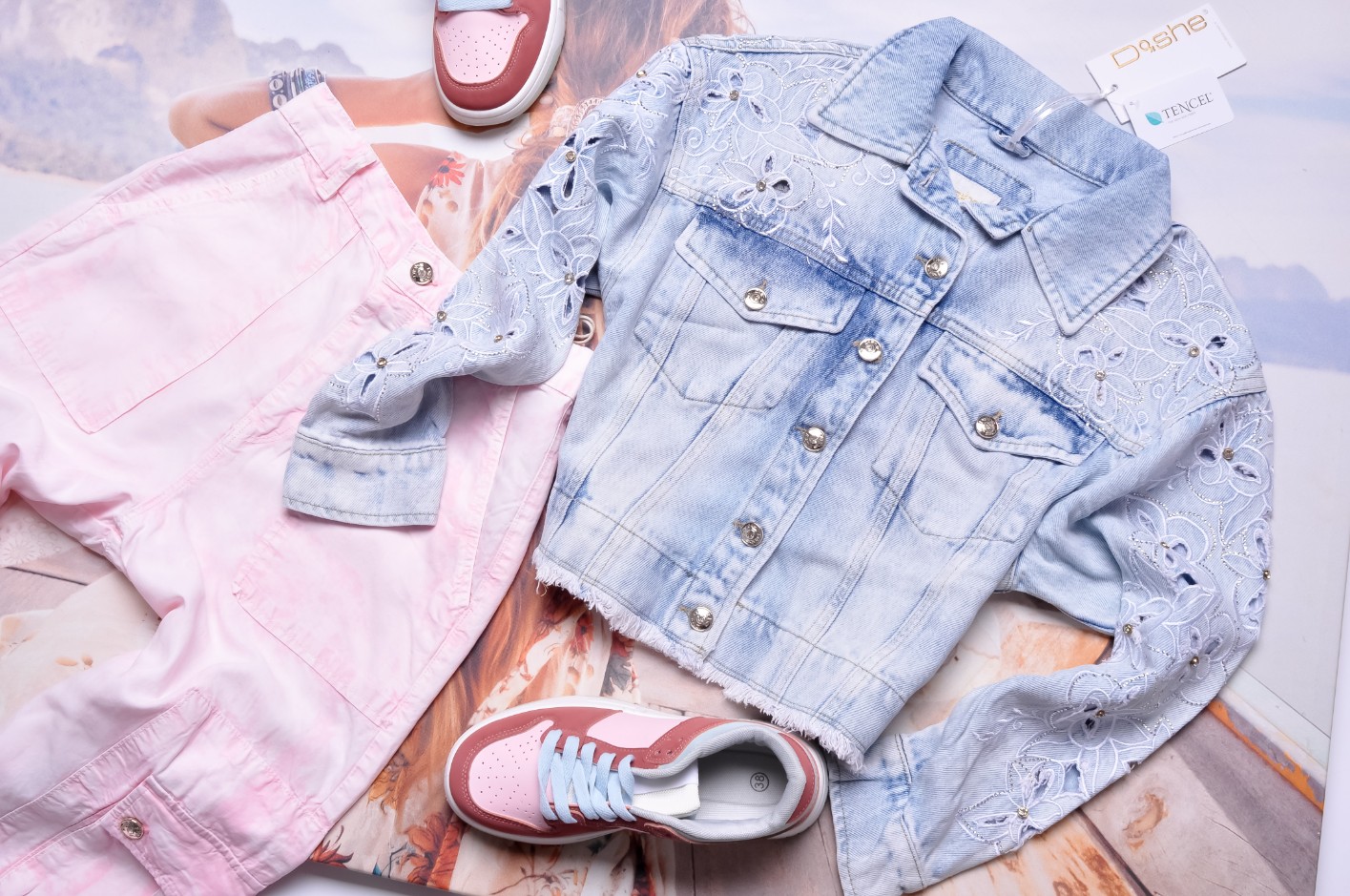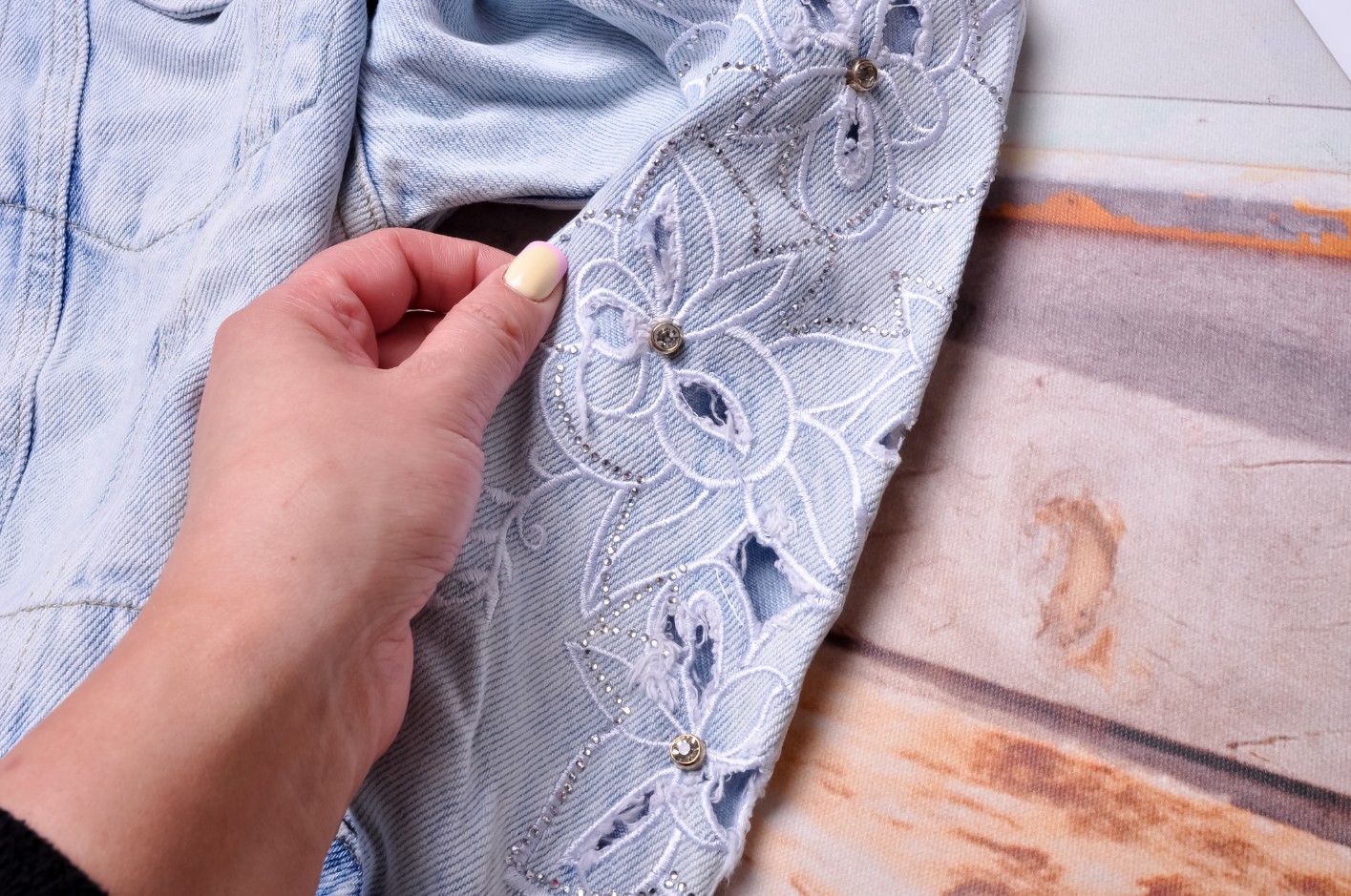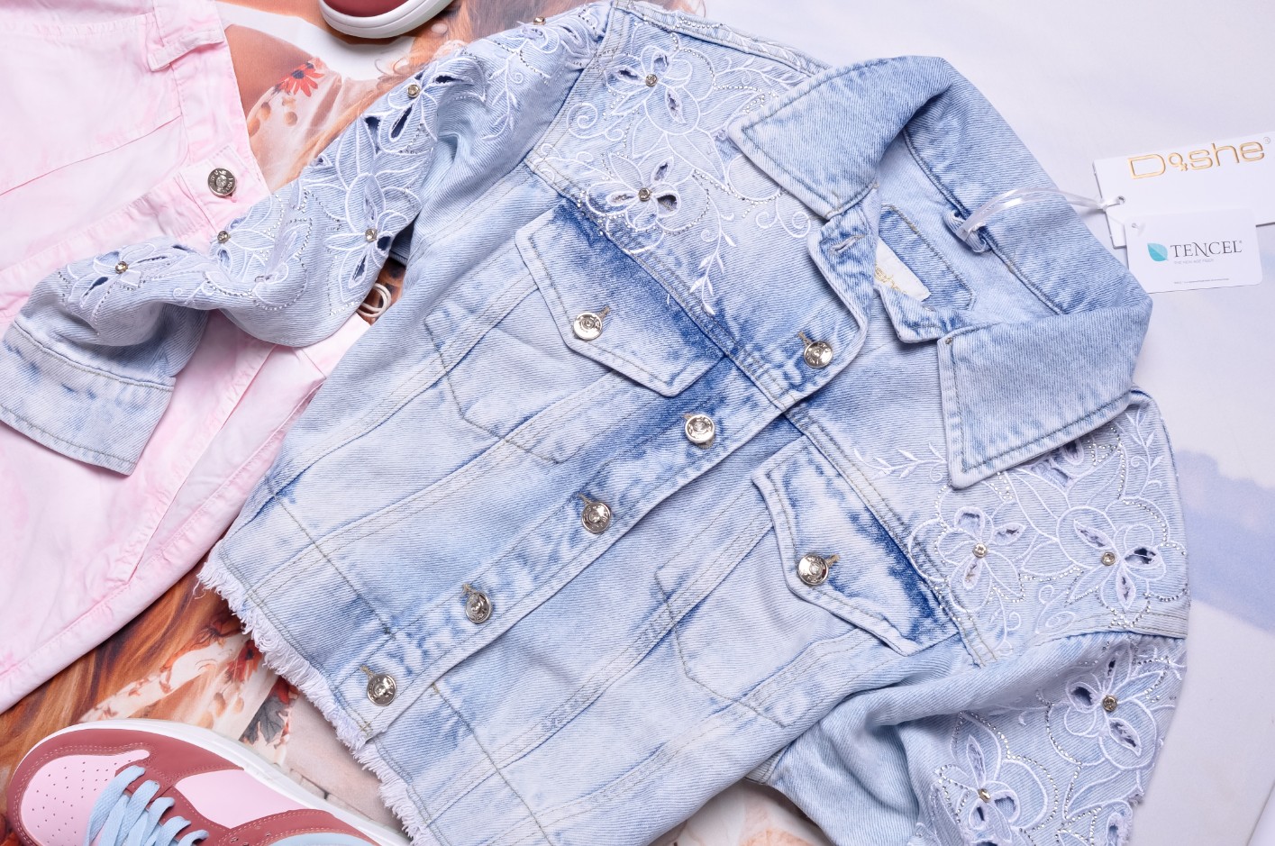 Jeansowa kurteczka zapinana na guziki, o fasonie swobodnym. Obniżona linia ramion. Z przodu dwie kieszonki. Na ramionach i rękawach zdobiona haftowanymi kwiatami i cyrkoniami. Rękawy mają dziury imitujące płatki kwiatów. Dołem surowo zakończona.