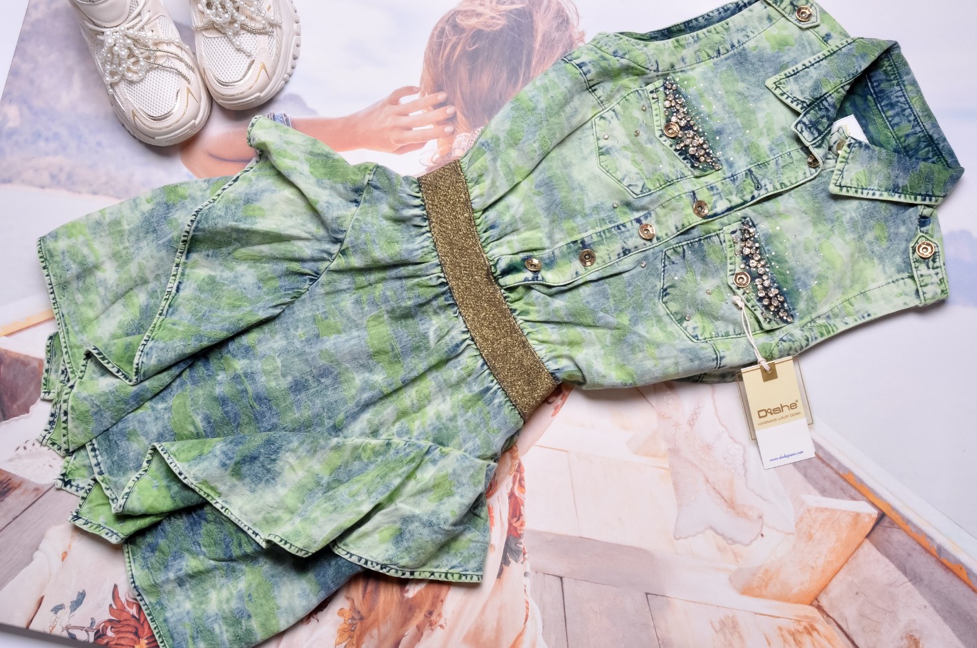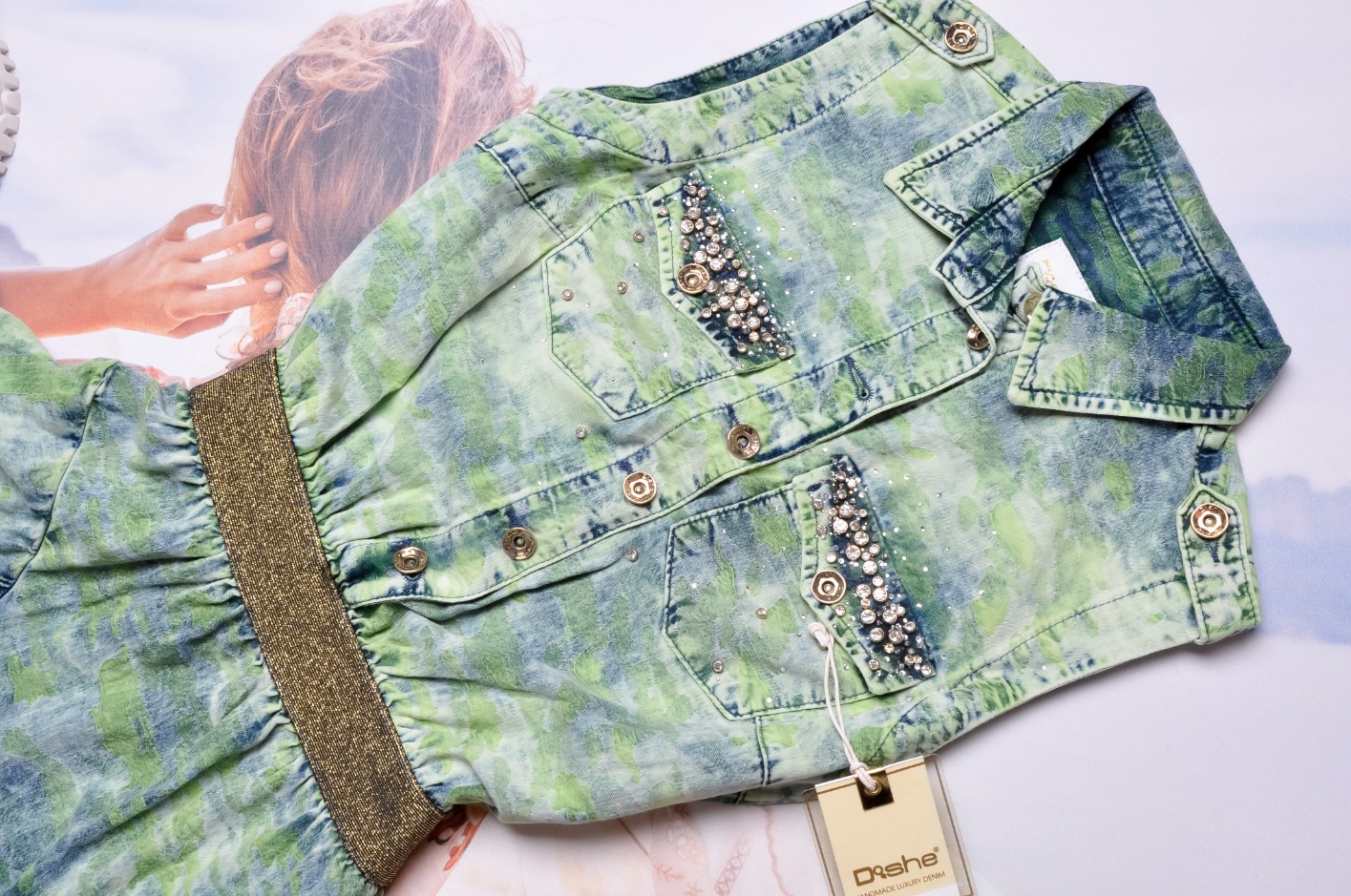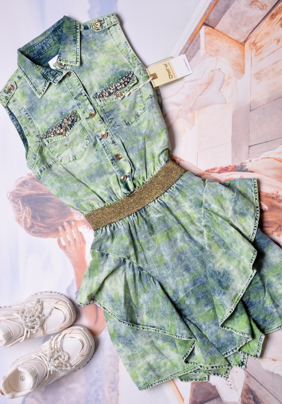 Krótka sukienka jeansowa w print neonowo - zielonego moro. Zapinana na złote guziki, taliowana, z kołnierzykiem . Kieszonki z przodu zdobione cyrkoniami. Na szerokich ramiączkach. W talii szeroka gumka wykończona błyszczącymi, złotymi nićmi. Dołem rozkloszowana, z falbankami.