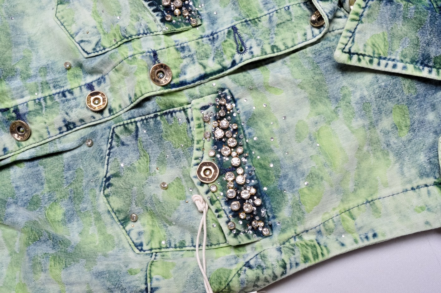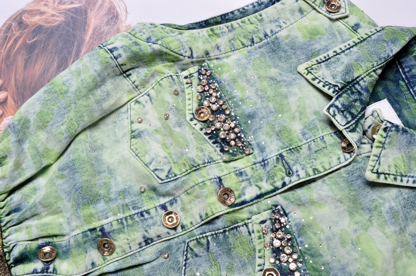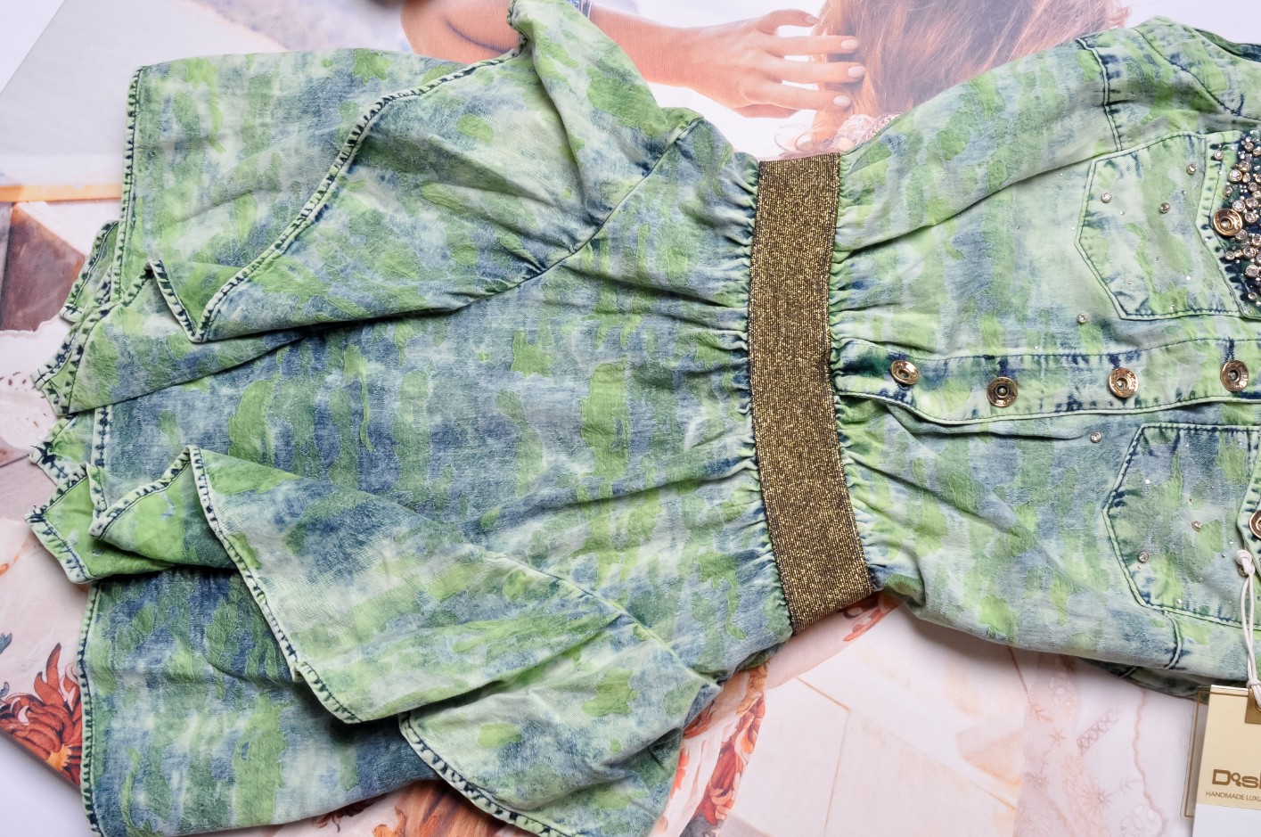 Krótka sukienka jeansowa w print neonowo - zielonego moro. Zapinana na złote guziki, taliowana, z kołnierzykiem . Kieszonki z przodu zdobione cyrkoniami. Na szerokich ramiączkach. W talii szeroka gumka wykończona błyszczącymi, złotymi nićmi. Dołem rozkloszowana, z falbankami.