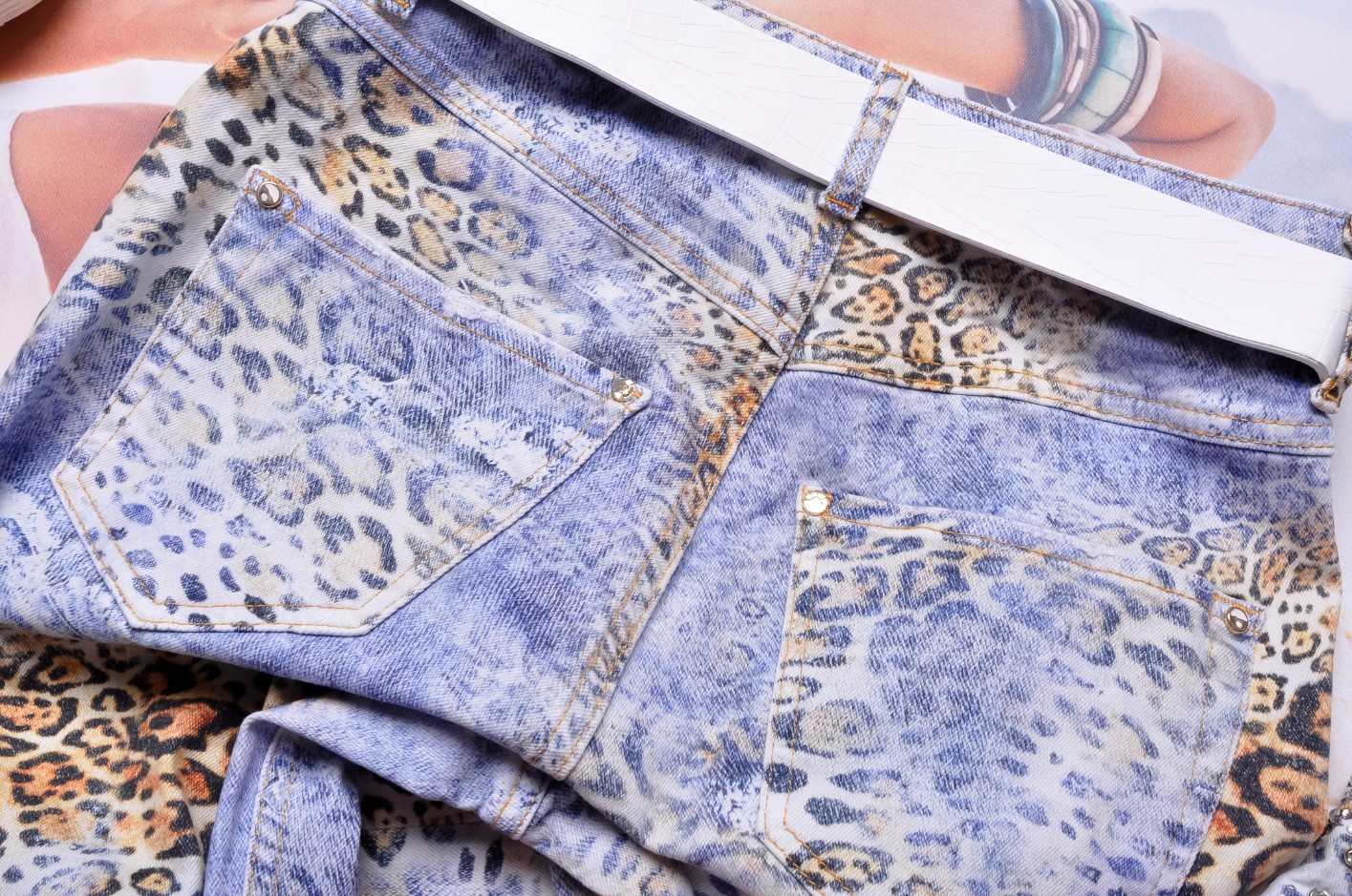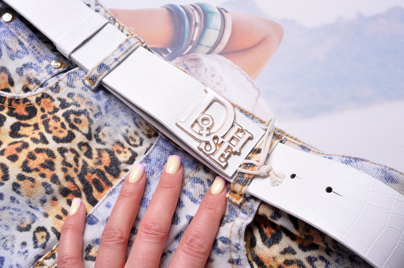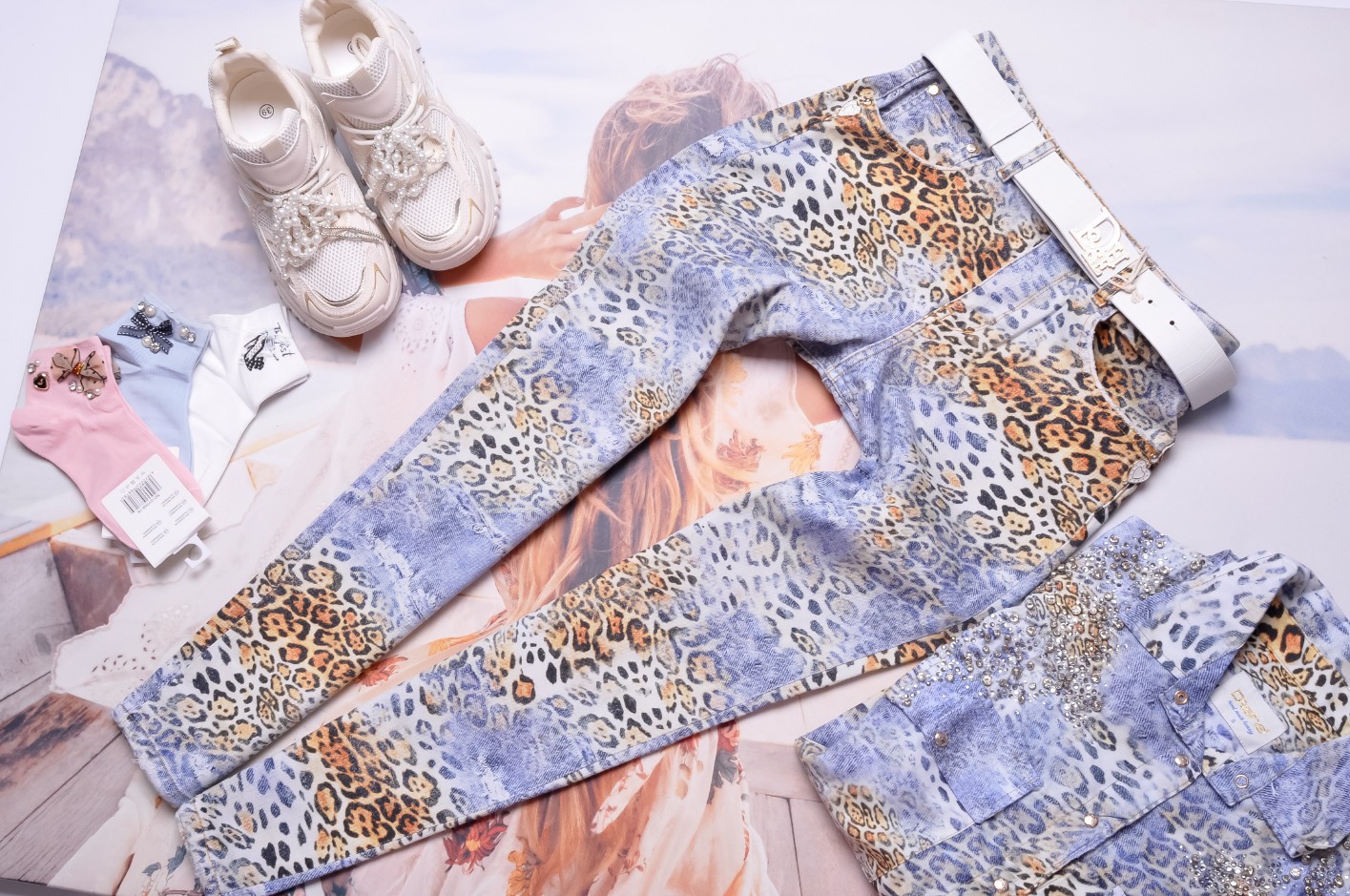 Jasne spodnie o fasonie "MOM FIT". Nogawki zwężane. Spodnie jeansowe z motywem panterki i przetarć. Stan spodni wysoki. Spodnie zapinane na guzik i suwak. Z przodu oraz z tyłu spodnie posiadają dwie kieszenie. Do zestawu biały pasek.
