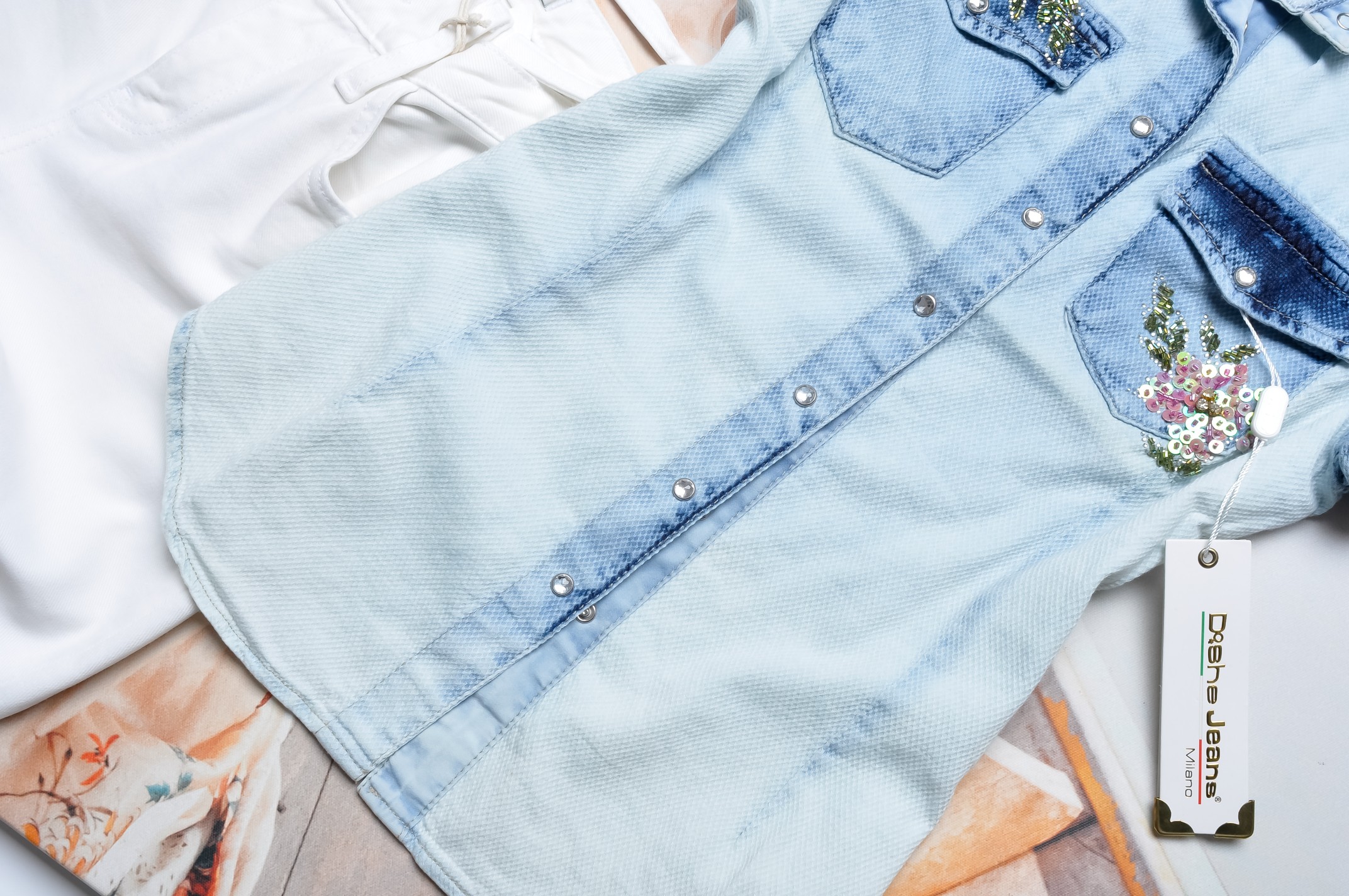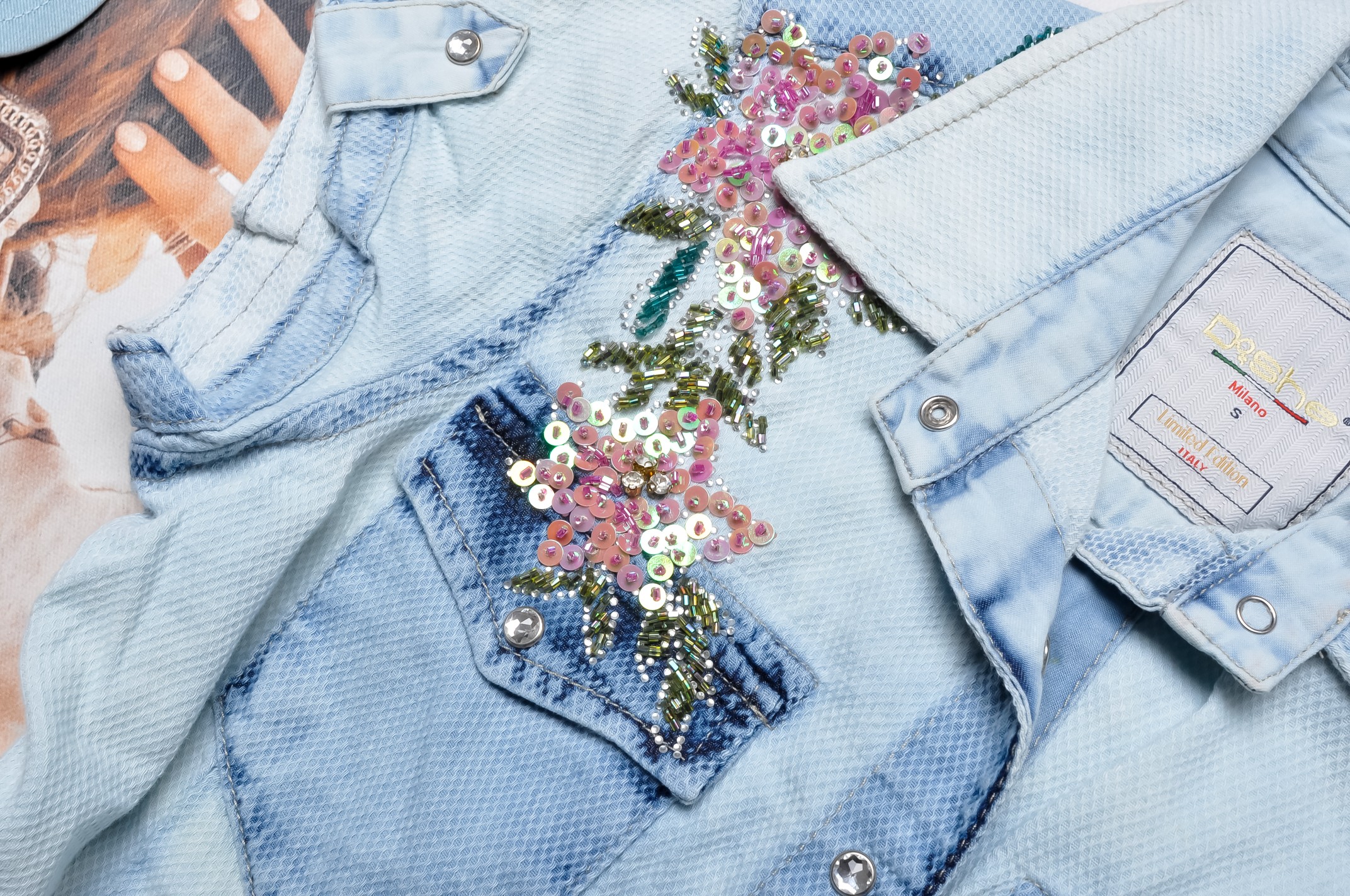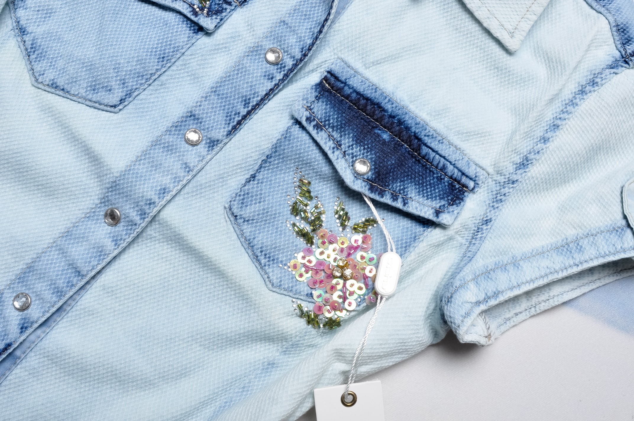 Koszula w motywie a'la jeansu. Zapinana na cyrkoniowe napy. Fason dopasowany. Krótki rękaw. Zdobiona kwiatami z cekinów. Z przodu dwie kieszonki.