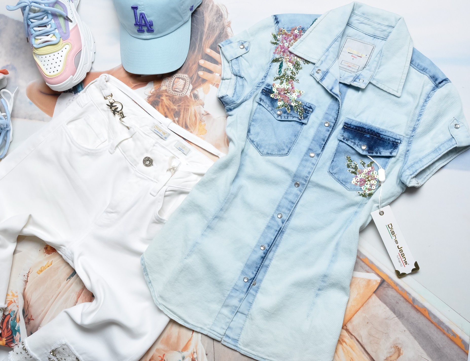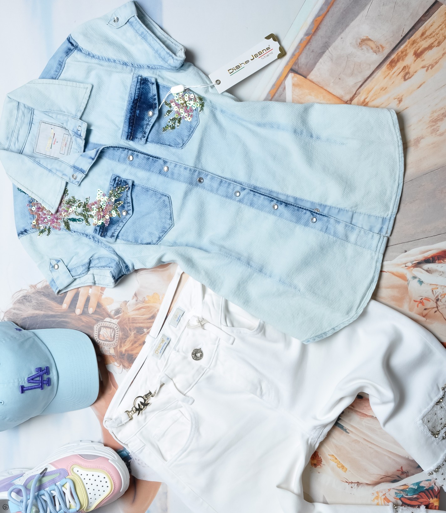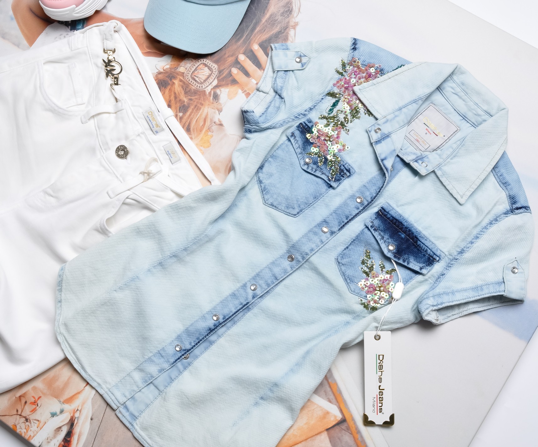 Koszula w motywie a'la jeansu. Zapinana na cyrkoniowe napy. Fason dopasowany. Krótki rękaw. Zdobiona kwiatami z cekinów. Z przodu dwie kieszonki.