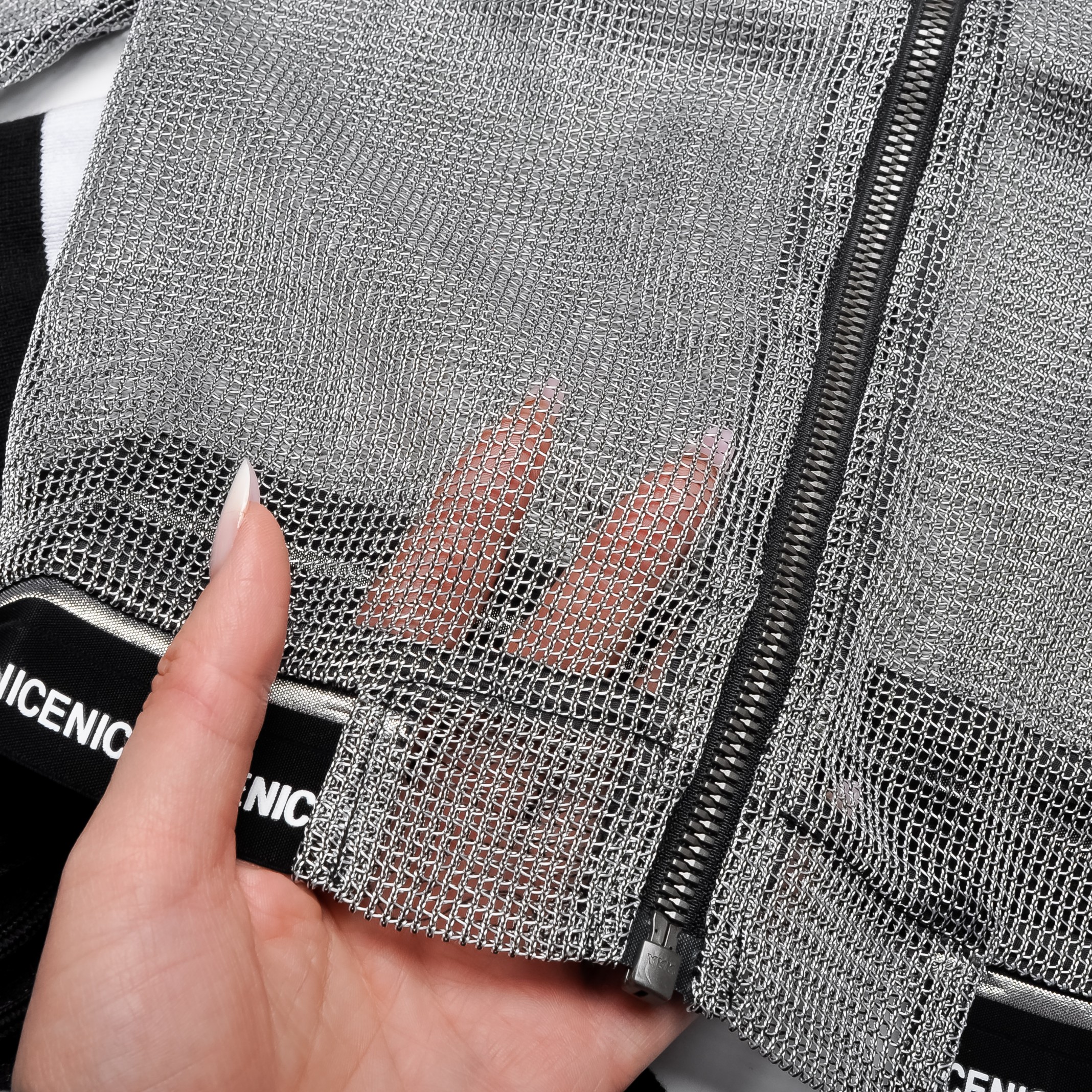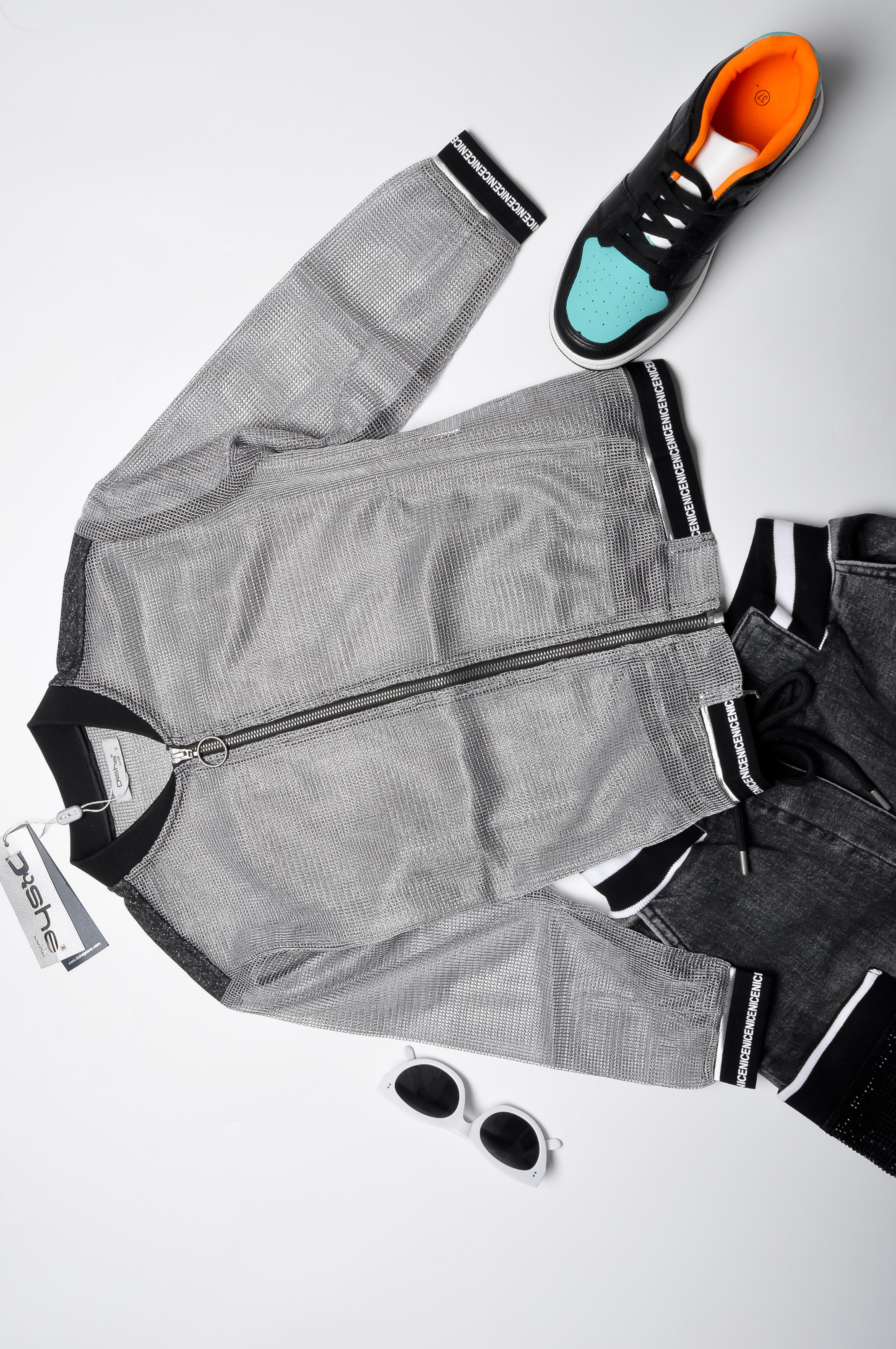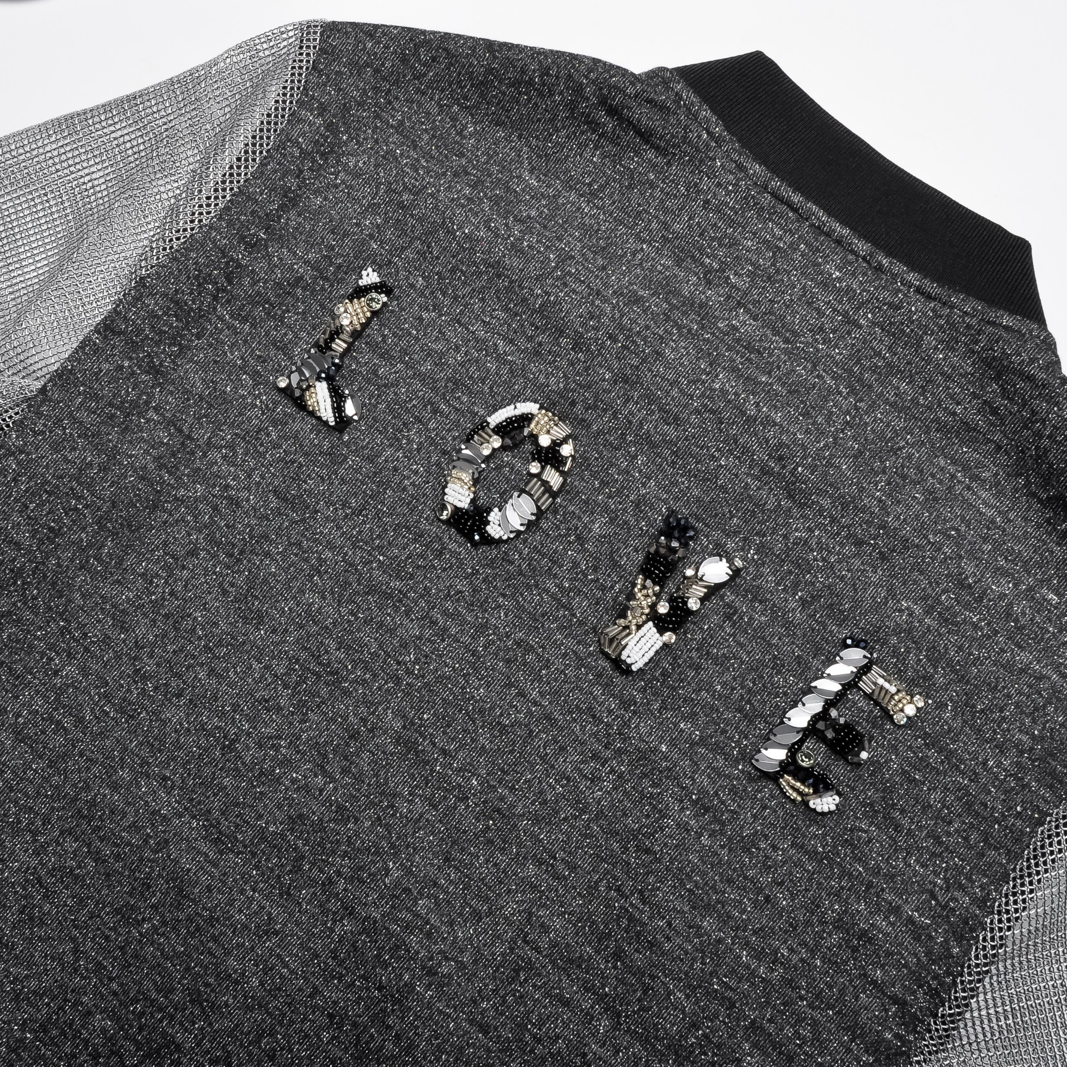 Bluza o fasonie swobodnym, w kolorze srebrnym, zapinana na zamek. Przód i rękawy siateczkowe, zakończone ściągaczami. Tył materiałowy, zdobiony błyszczącymi nićmi i cyrkoniowym napisem. Rękawy 3/4.