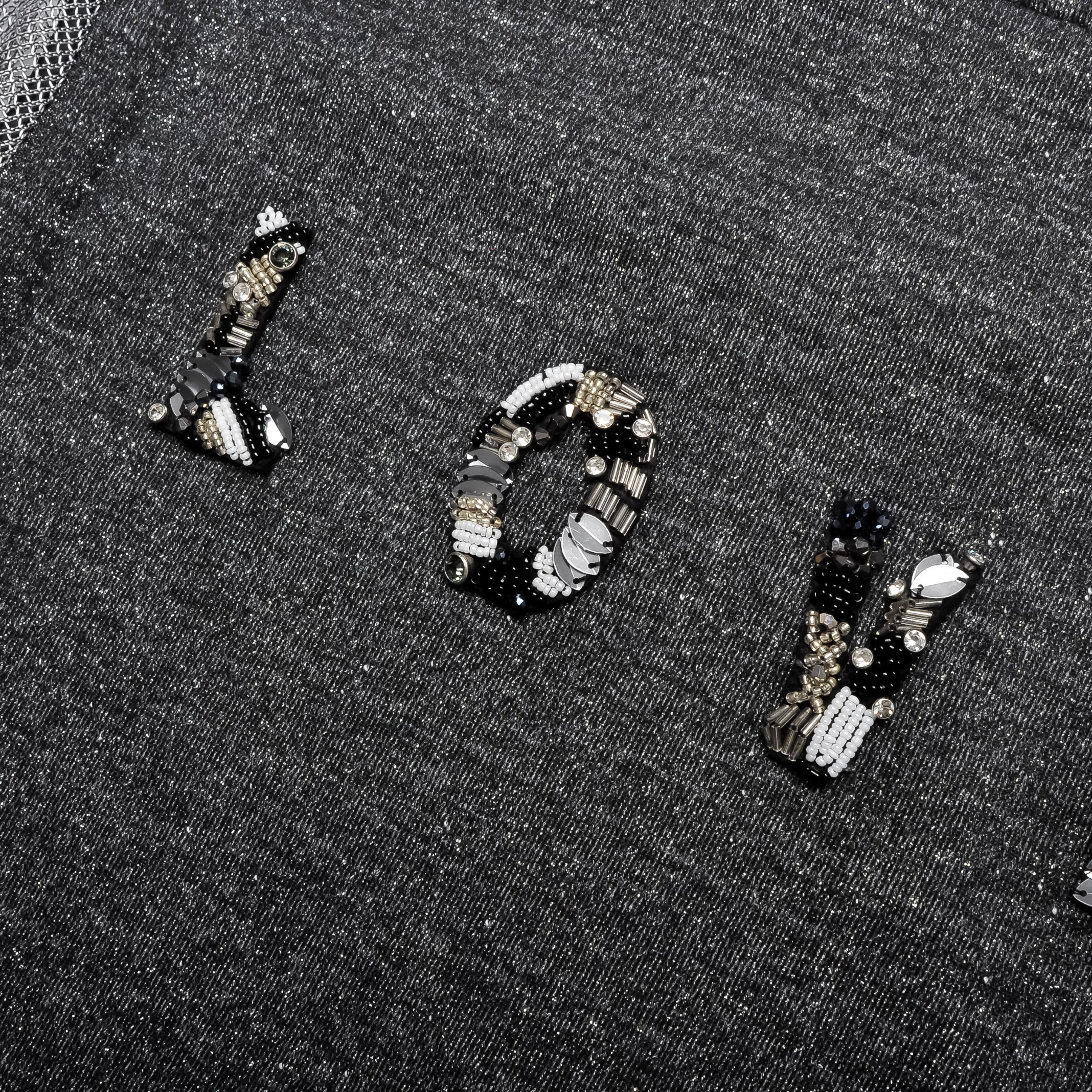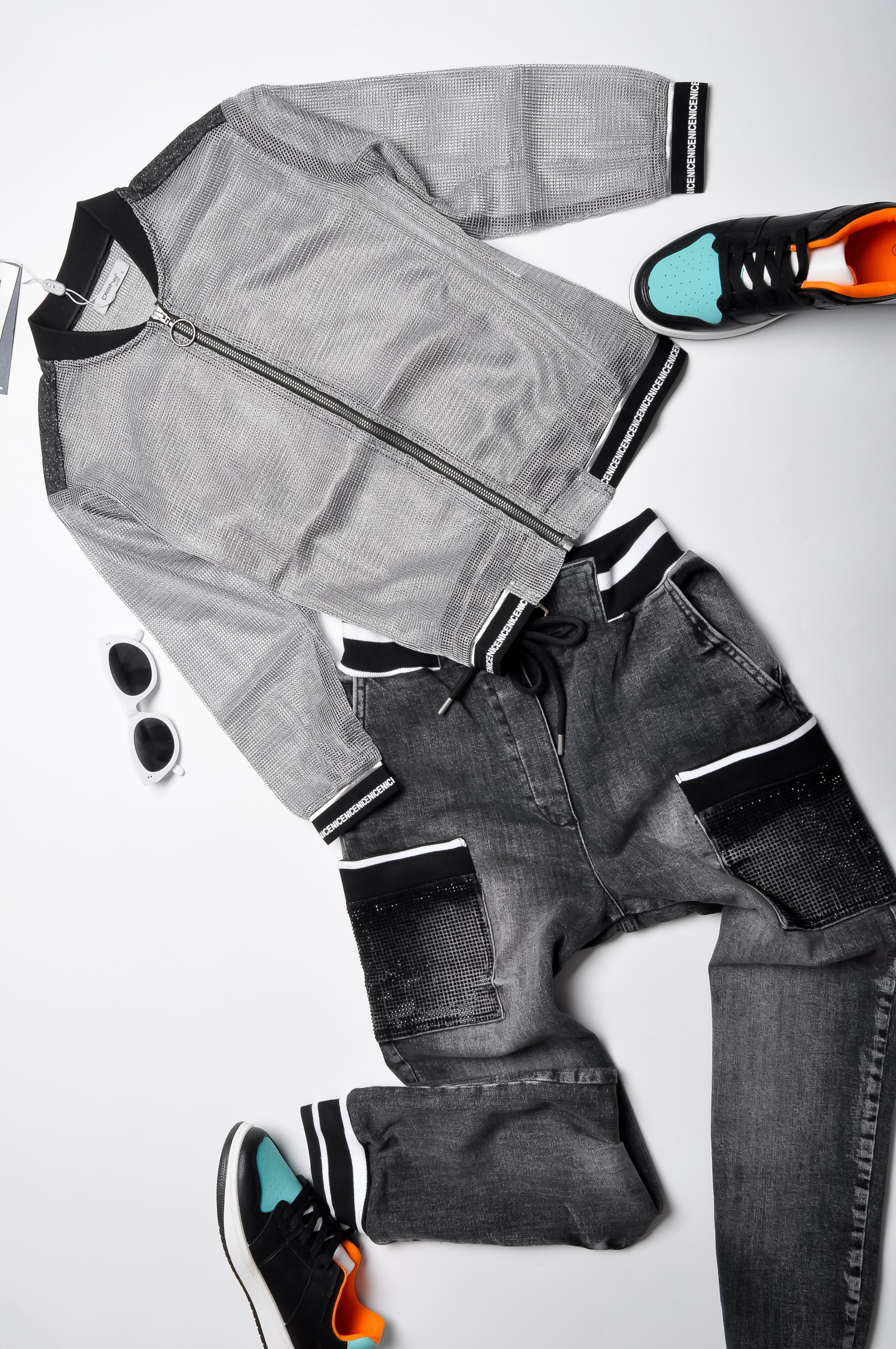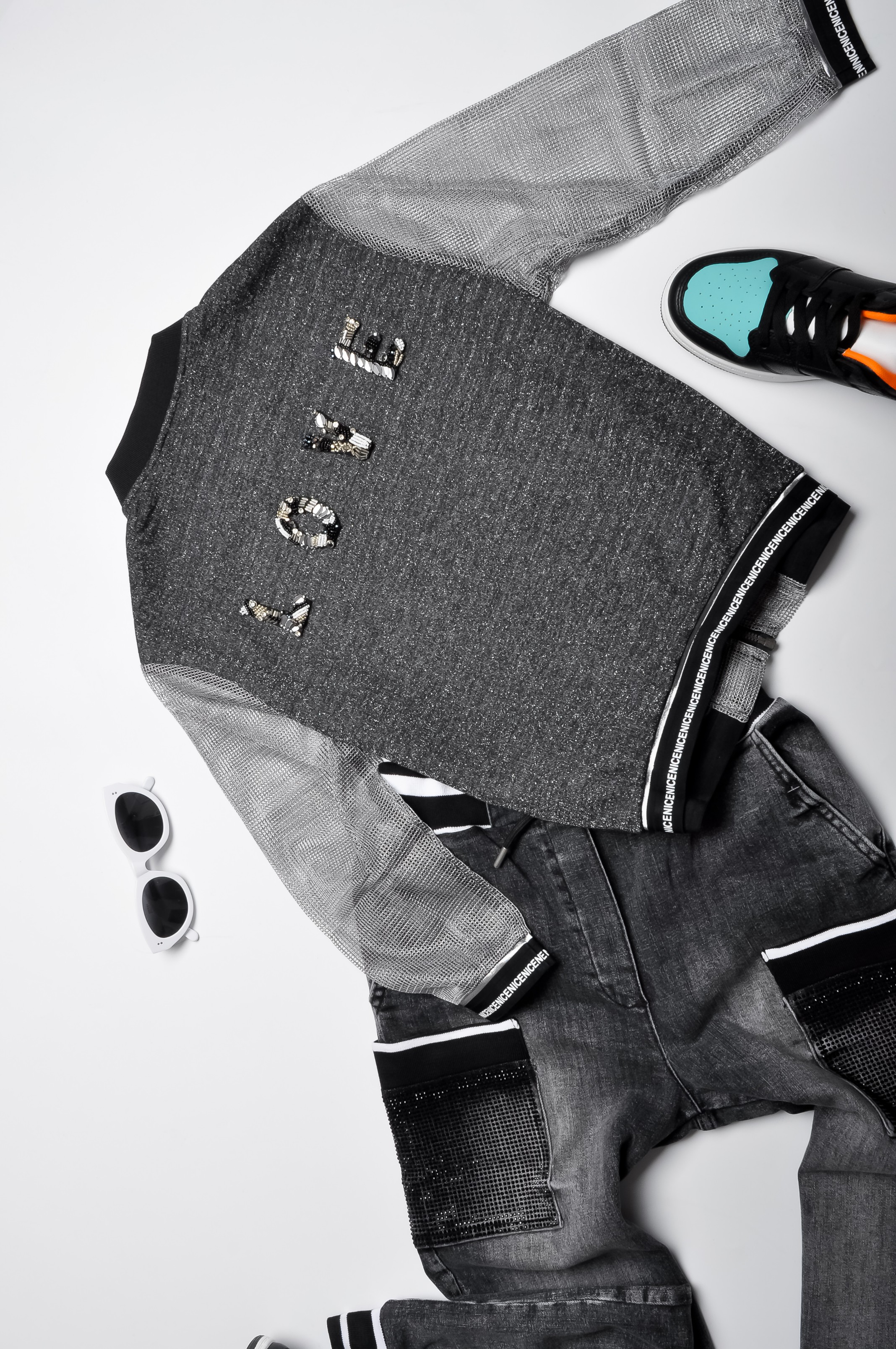 Bluza o fasonie swobodnym, w kolorze srebrnym, zapinana na zamek. Przód i rękawy siateczkowe, zakończone ściągaczami. Tył materiałowy, zdobiony błyszczącymi nićmi i cyrkoniowym napisem. Rękawy 3/4.