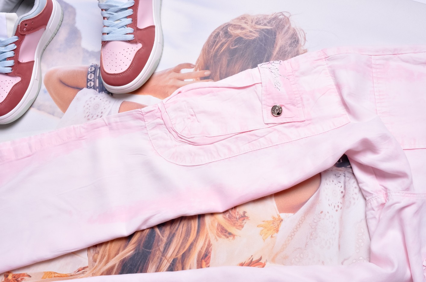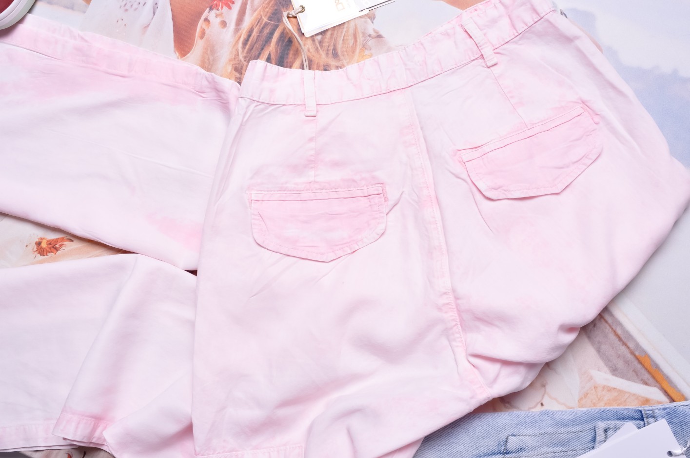 Różowe spodnie o luźnym fasonie z szeroką nogawką. Dwie kieszenie wyżej i dwie niżej, jedna z nich zdobiona cyrkoniowym logo. Stan spodni wysoki. Spodnie zapinane na guzik i suwak. Po bokach nogawek rozcięcia.