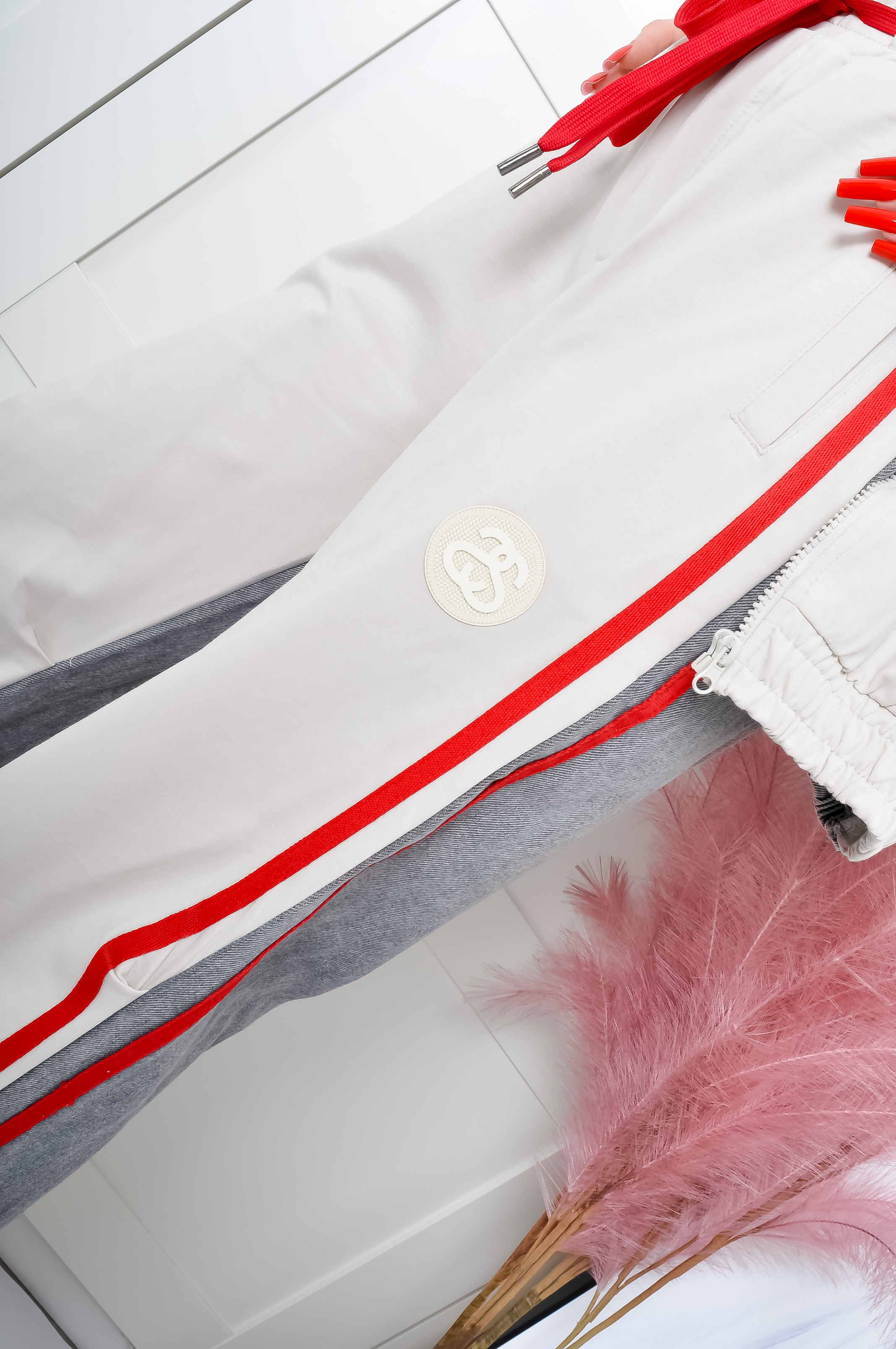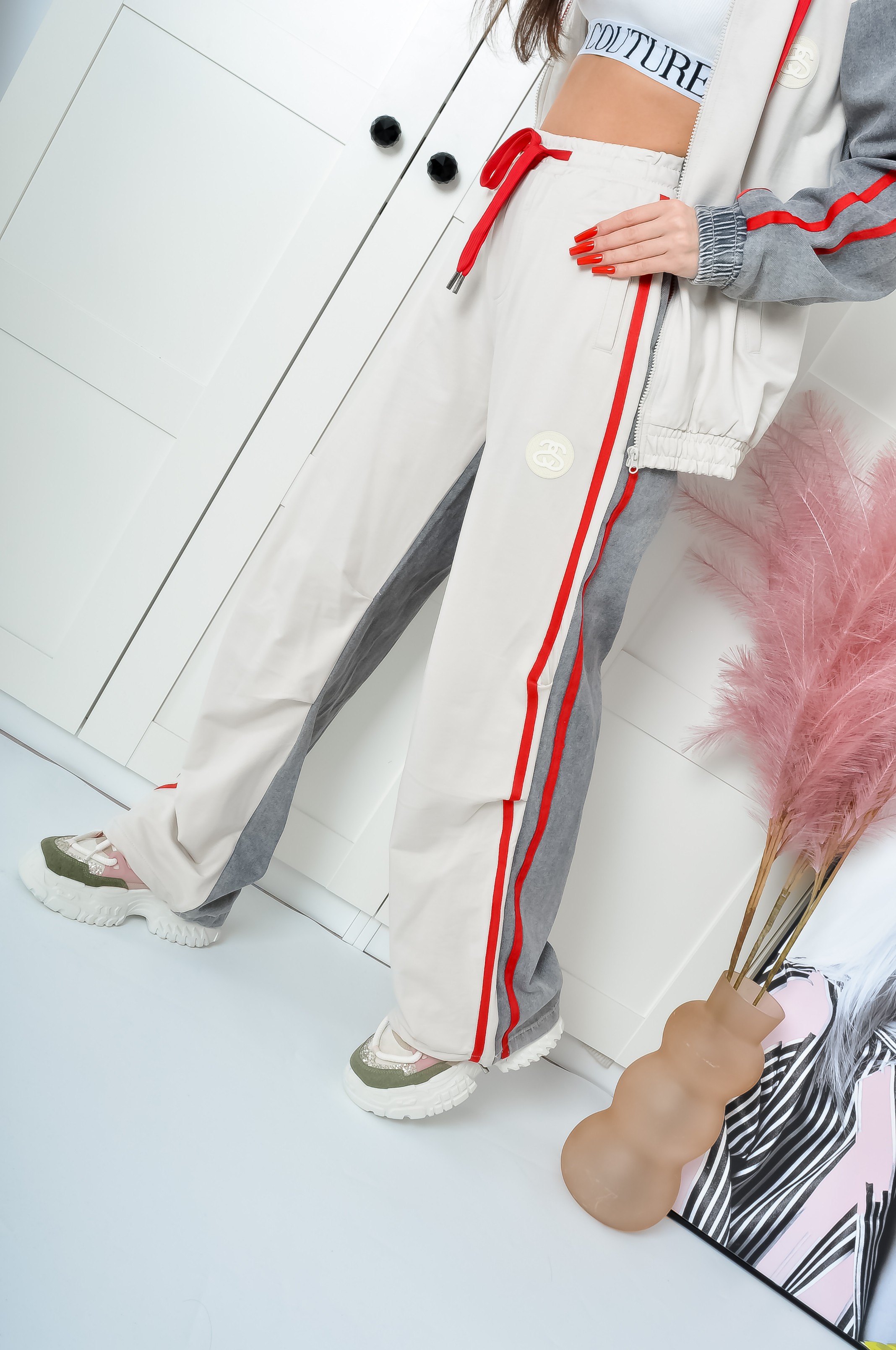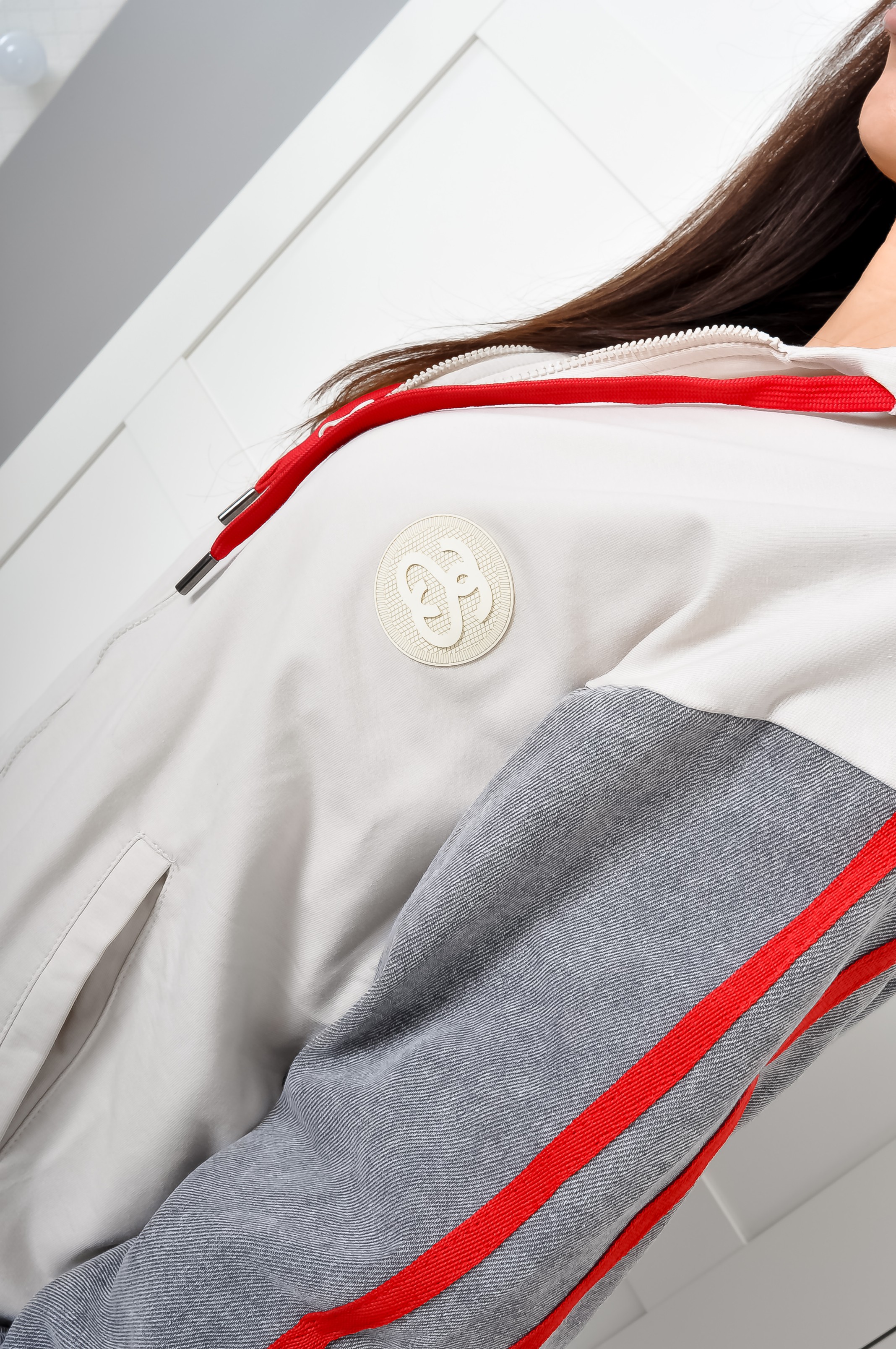 Komplet z miękkiej dzianiny w beżowym kolorze. Góra o prostym kroju z długimi rękawami, zapinana na zamek, model lekko przylegający. Przód i kaptur - dzianinowy. Tył i rękawy - szary jeans. Z boku rękawów czerwone lampasy, podobnie jak sznurki od kaptura. Spodnie z gumką w talii z dopasowanymi nogawkami. U dołu ściągacze. Materiał lekko elastyczny. Wysoki stan.