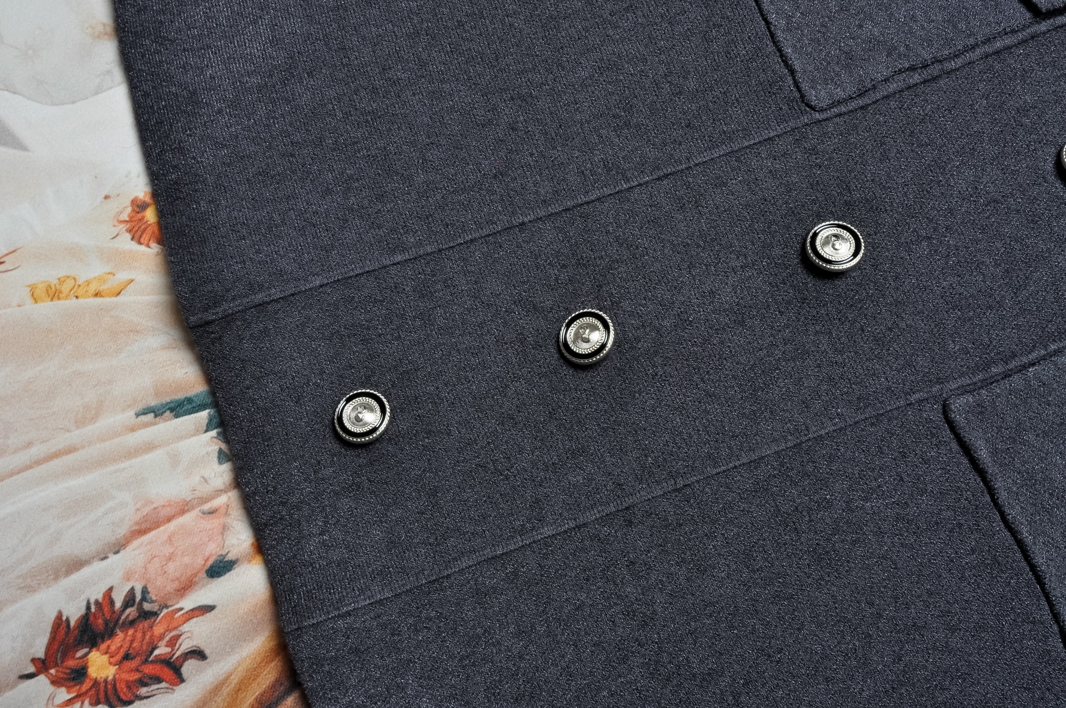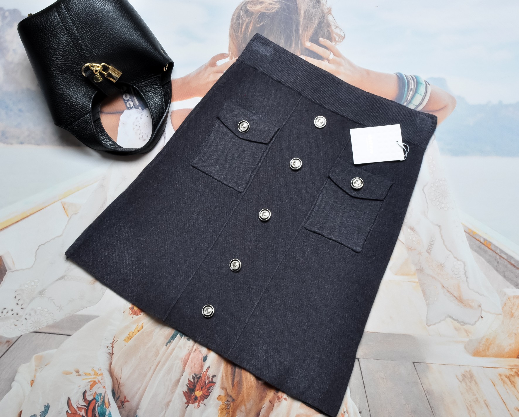 Dzianinowa spódnica w kolorze szarym. Pięknie podkreśla sylwetkę. Na grubej gumce z przeszyciem. Z przodu dwie kieszonki i guziczki.