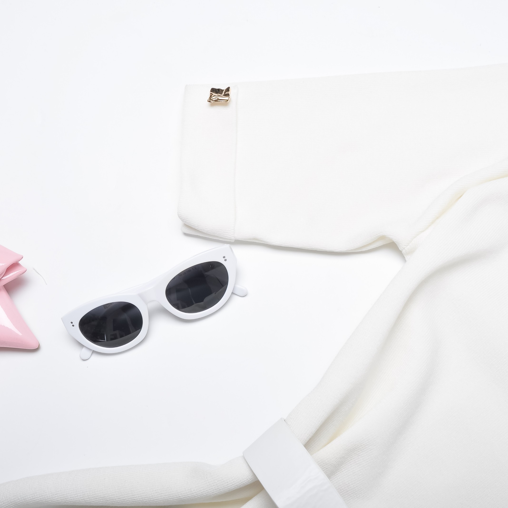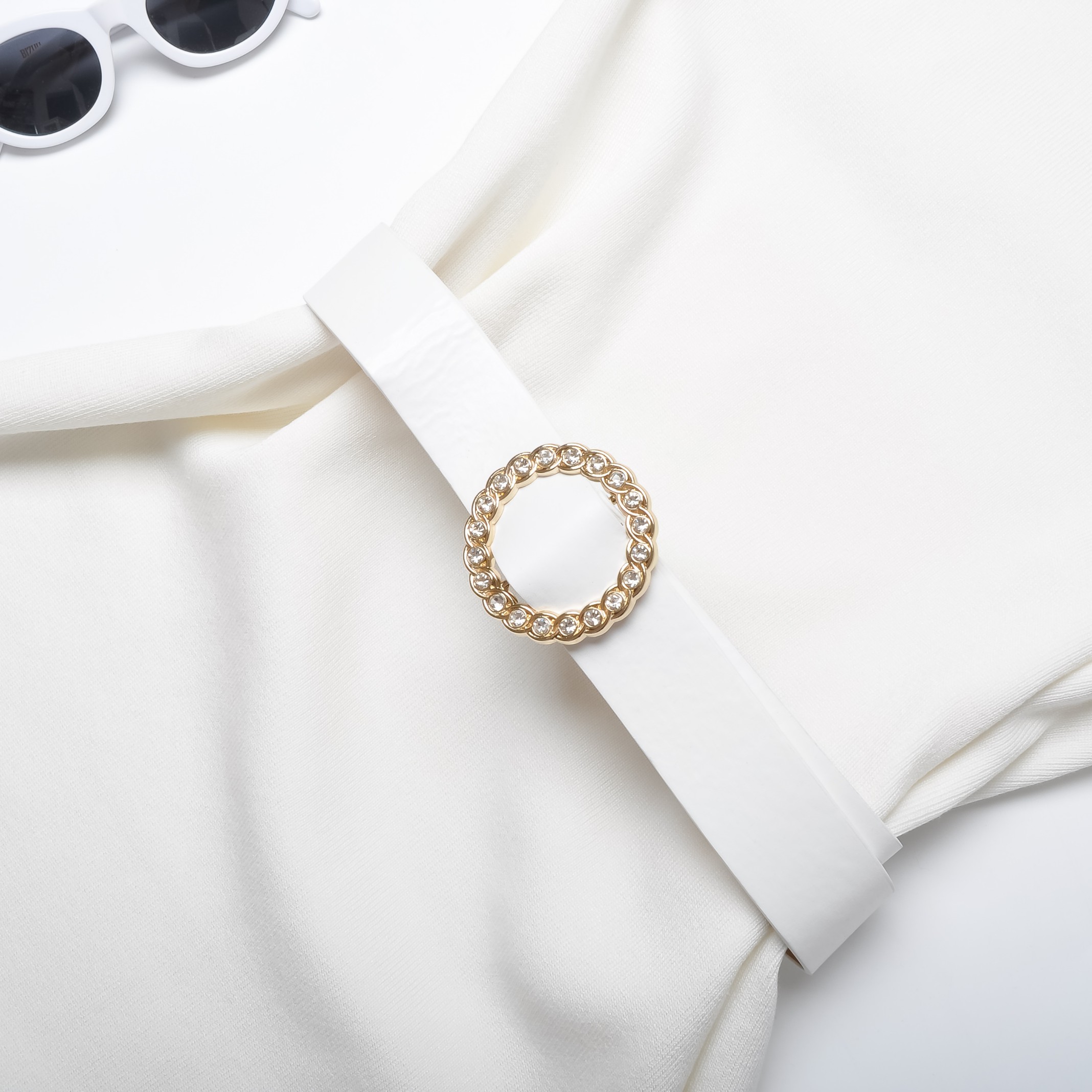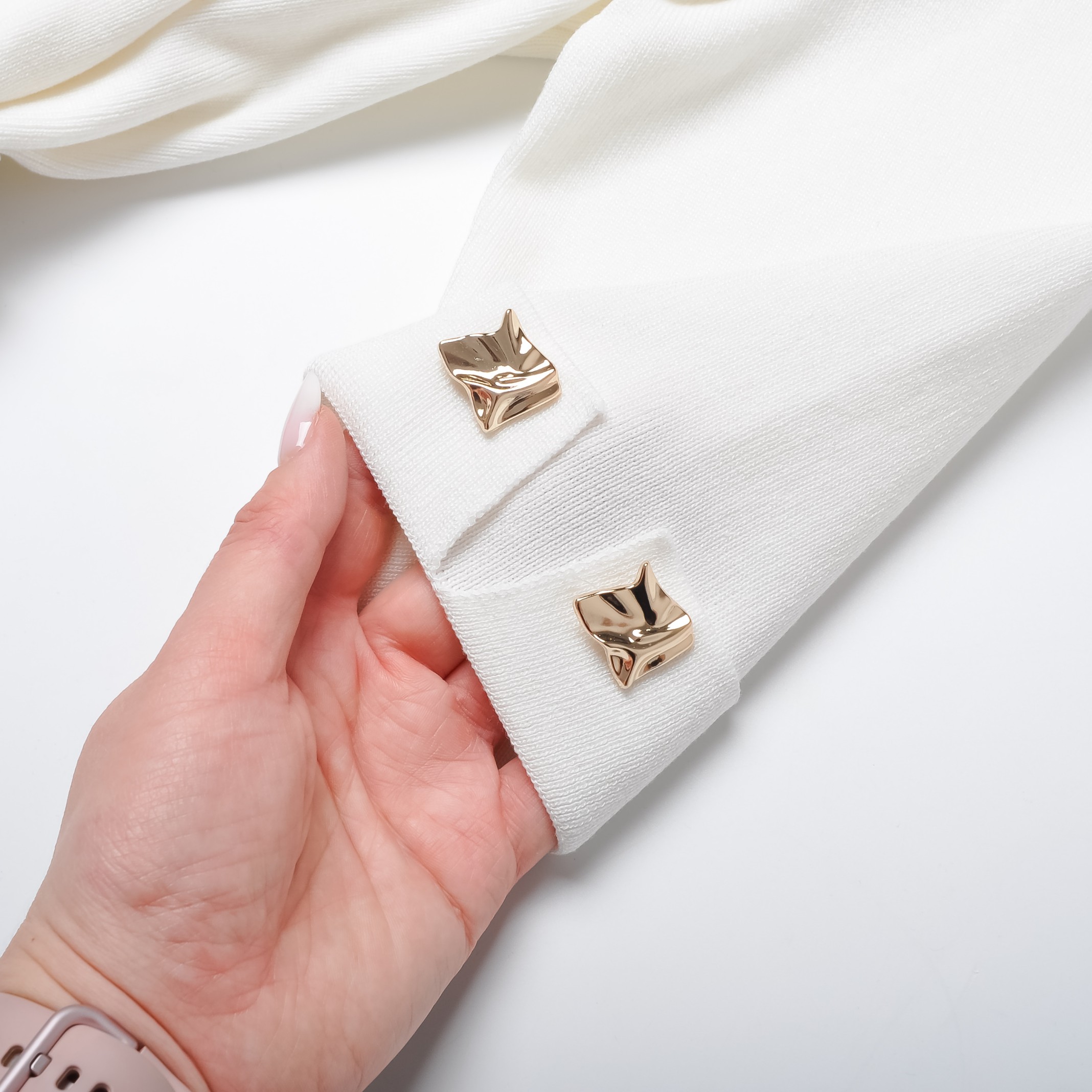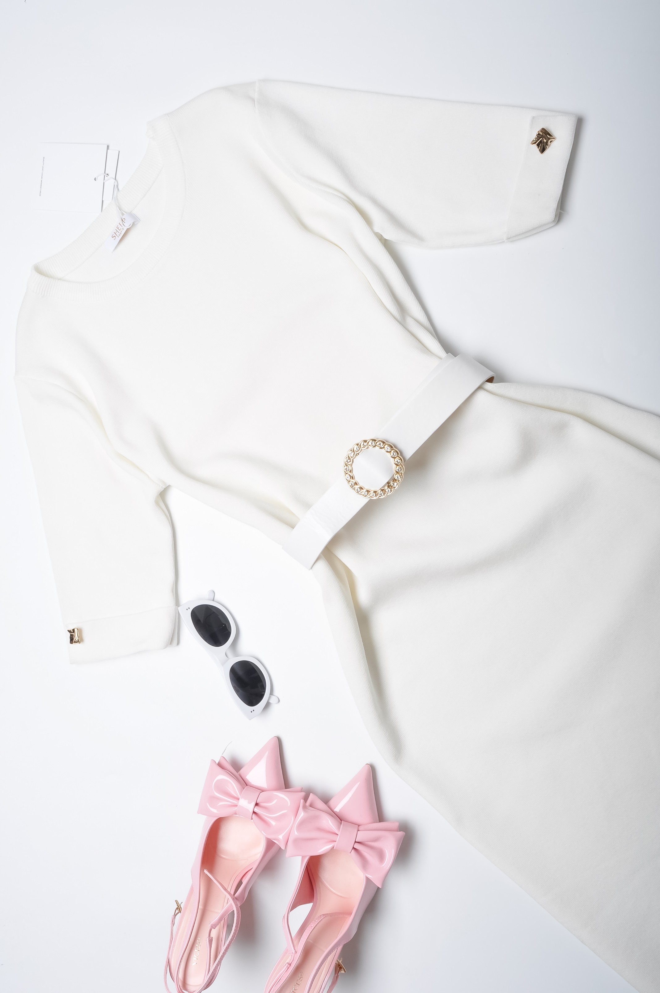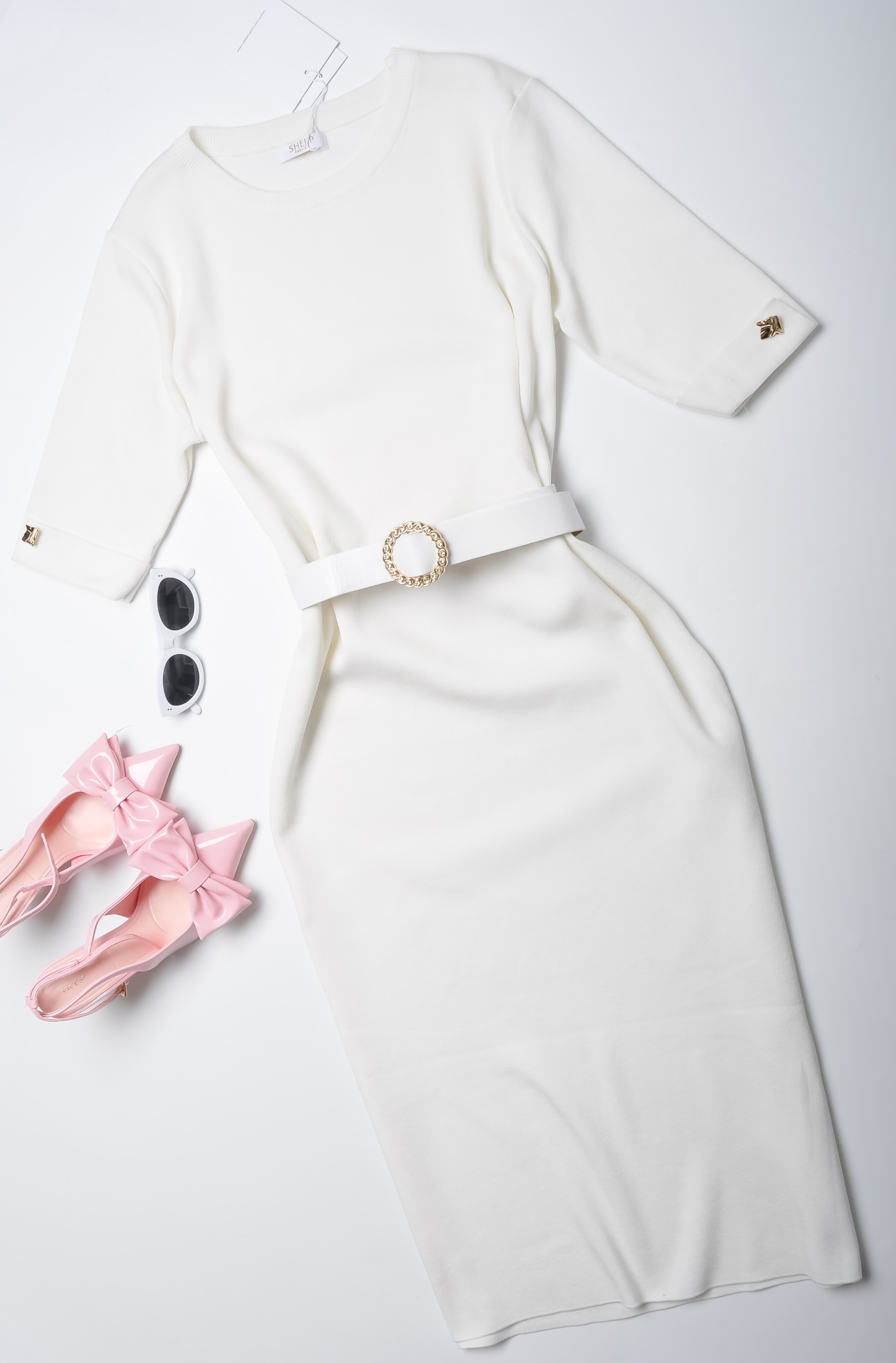 Dzianinowa sukienka w odcieniu ecru. Wkładana przez głowę, prosty krój, midi. Rękawy krótkie, podwijane, wykończone złotymi guziczkami. Do zestawu ozdobny paseczek wykończony złotą klamrą z cyrkoniami.