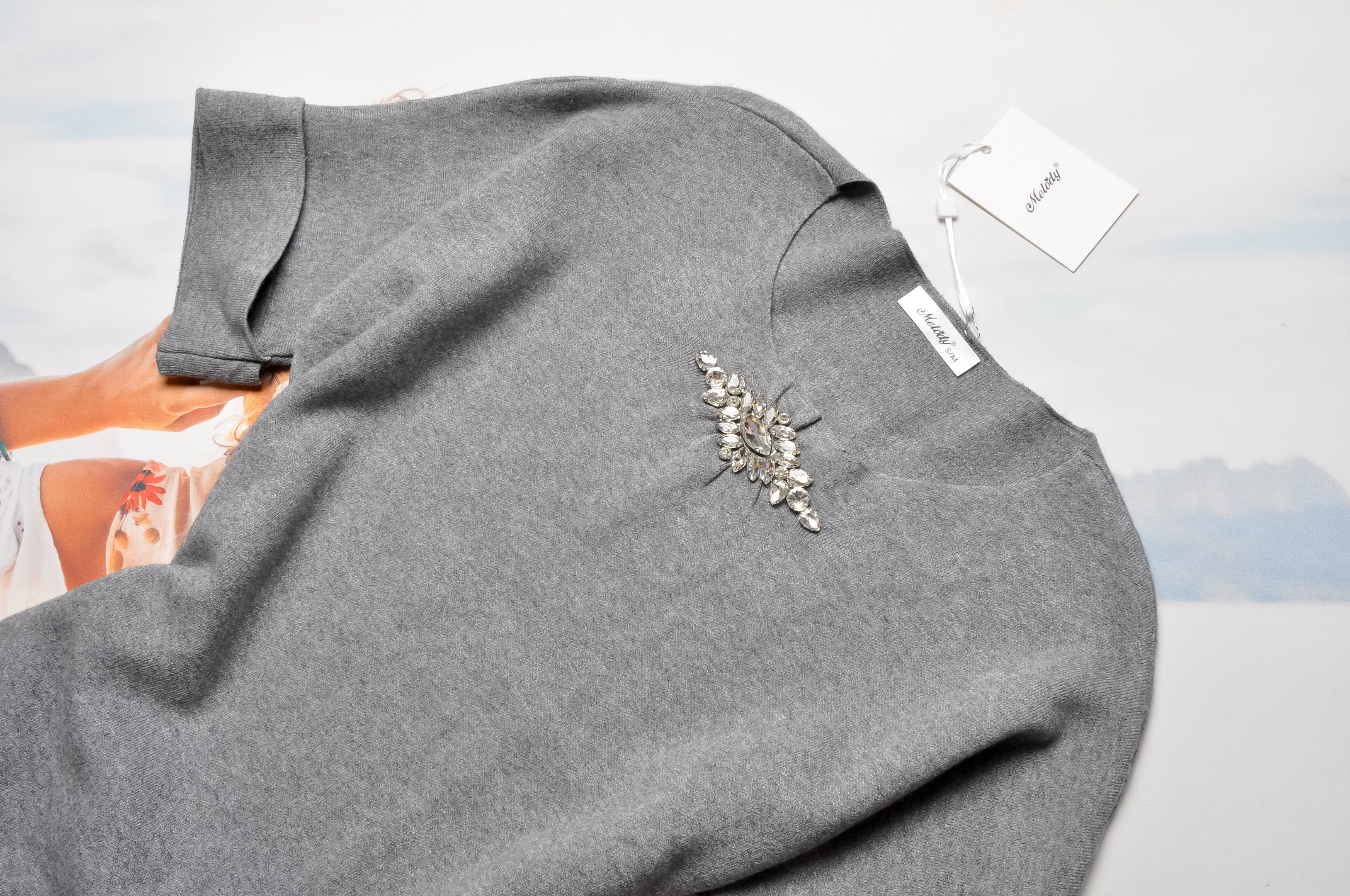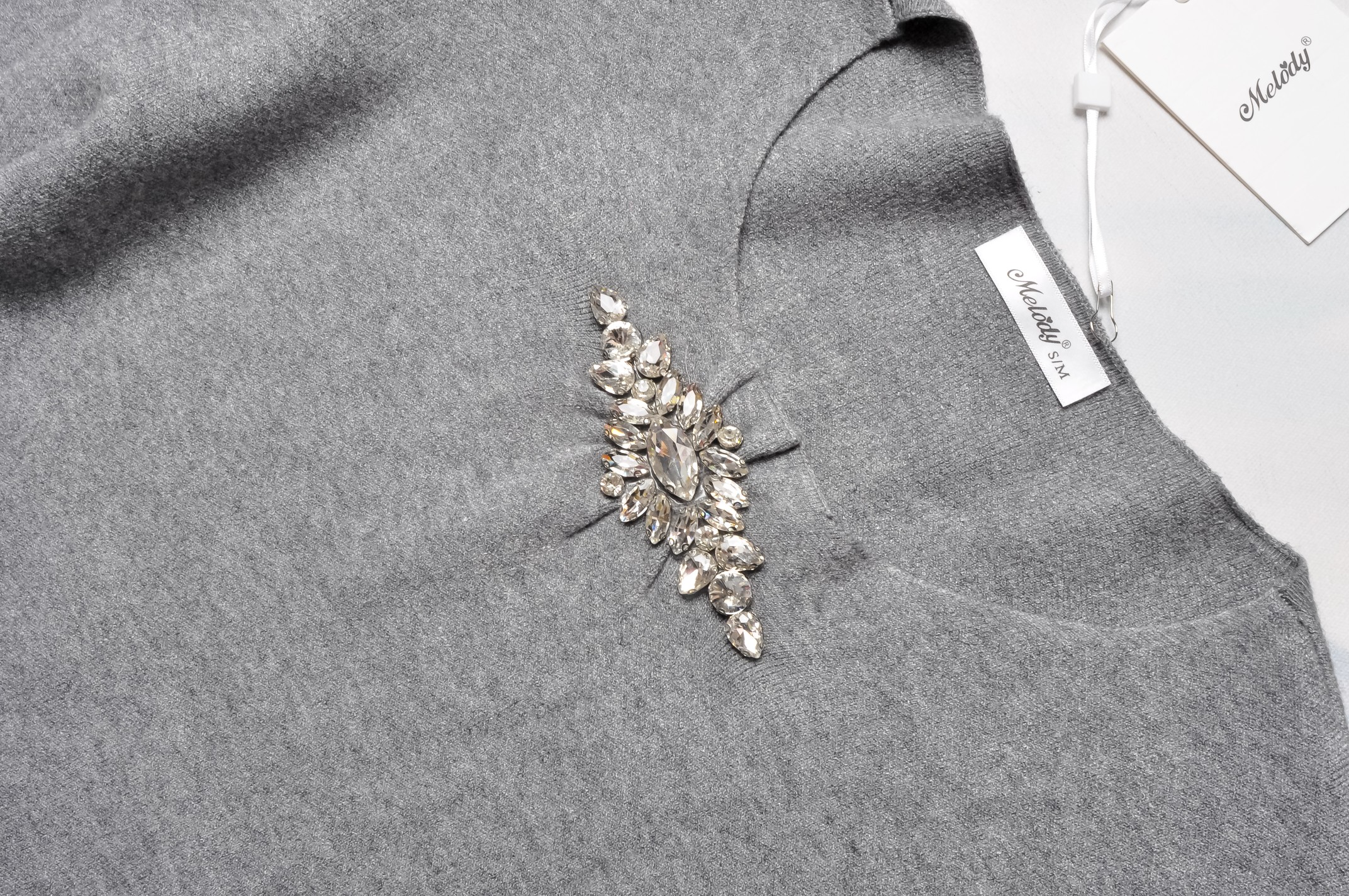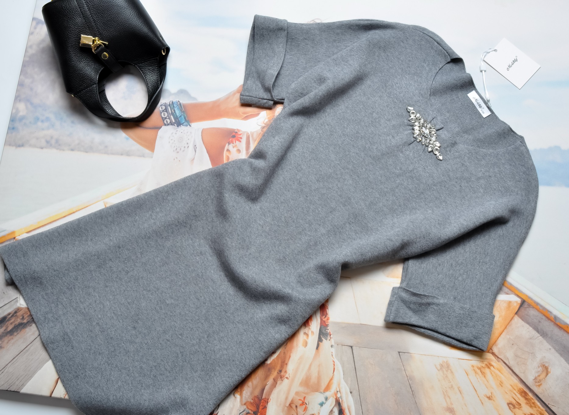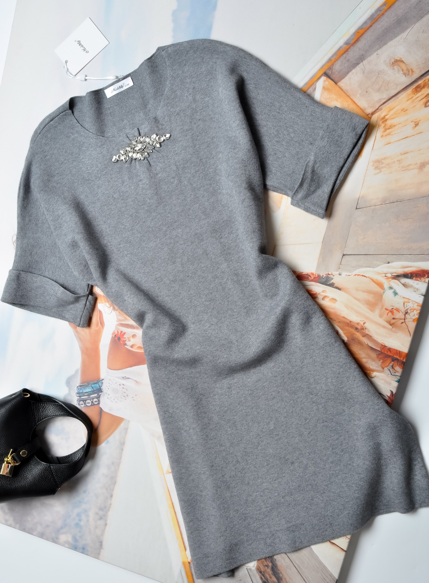 DZIANINOWA SUKIENKA W SZARYM KOLORZE Z CYRKONIOWĄ APLIKACJĄ