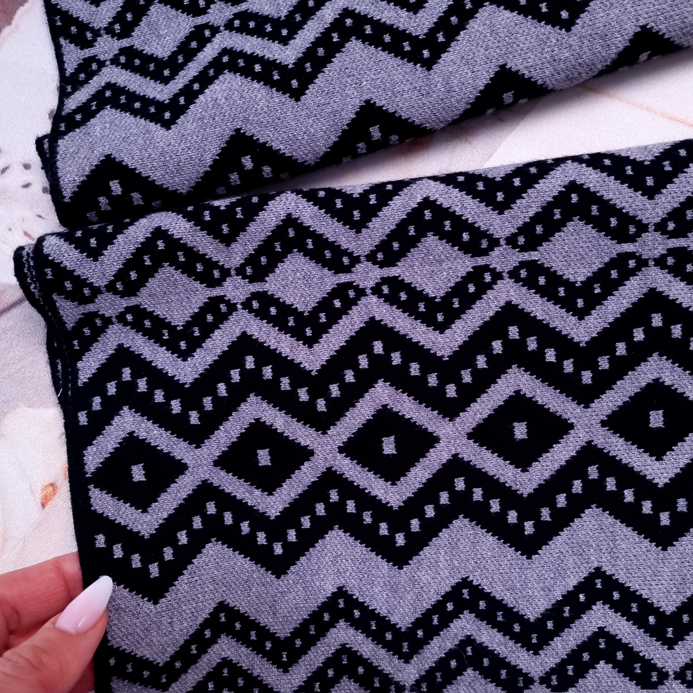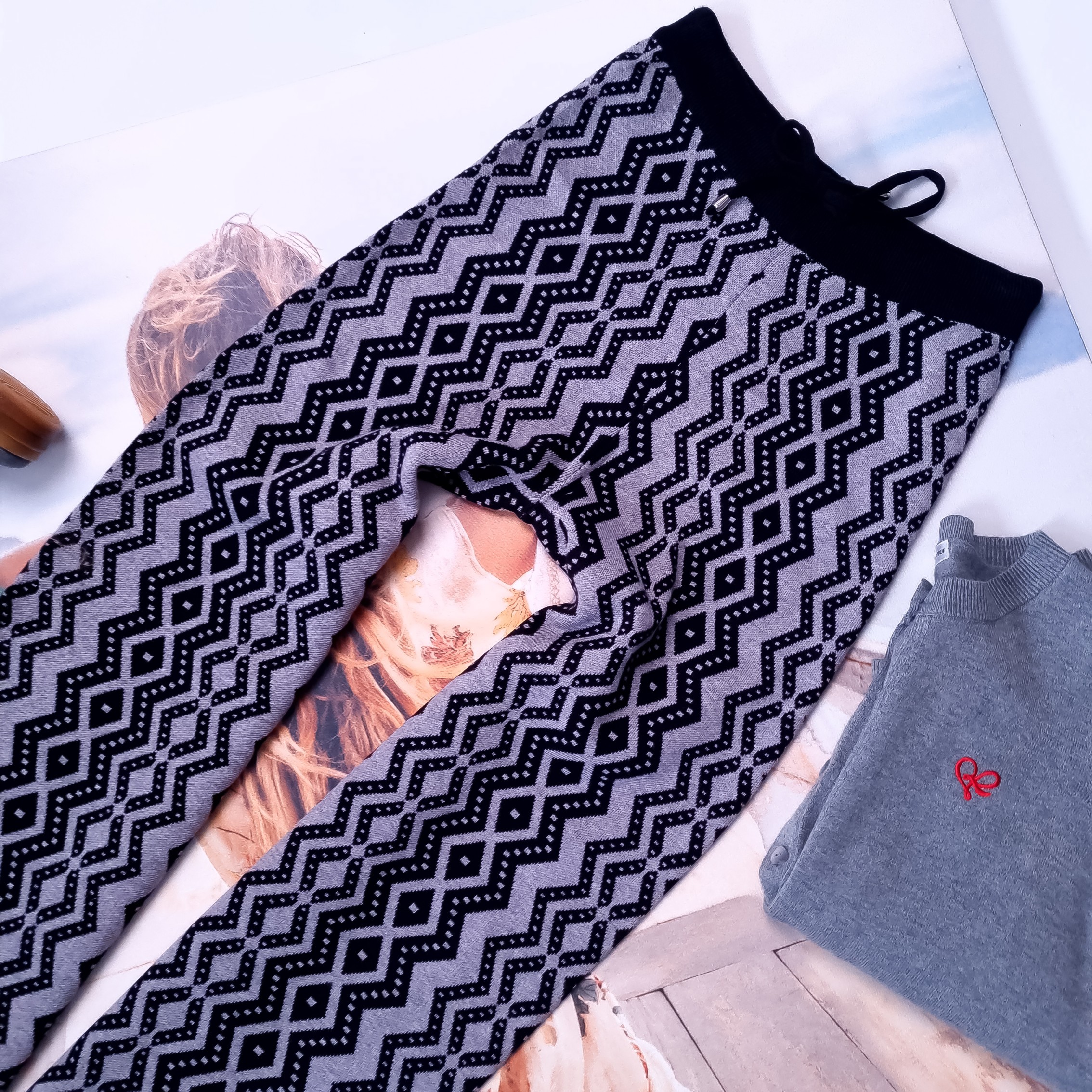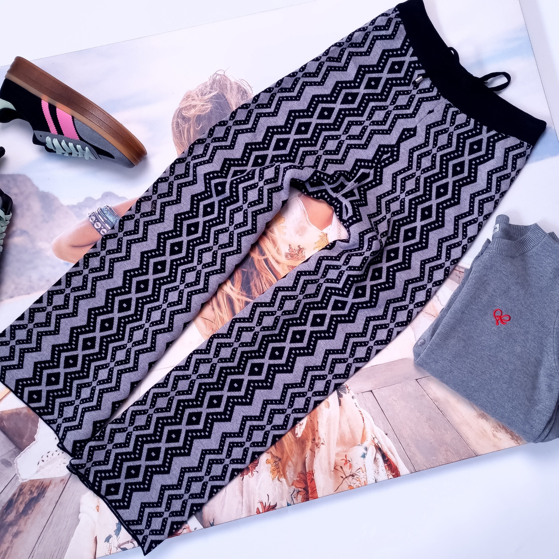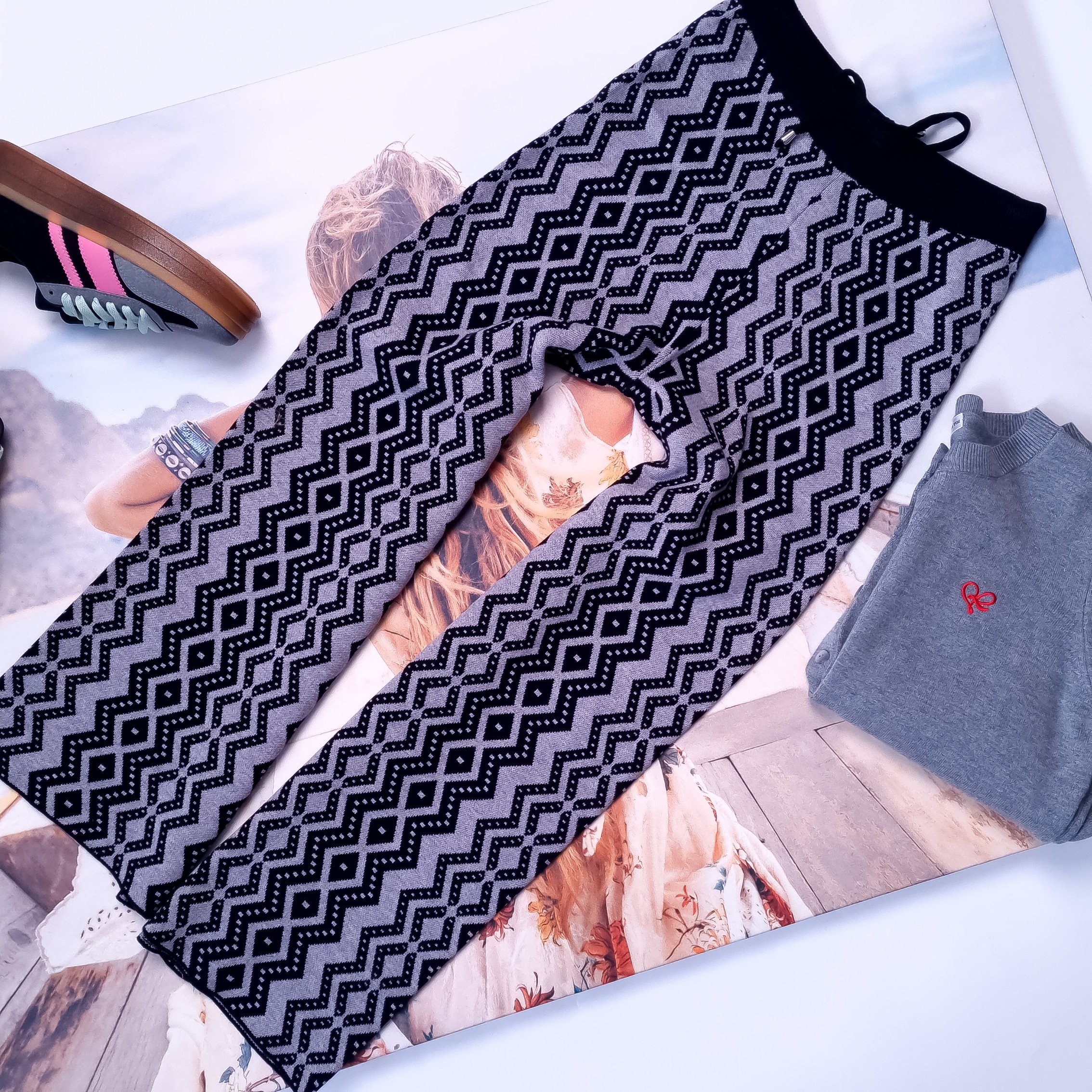 Długie dzianinowe spodnie w szarym kolorze wyszywane czarnymi wzorami. Gruba gumka w pasie, nogawki nieprzylegające. Materiał elastyczny.