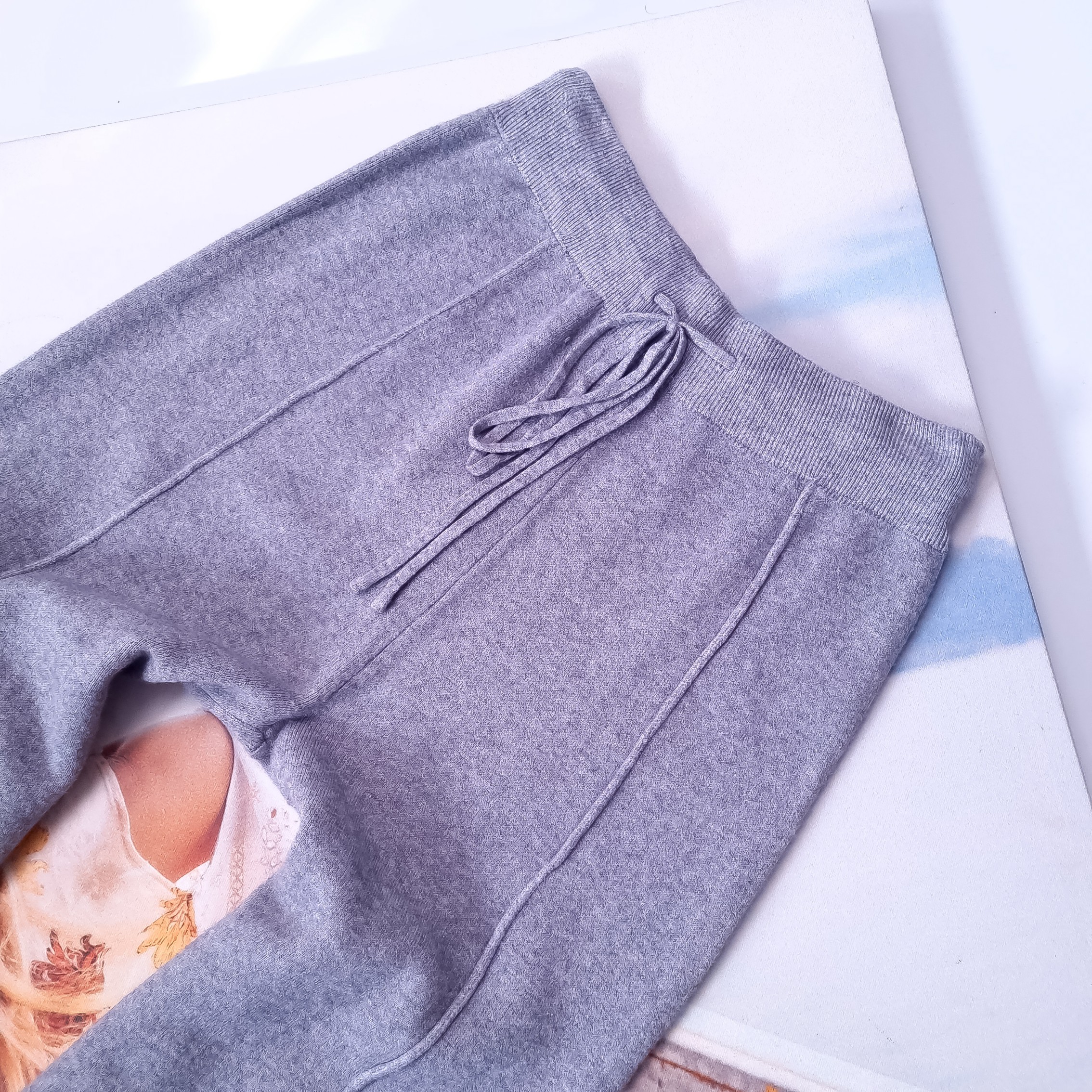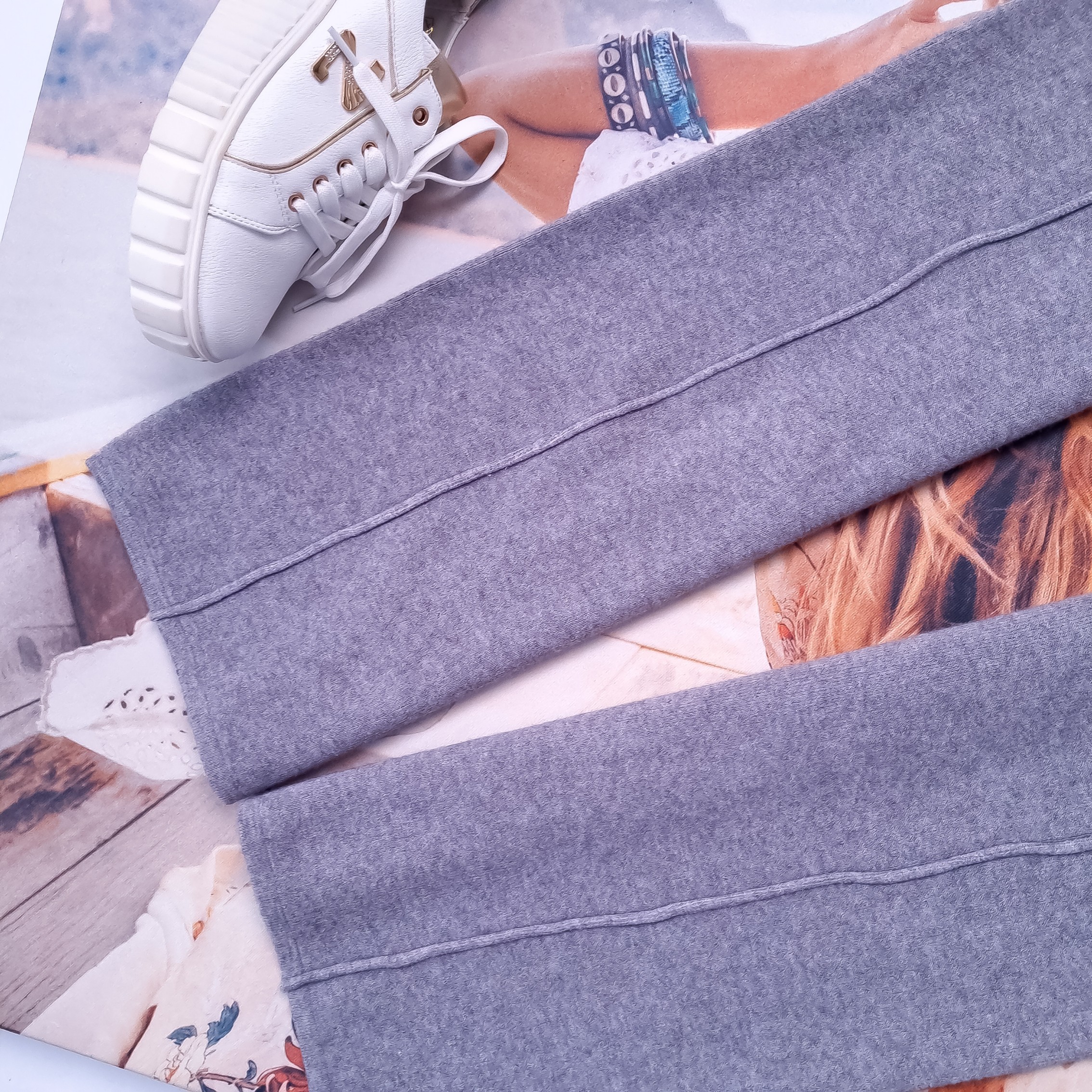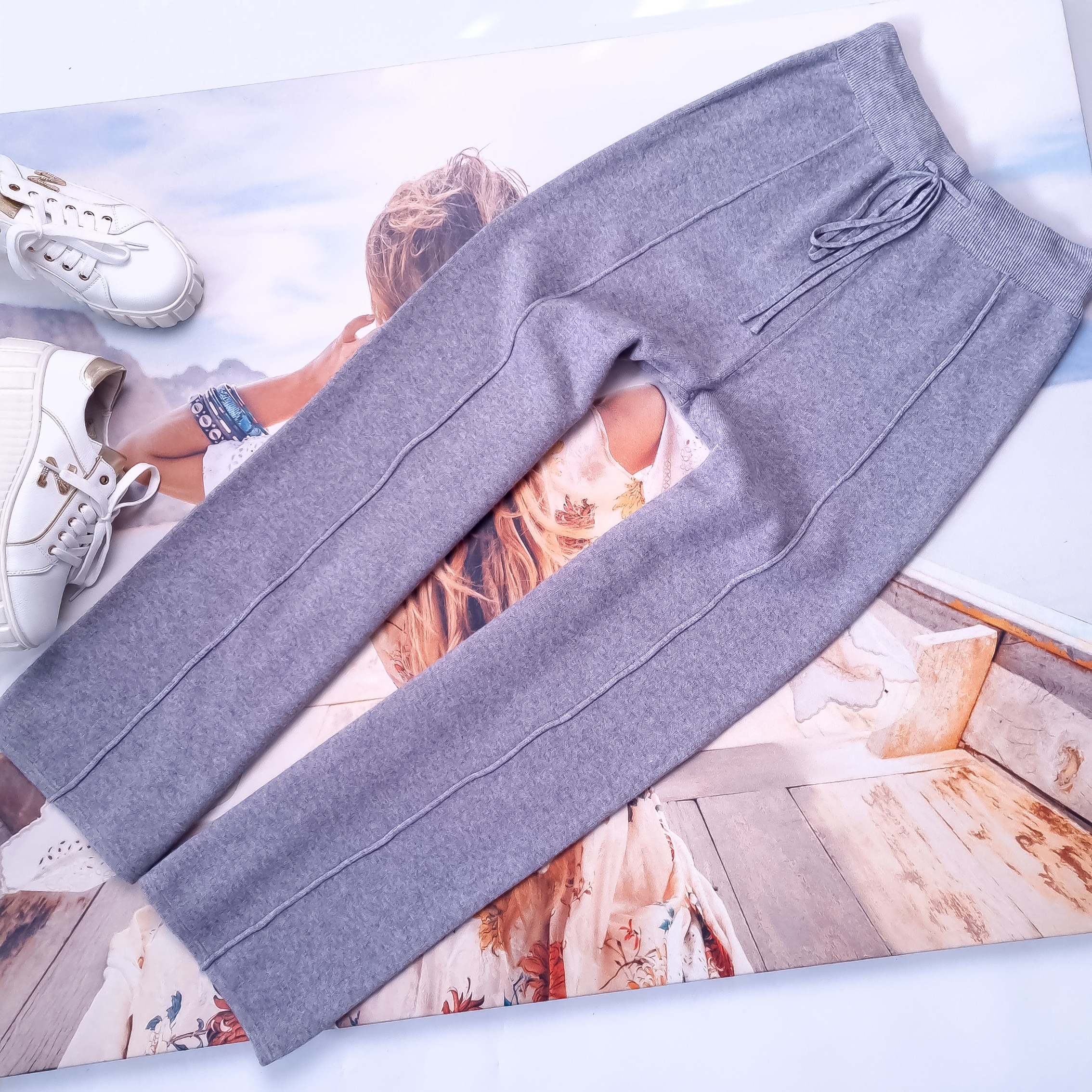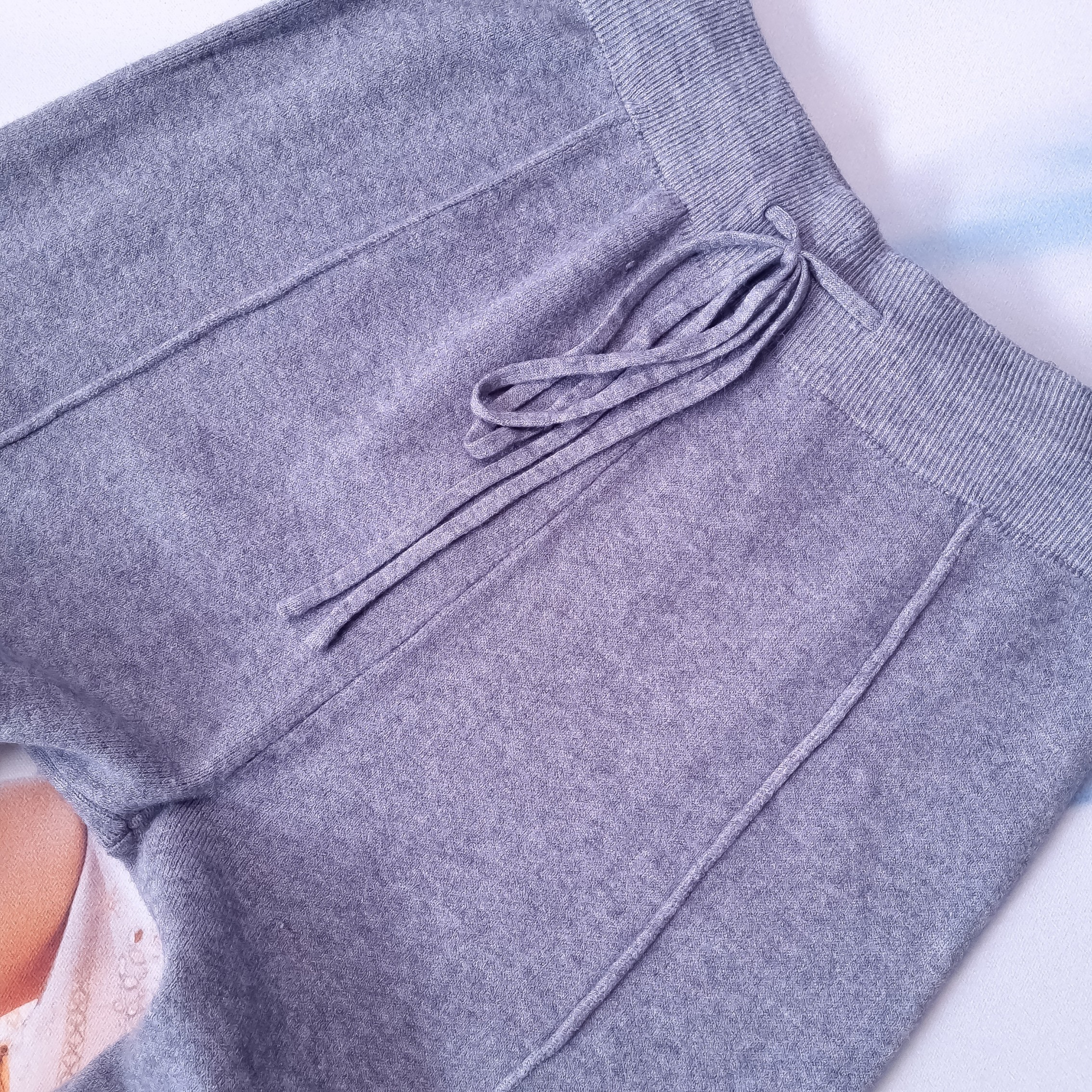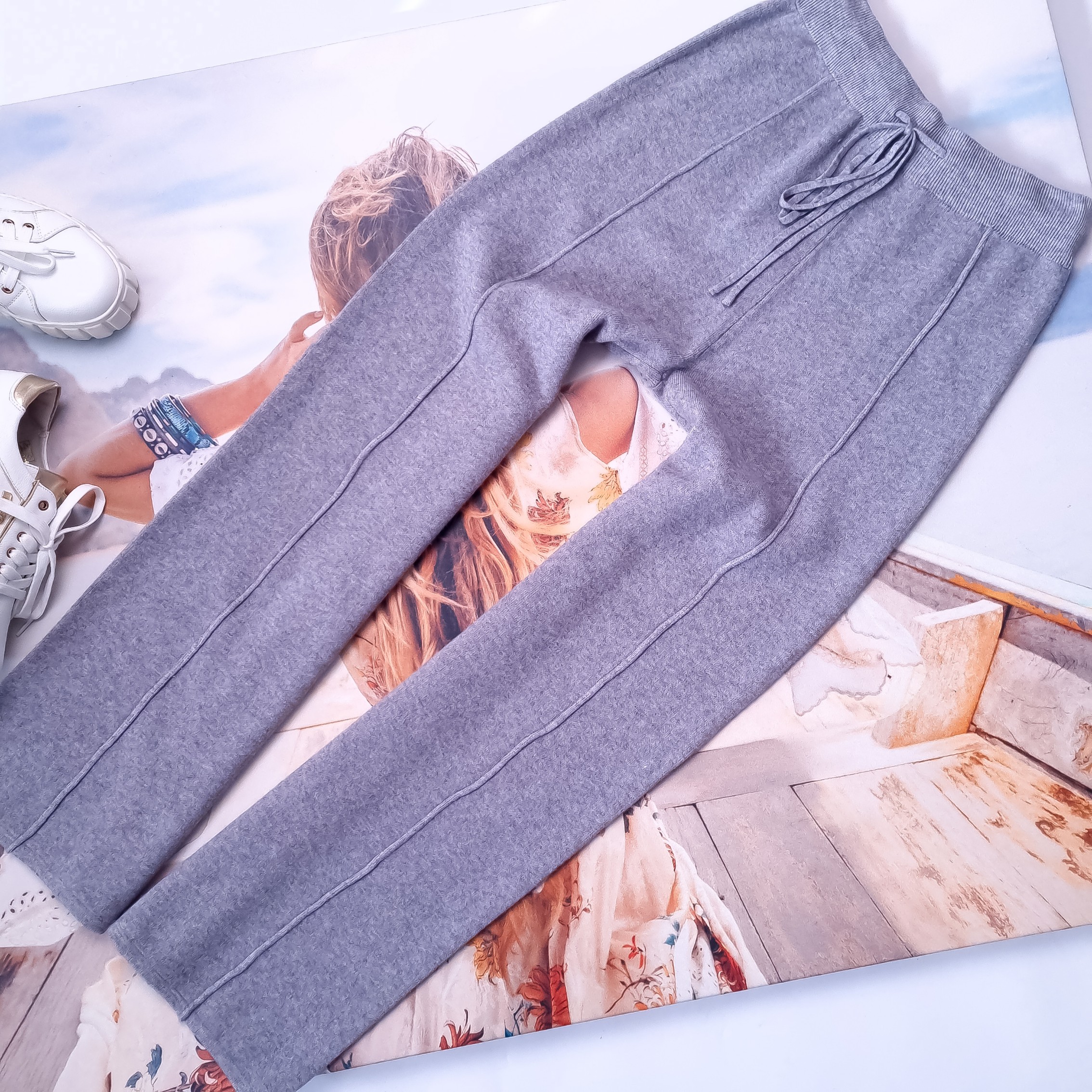 Długie dzianinowe spodnie w szarym klasycznym odcieniu o prostej nogawce. Wysoki stan. Gruba gumka w pasie z dodatkowym sznurkiem. Materiał lekko elastyczny. Brak zdobień. Brak kieszeni.