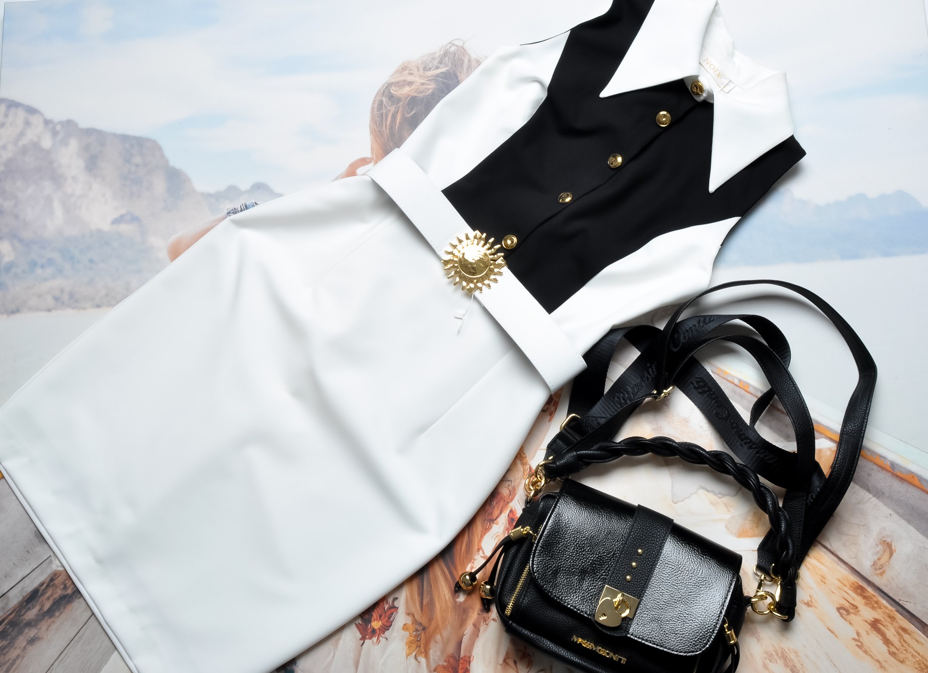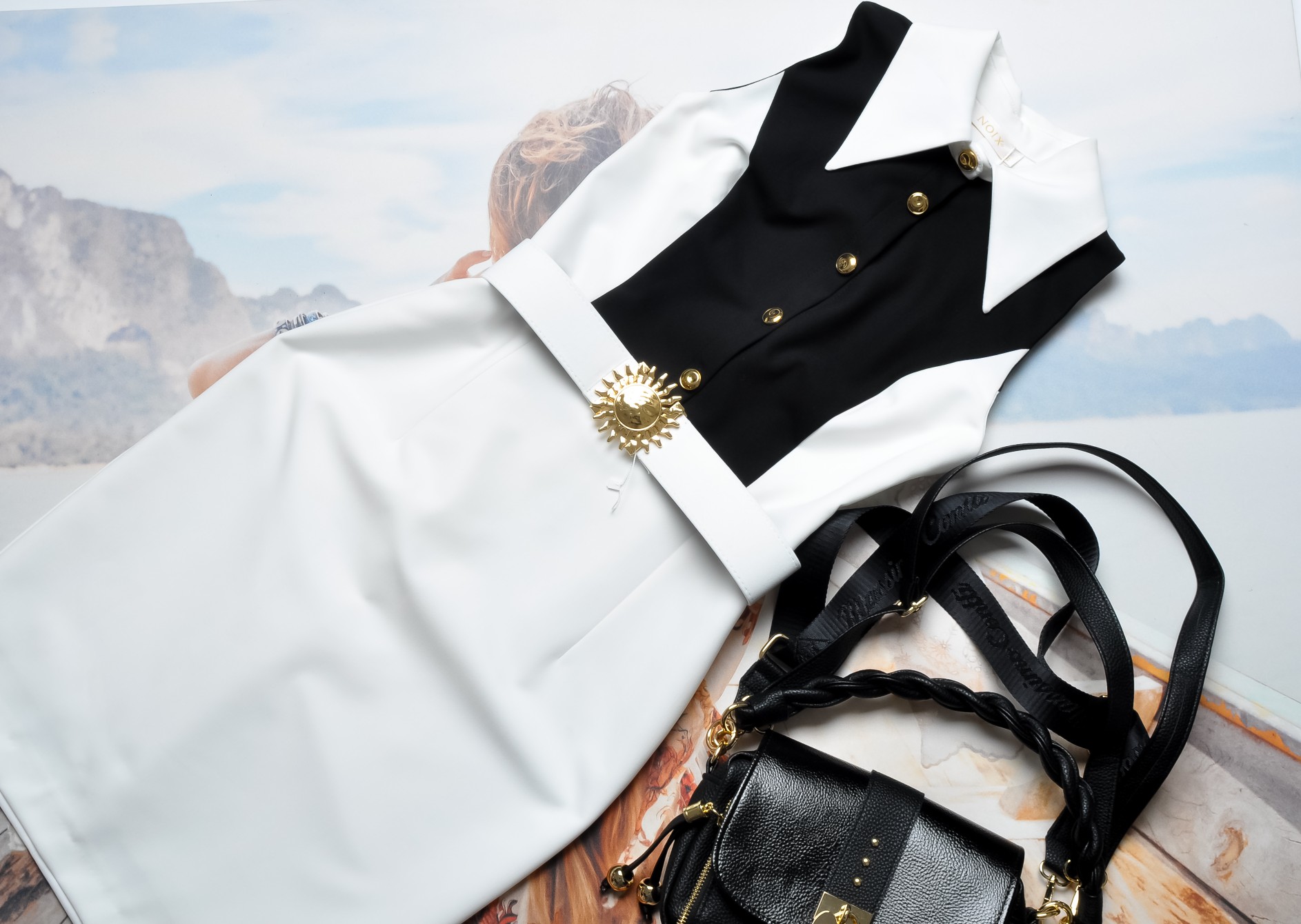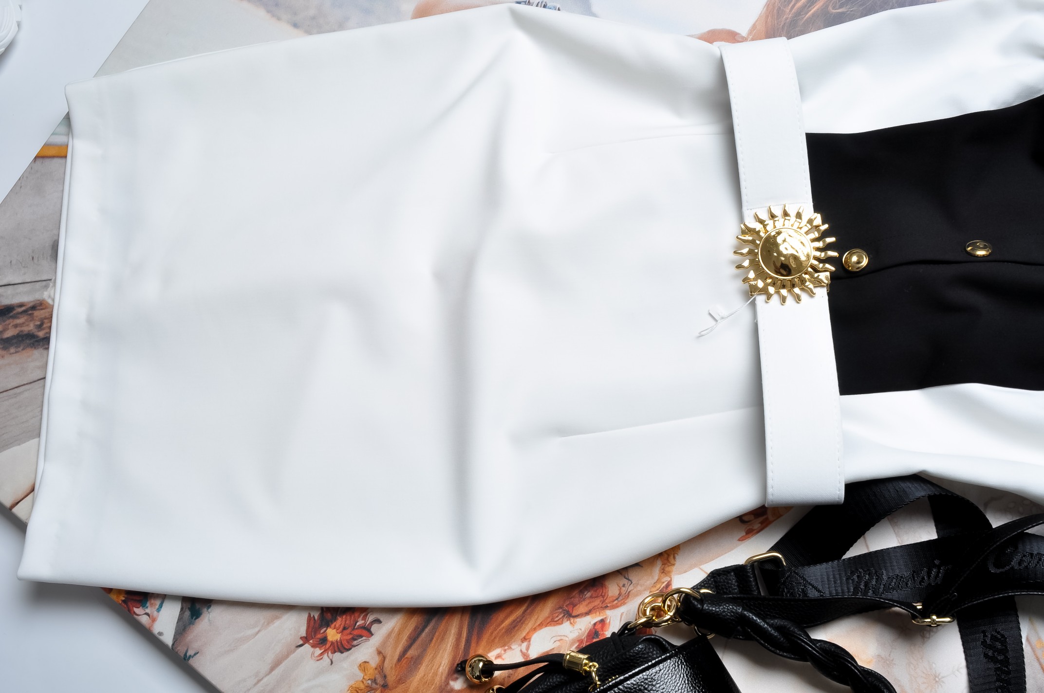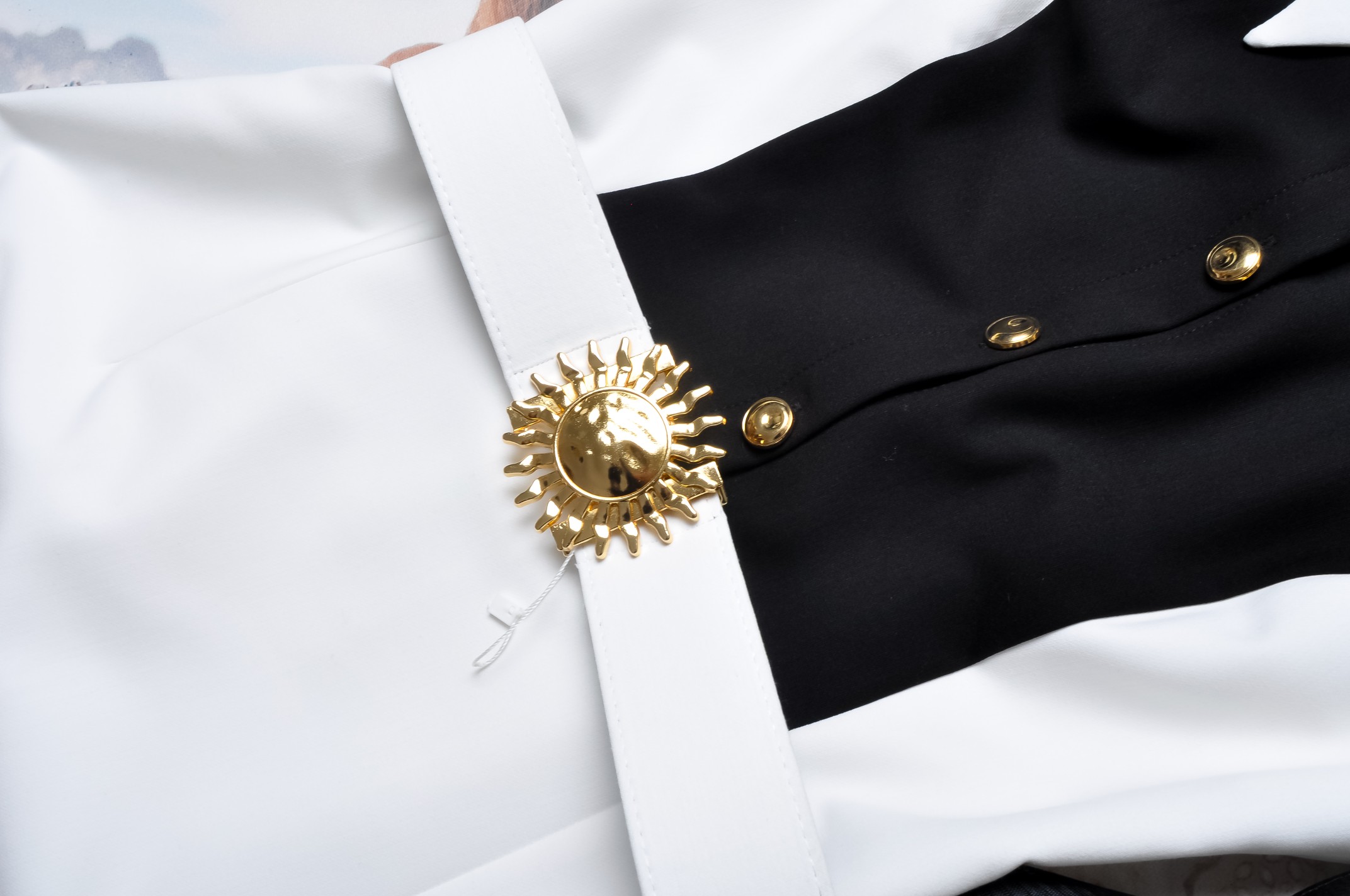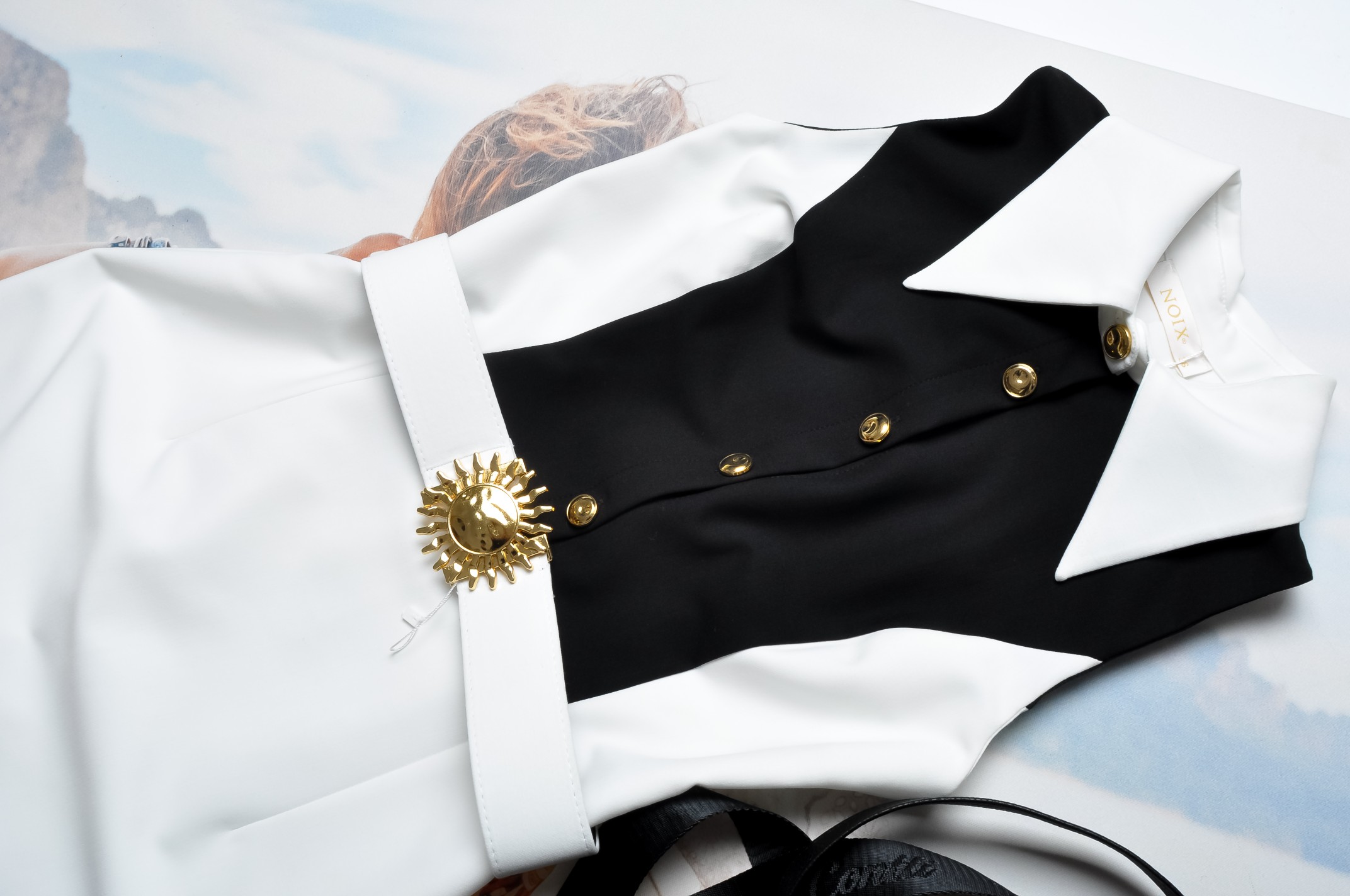 Sukienka do kolan w białym kolorze. Przód czarny, zapinany na złote guziki. Bez rękawów. Wykończona białym kołnierzem. Wyszywana dodatkową podszewką w białym kolorze. Do zestawu pasek z klamrą w motywie słońca. Zapinana na zamek, który jest z tyłu sukienki.